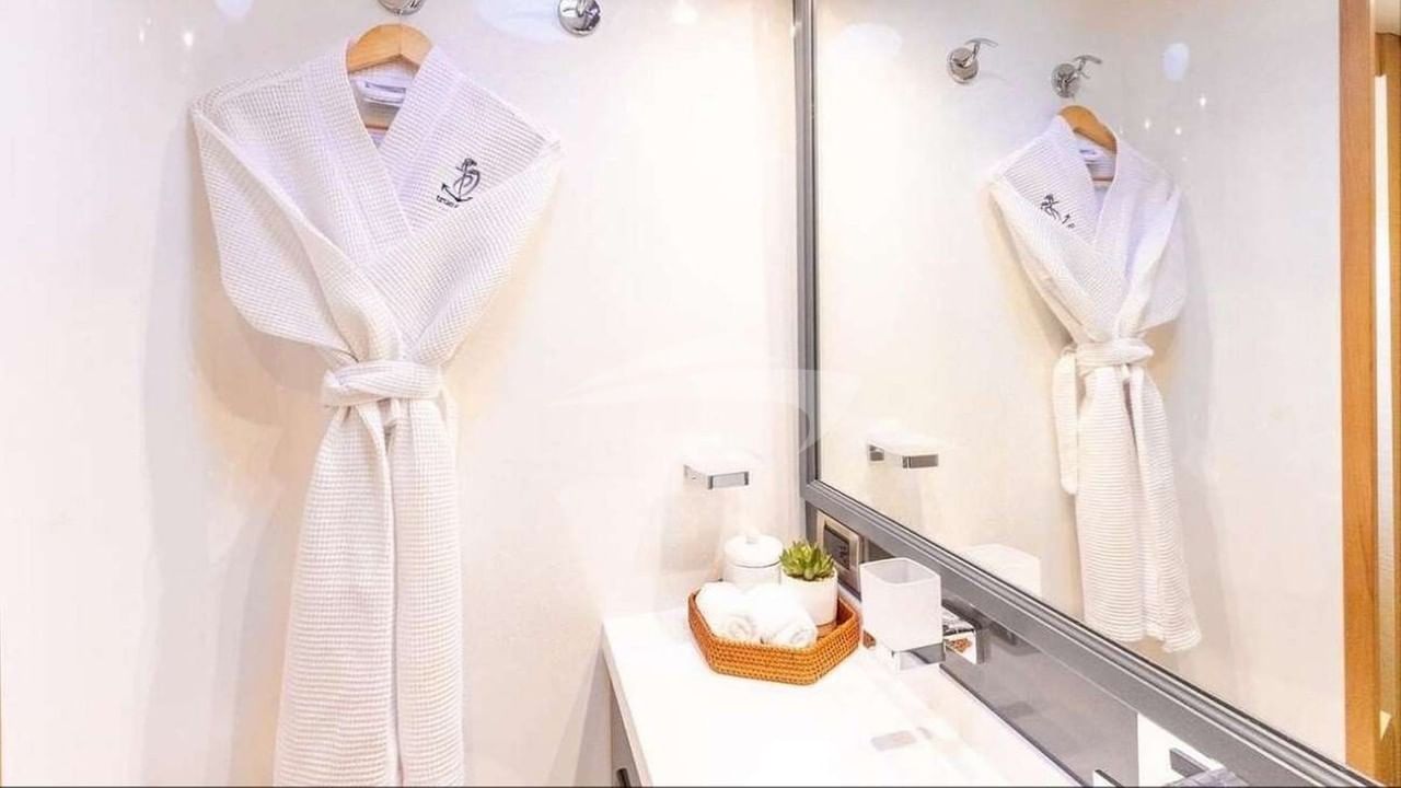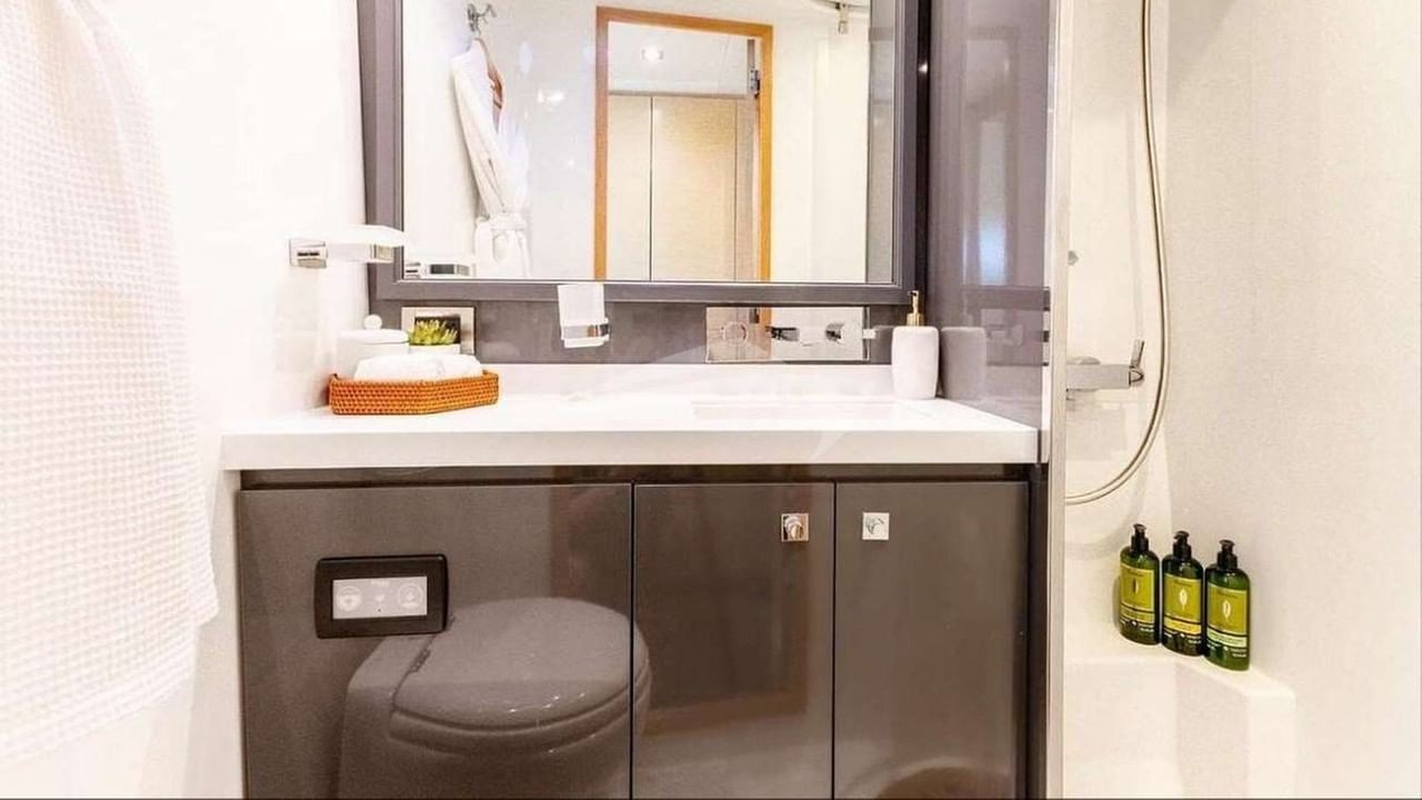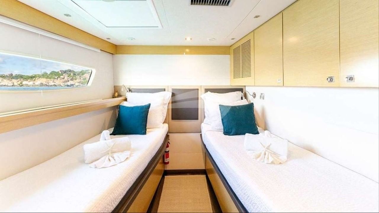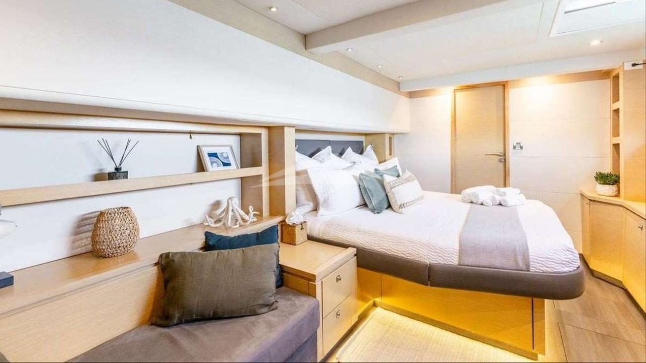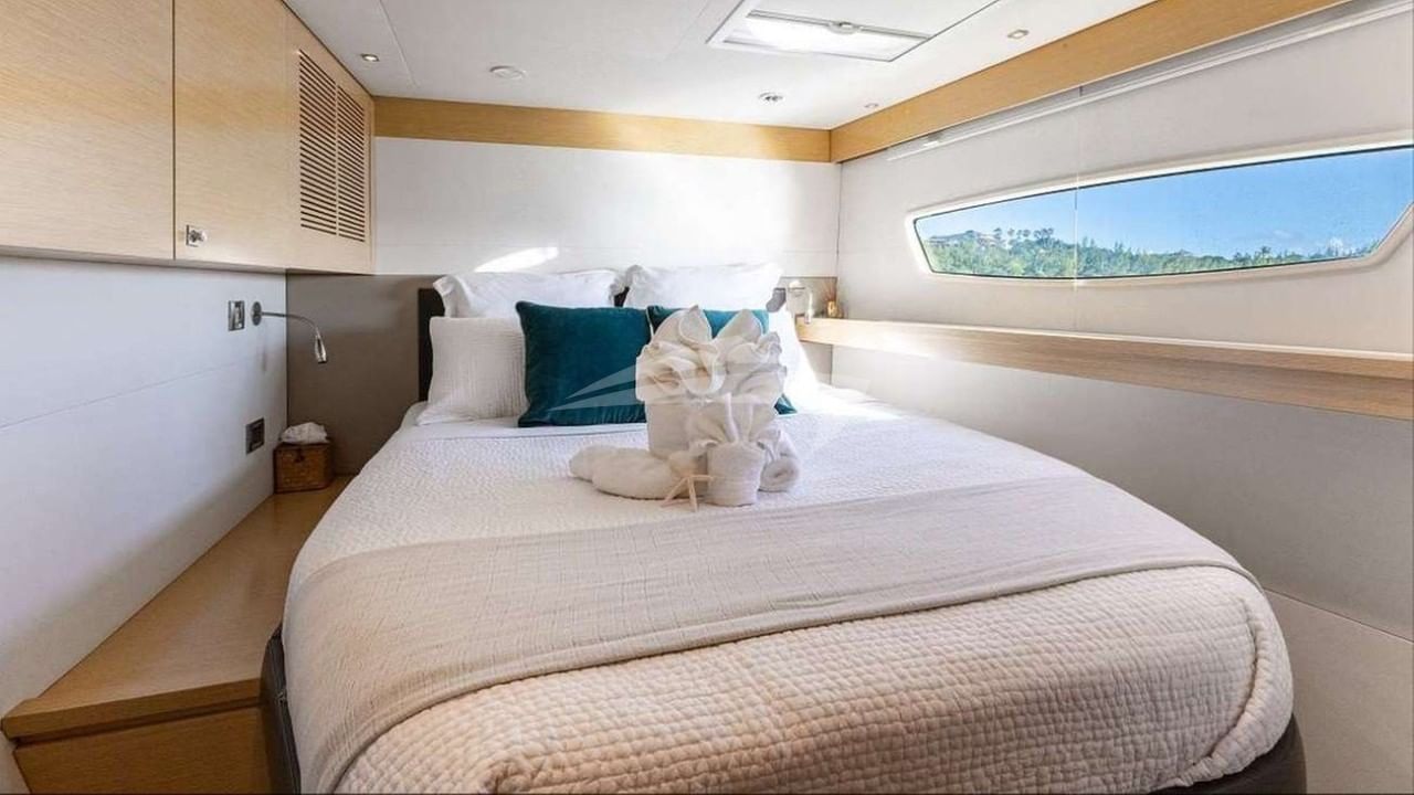 Die Gästekabinen umfassen eine primäre Suite mit einem Kingsize-Bett und einem eigenen Bad, 3 Kabinen mit einem Queensize-Bett und einem eigenen Bad sowie eine Kabine mit einem Einzelbett und einem eigenen Bad.