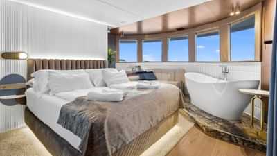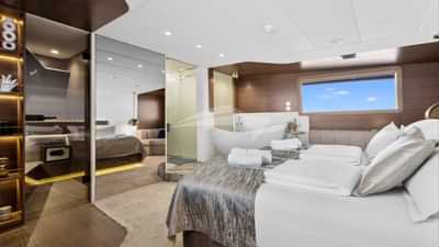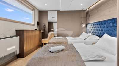 Die Gästekabinen bestehen aus 3 Hauptsuiten mit einem Kingsize-Bett und eigenem Bad, 2 VIP-Suiten mit einem Doppelbett und eigenem Bad, 2 Kabinen mit 2 Einzelbetten und eigenem Bad, einer Kabine mit einem Doppelbett und einem Einzelbett und eigenem Bad sowie 2 Kabinen mit 2 Einzelbetten und eigenem Bad sowie 2 Kabinen mit 2 Einzelbetten und eigenem Bad.