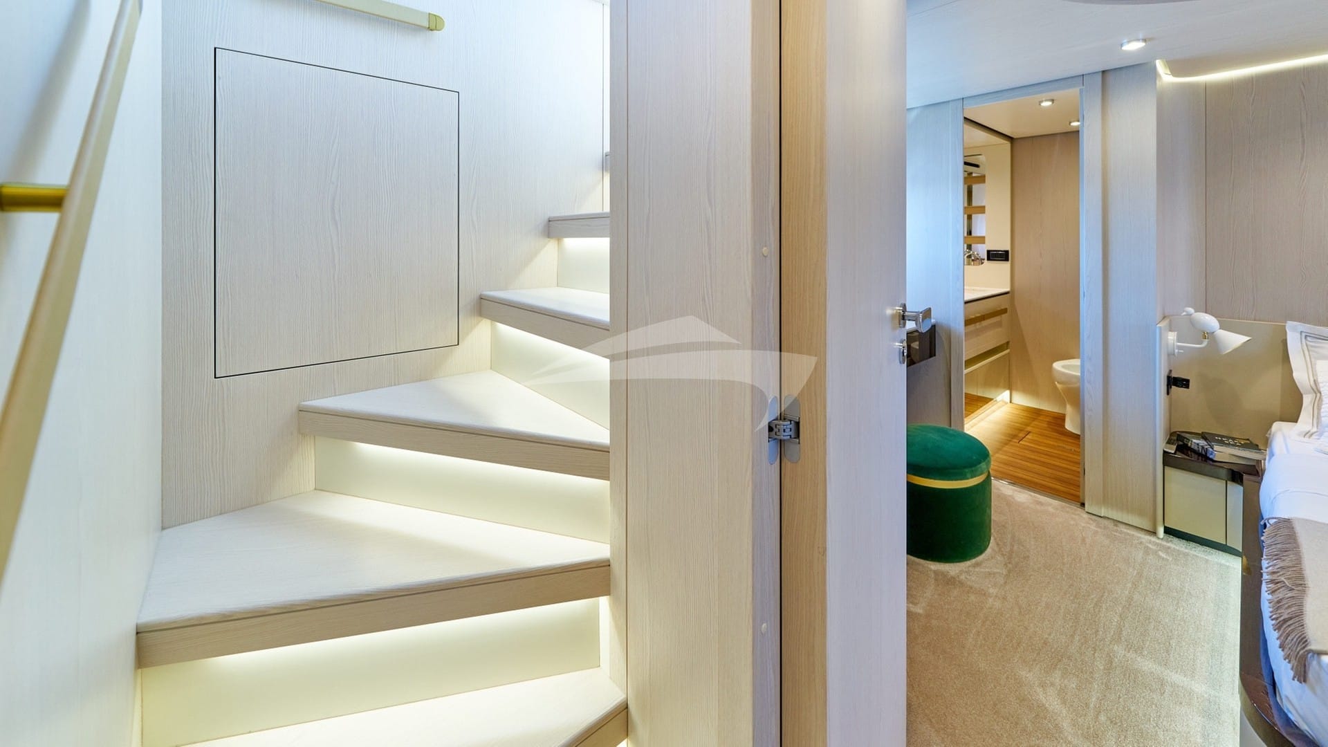 Die Gästekabinen umfassen eine primäre Suite mit einem Kingsize-Bett, eine Kabine mit einem Queensize-Bett, eine Kabine mit einem Queensize-Bett und eine Kabine mit einem Twin-Bett.