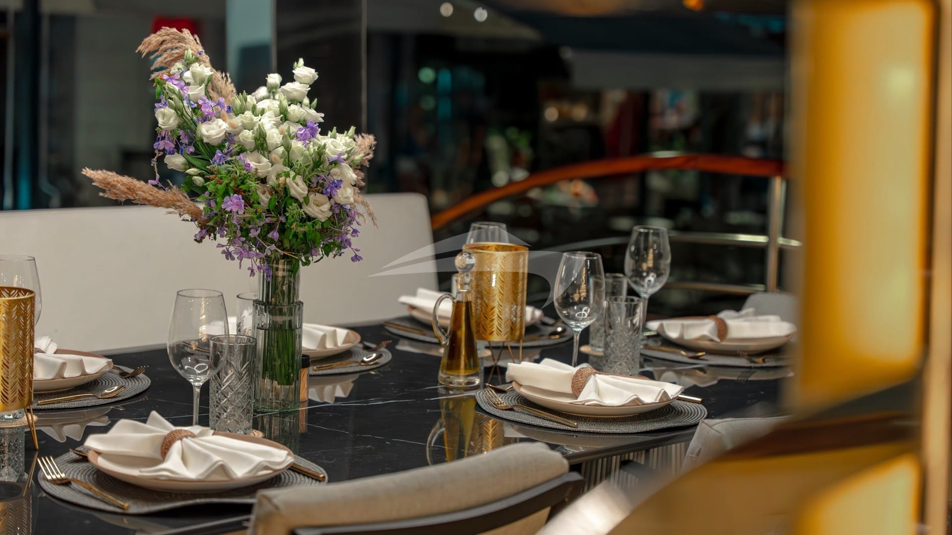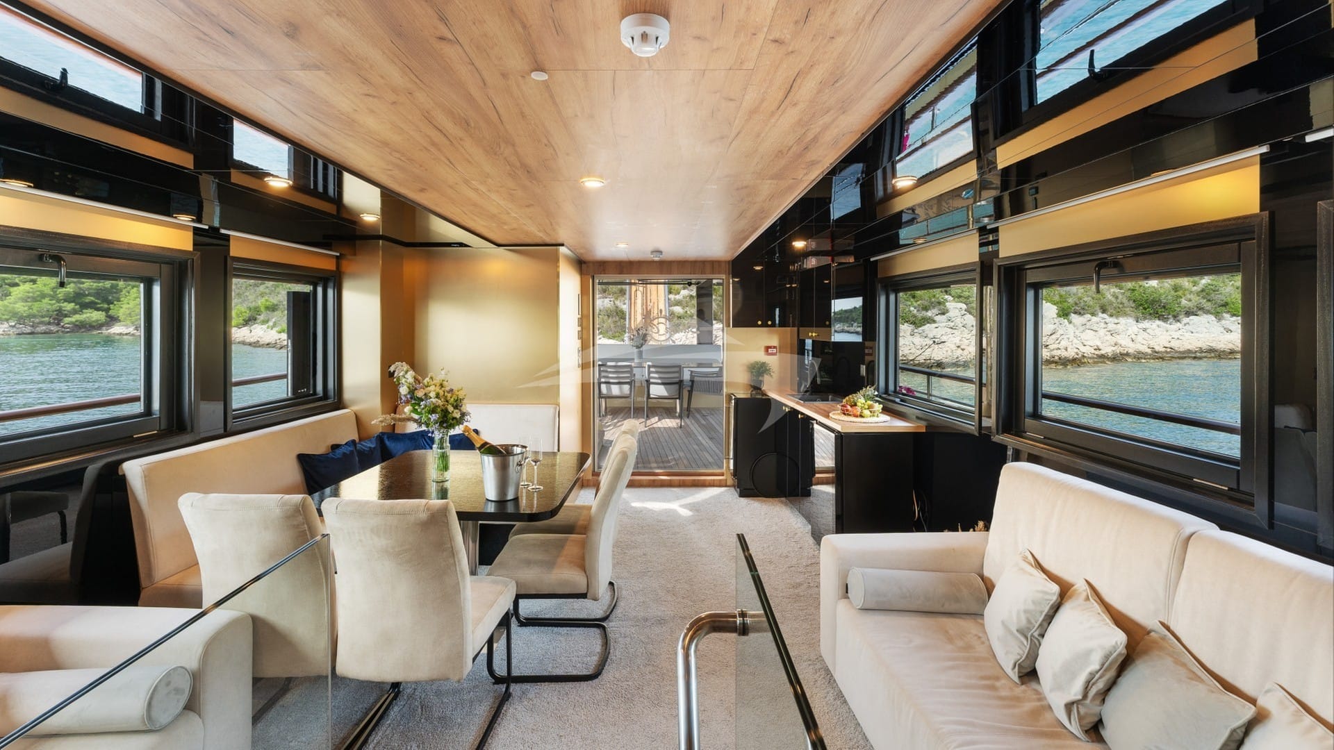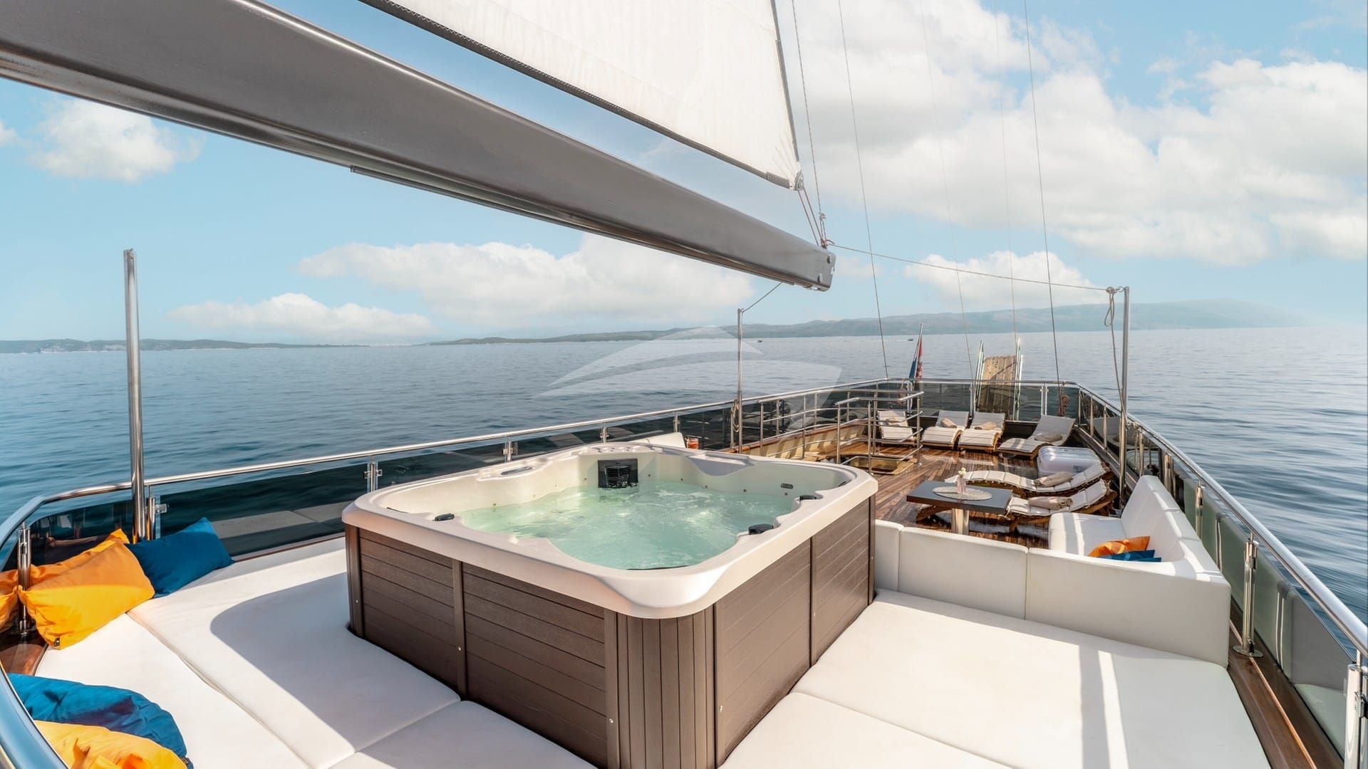 Zu den Annehmlichkeiten an Bord gehören leichte Angelausrüstung, ein Audiosystem im Innenbereich, ein Whirlpool an Deck, Sonnenliegen und ein Fernsehsalon.