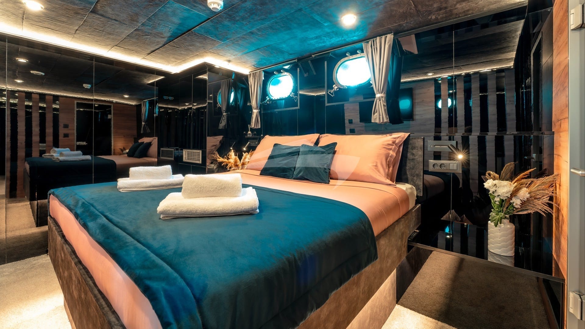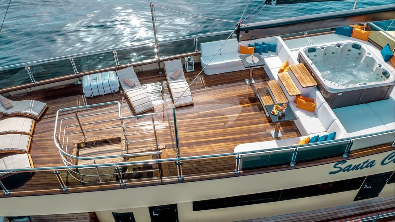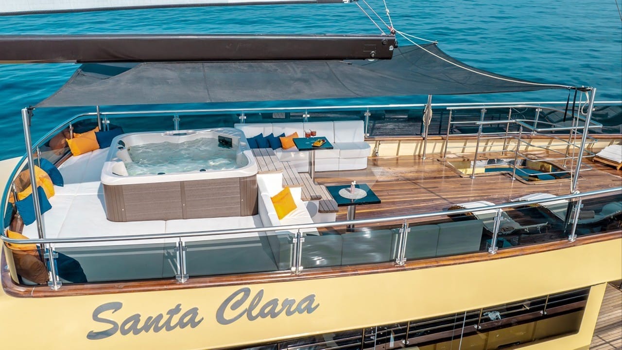 SANTA CLARA bietet Platz für 8 Gäste in 4 Kabinen, bestehend aus einer Primärsuite mit einem Doppelbett und eigenem Bad, einer VIP-Suite mit einem Doppelbett und eigenem Bad, einer Kabine mit einem Doppelbett und eigenem Bad sowie einer Kabine mit einem Einzelbett und eigenem Bad.