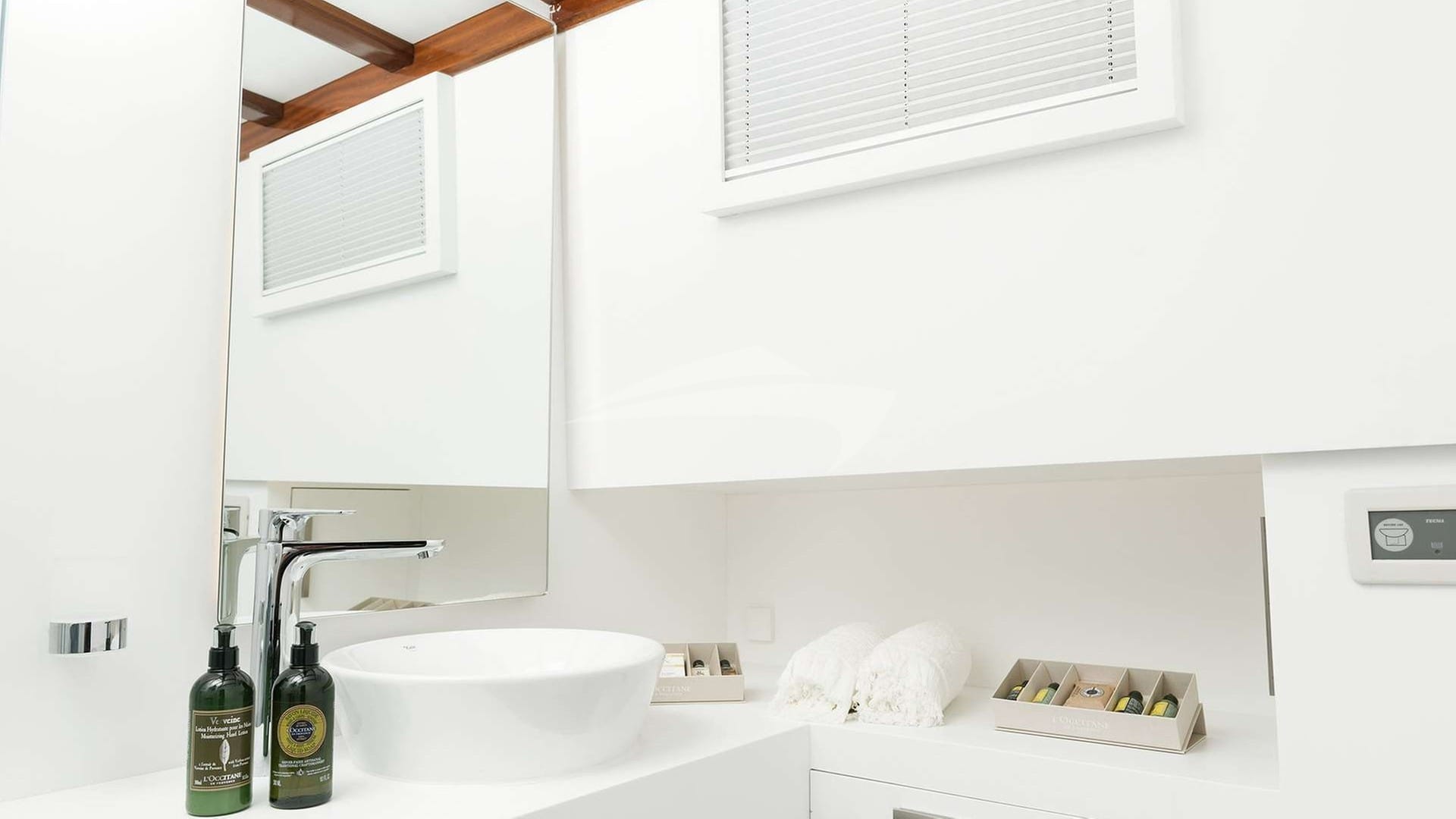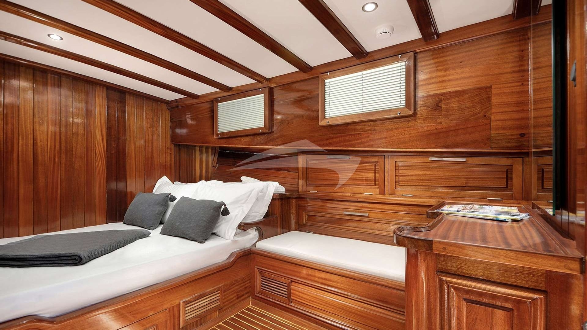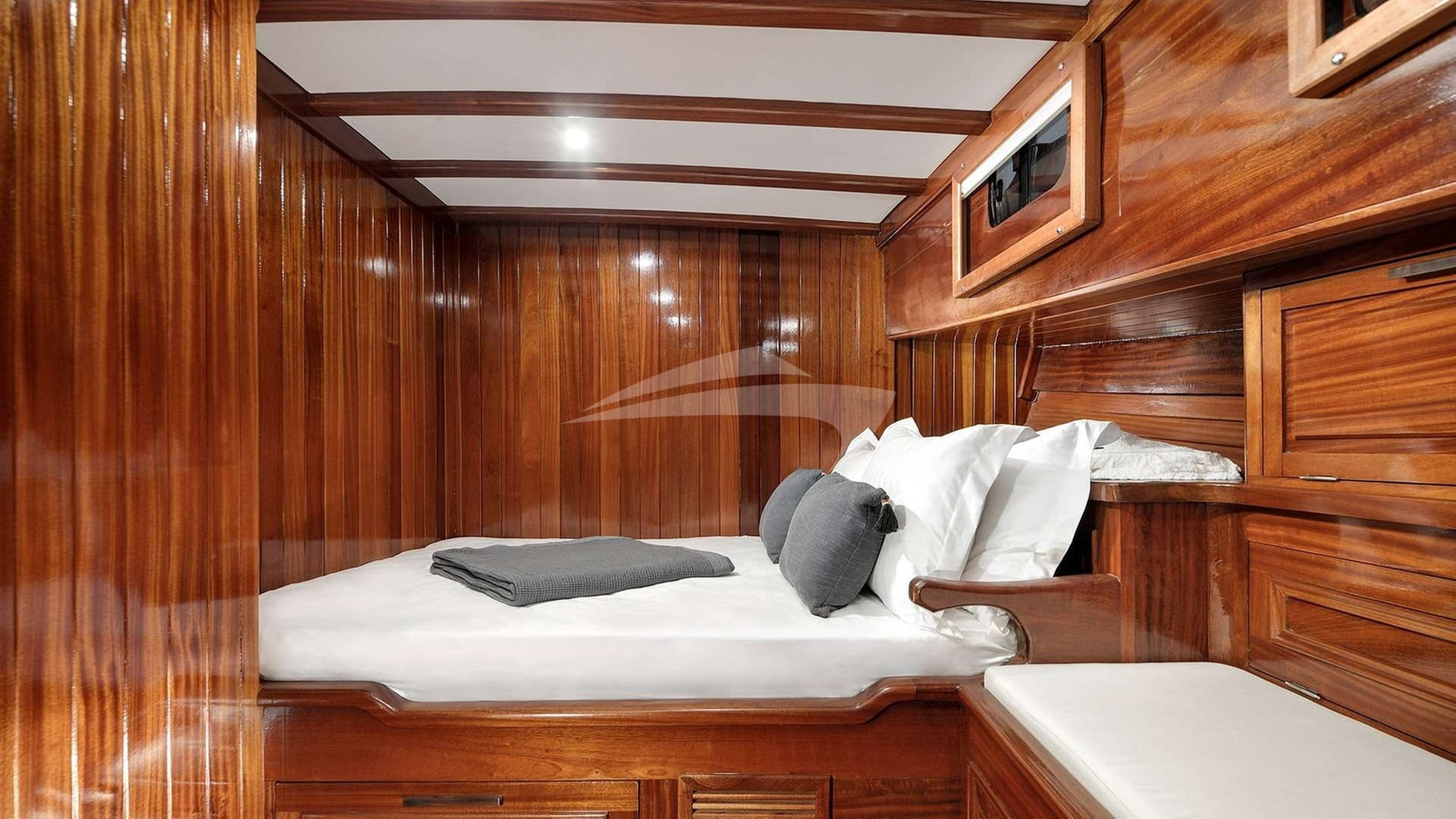 Die Gästekabinen bestehen aus einer primären Suite mit einem Doppelbett, 2 Kabinen mit einem Doppelbett und einer Kabine mit einem Twin-Bett.