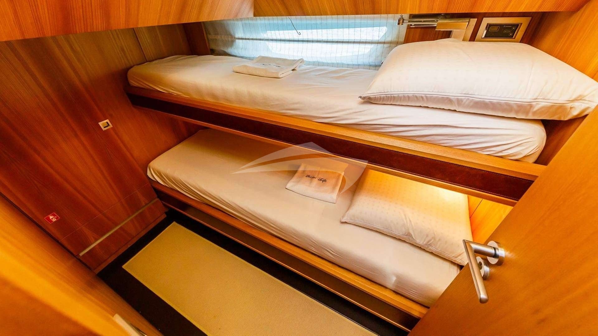 SECRET LIFE bietet Platz für 6 Gäste in 3 Kabinen, bestehend aus einer Primärsuite mit einem Kingsize-Bett, einer Kabine mit einem Queen-Size-Bett und einer Kabine mit einem Einzelbett.