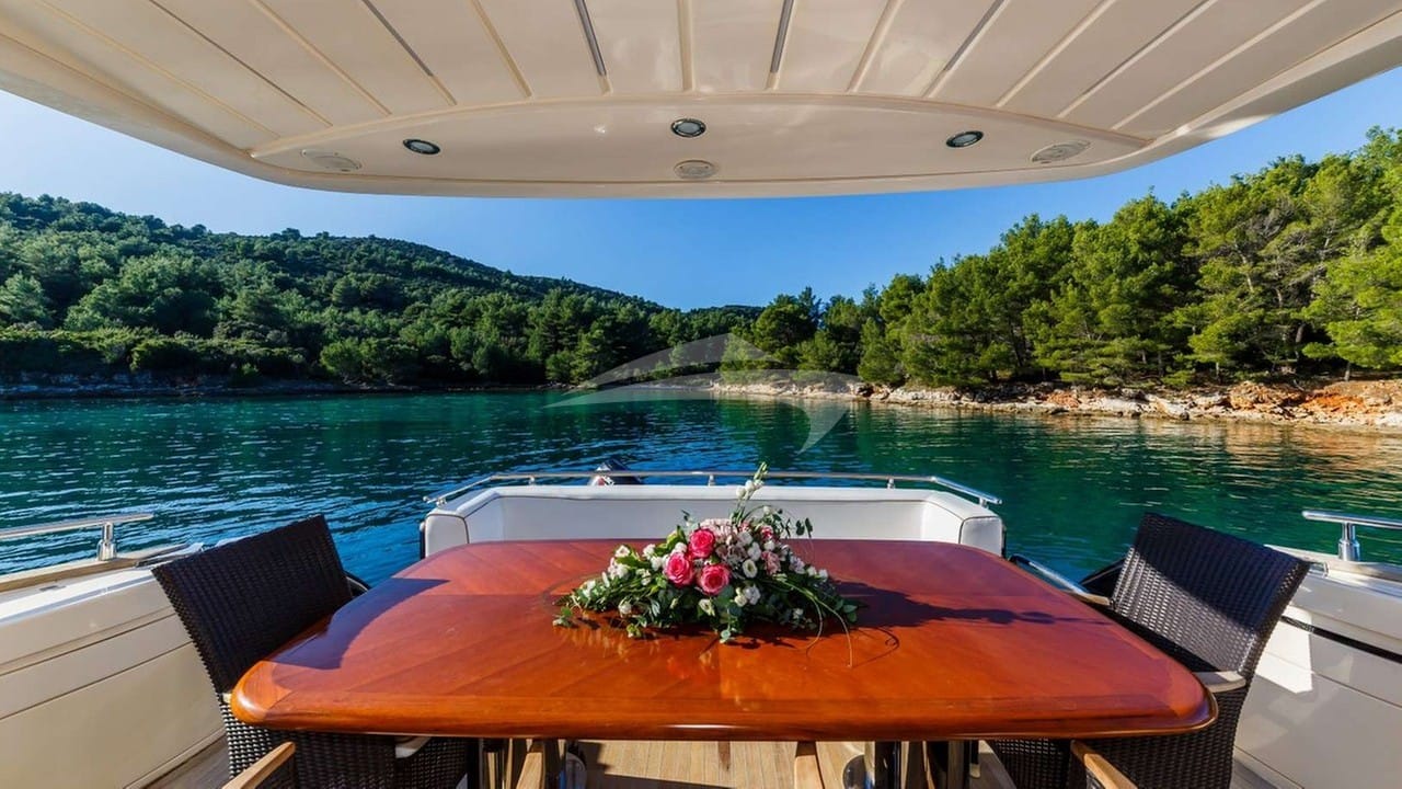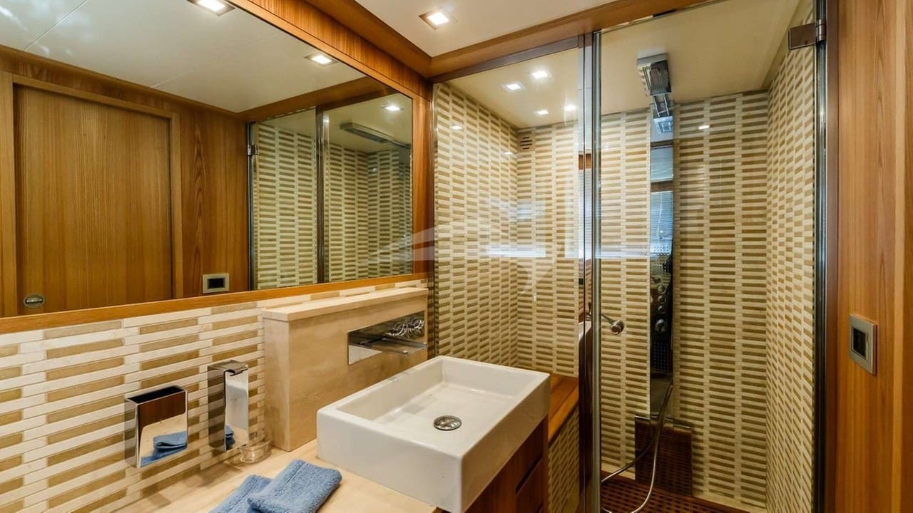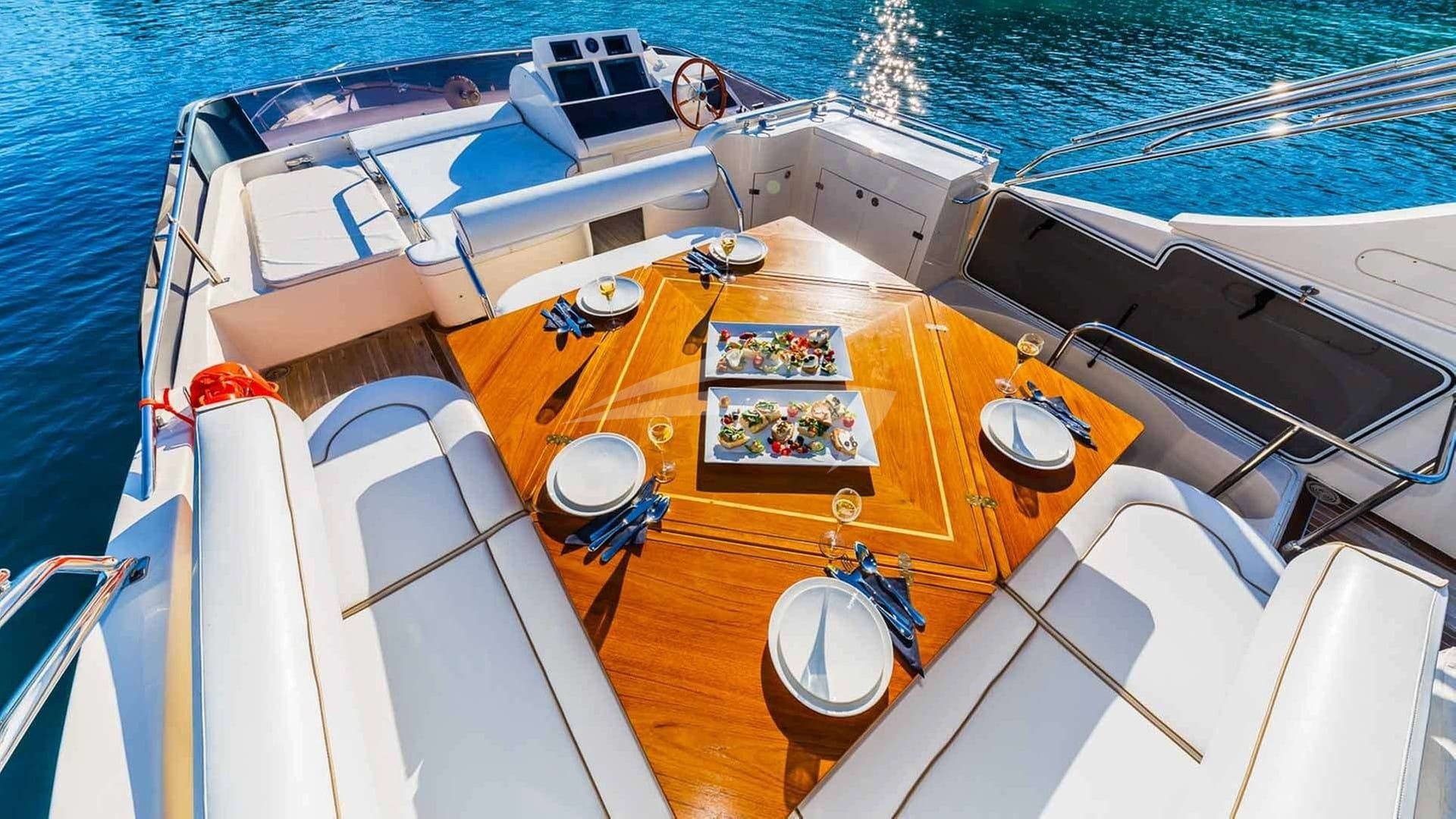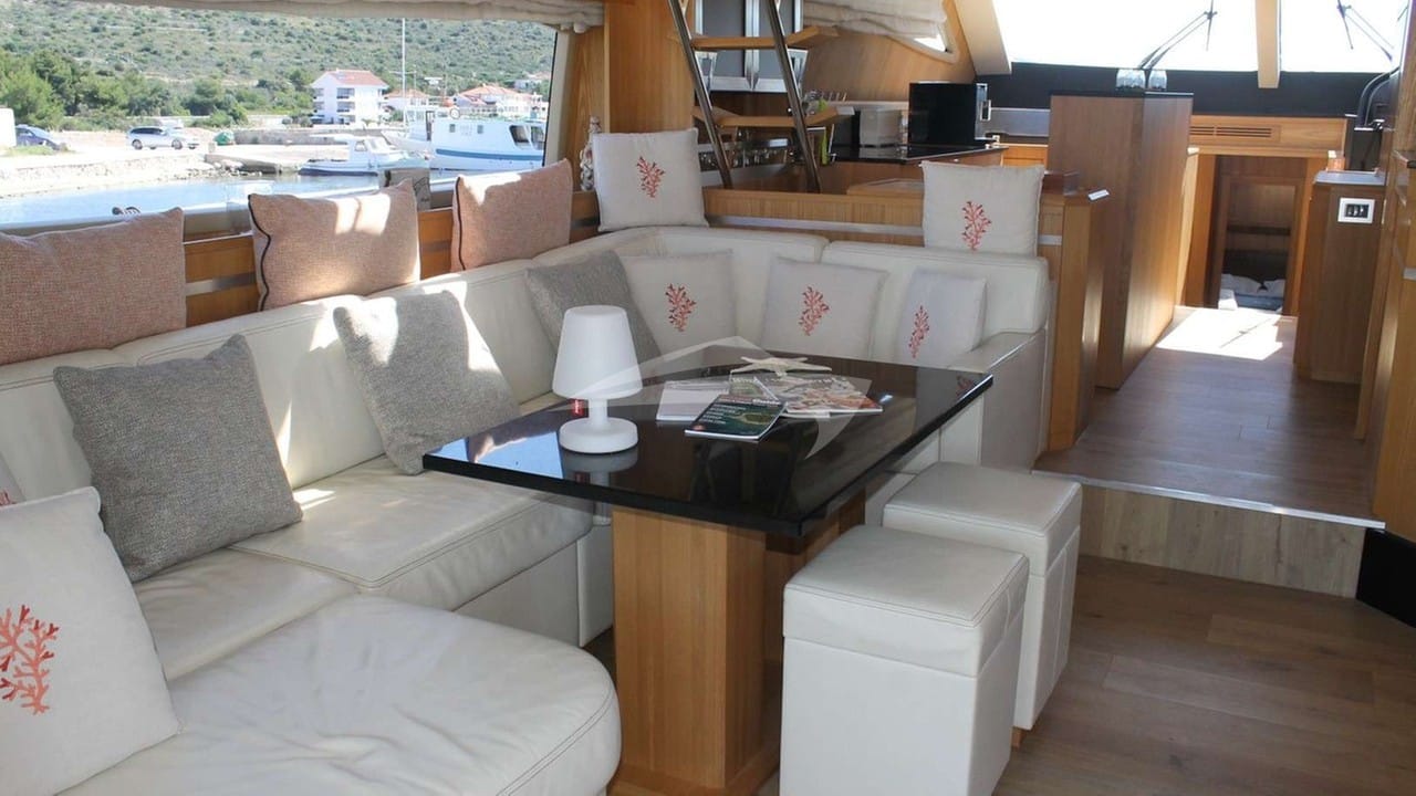 Zu den Annehmlichkeiten an Bord gehören eine Klimaanlage, eine Außendusche, ein Audiosystem im Innenbereich, eine Badeplattform, ein Fernsehsalon und WLAN.