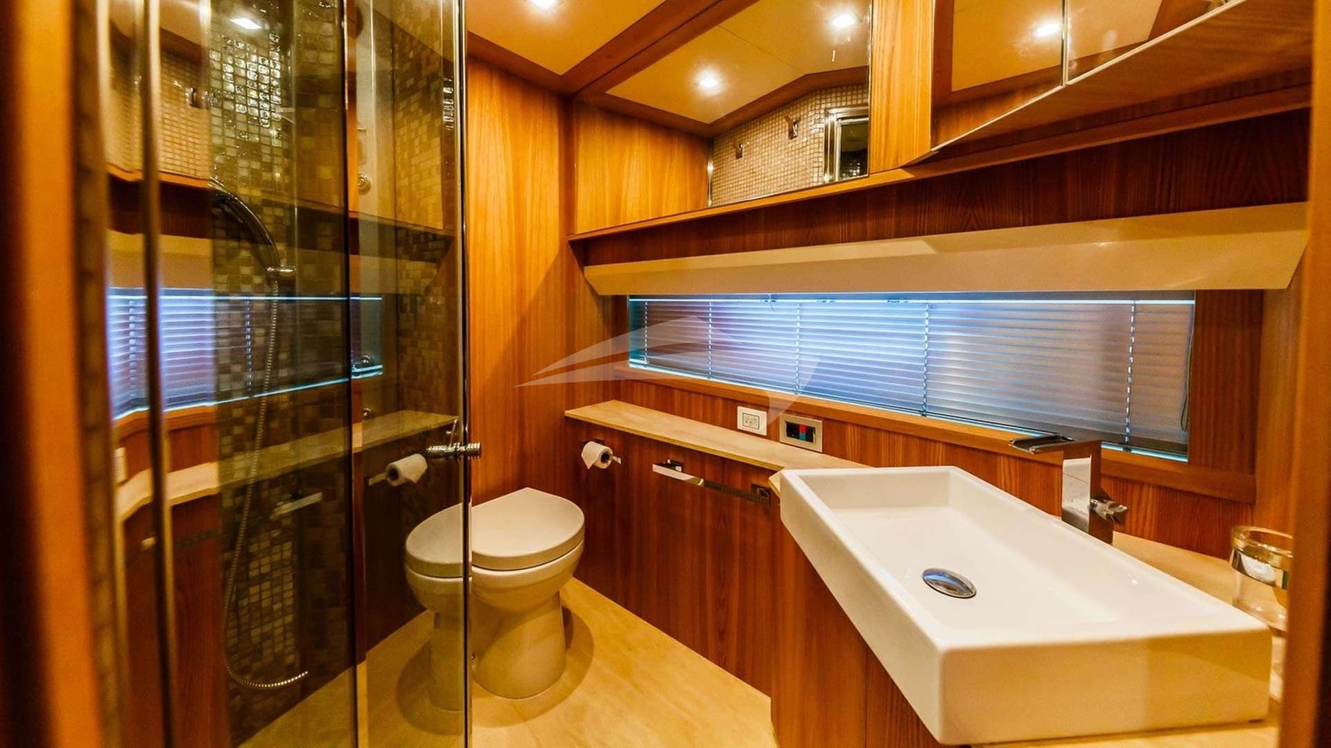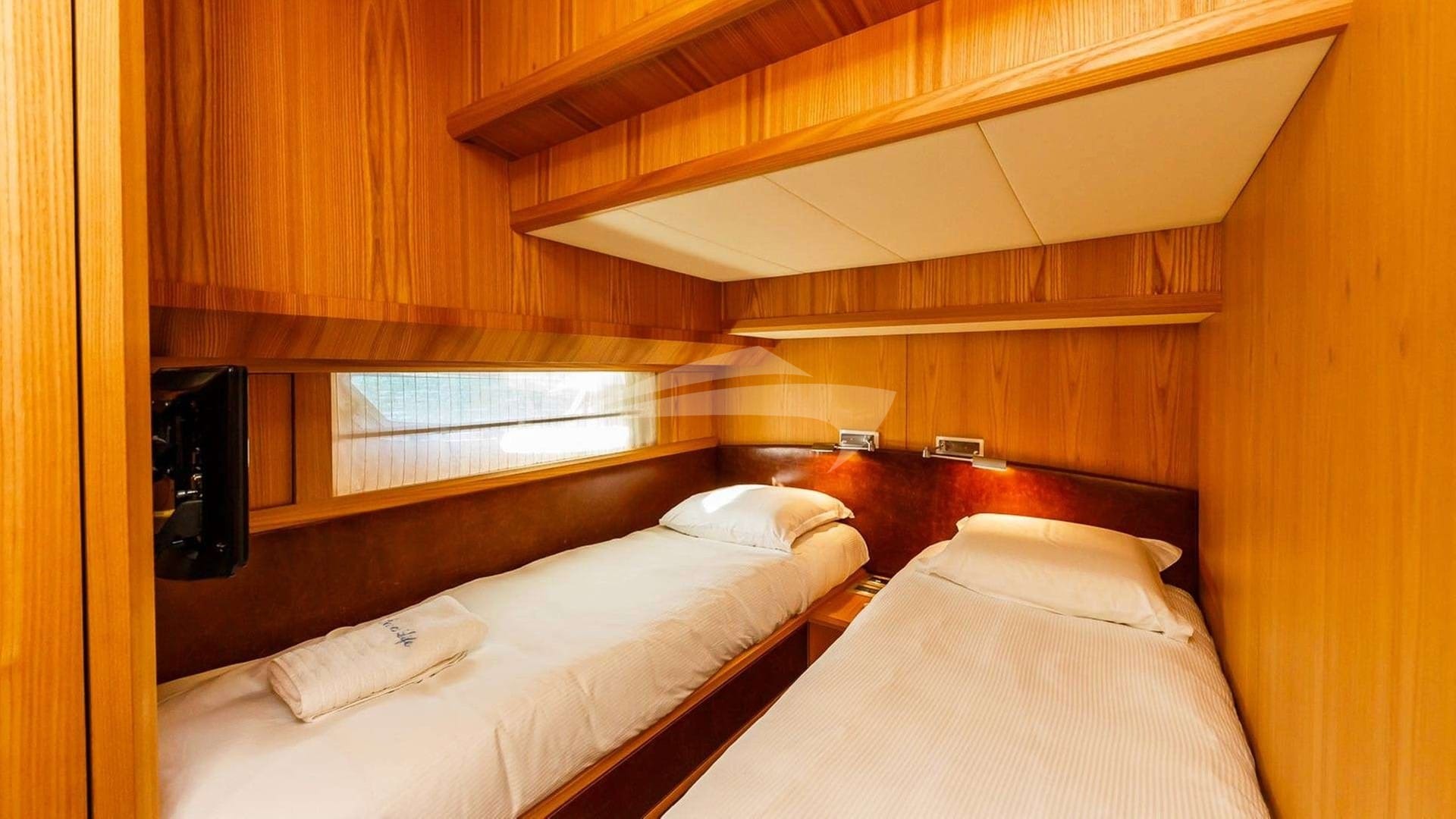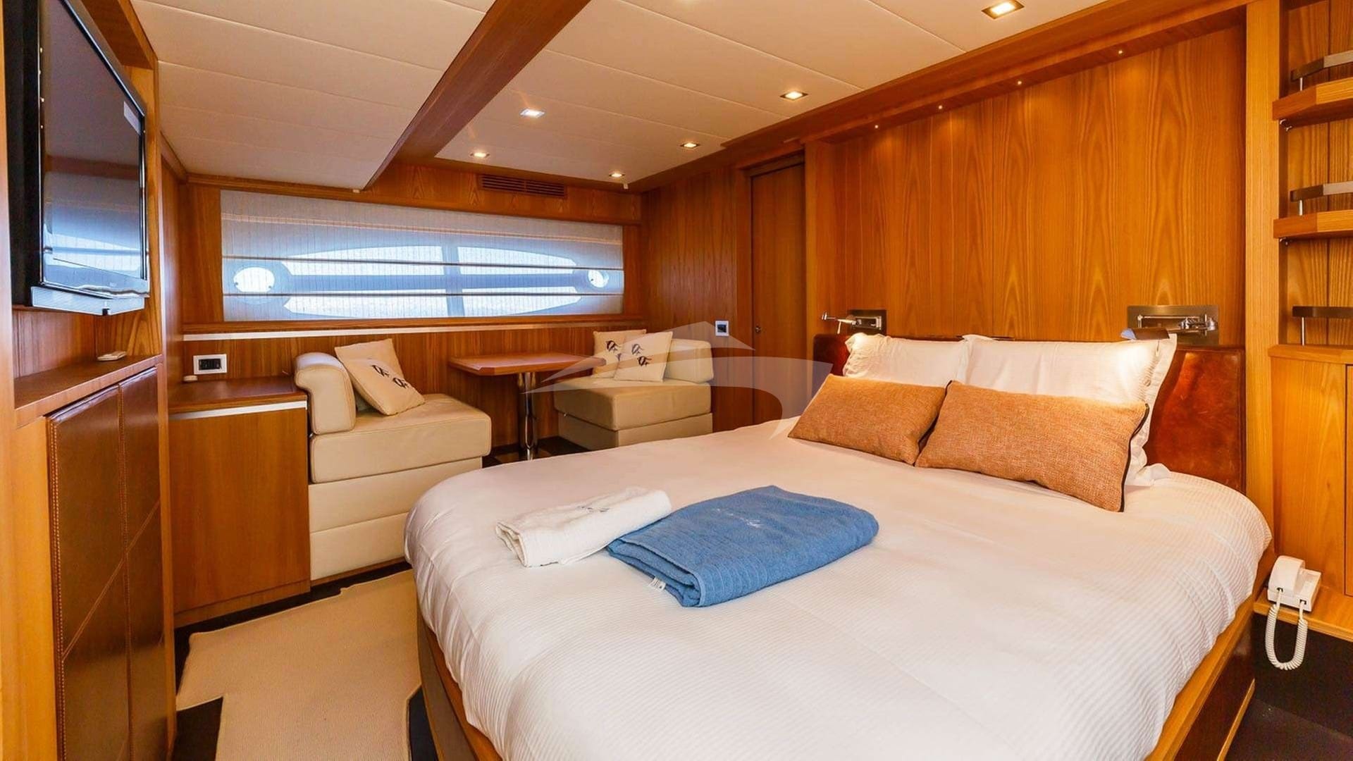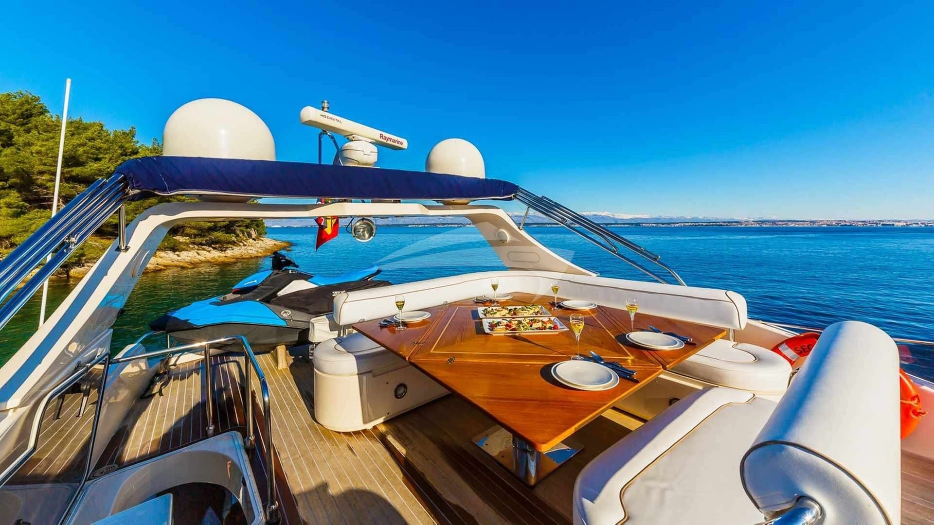 Zu den Annehmlichkeiten an Bord gehören eine Klimaanlage, eine Außendusche, ein Audiosystem im Innenbereich, eine Badeplattform, ein Fernsehsalon und WLAN.