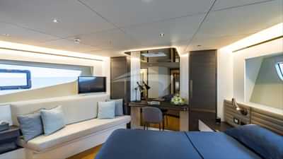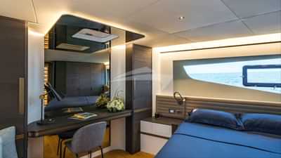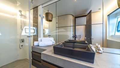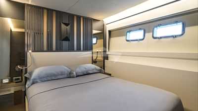 Die Gästekabinen umfassen eine primäre Suite mit einem Kingsize-Bett und einem eigenen Bad sowie 2 Kabinen mit einem Doppelbett und einem eigenen Bad.