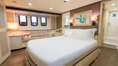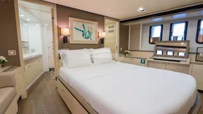 Die Gästekabinen umfassen eine primäre Suite mit einem Kingsize-Bett, eine Kabine mit einem Queensize-Bett und eine Kabine mit einem Twin-Bett.