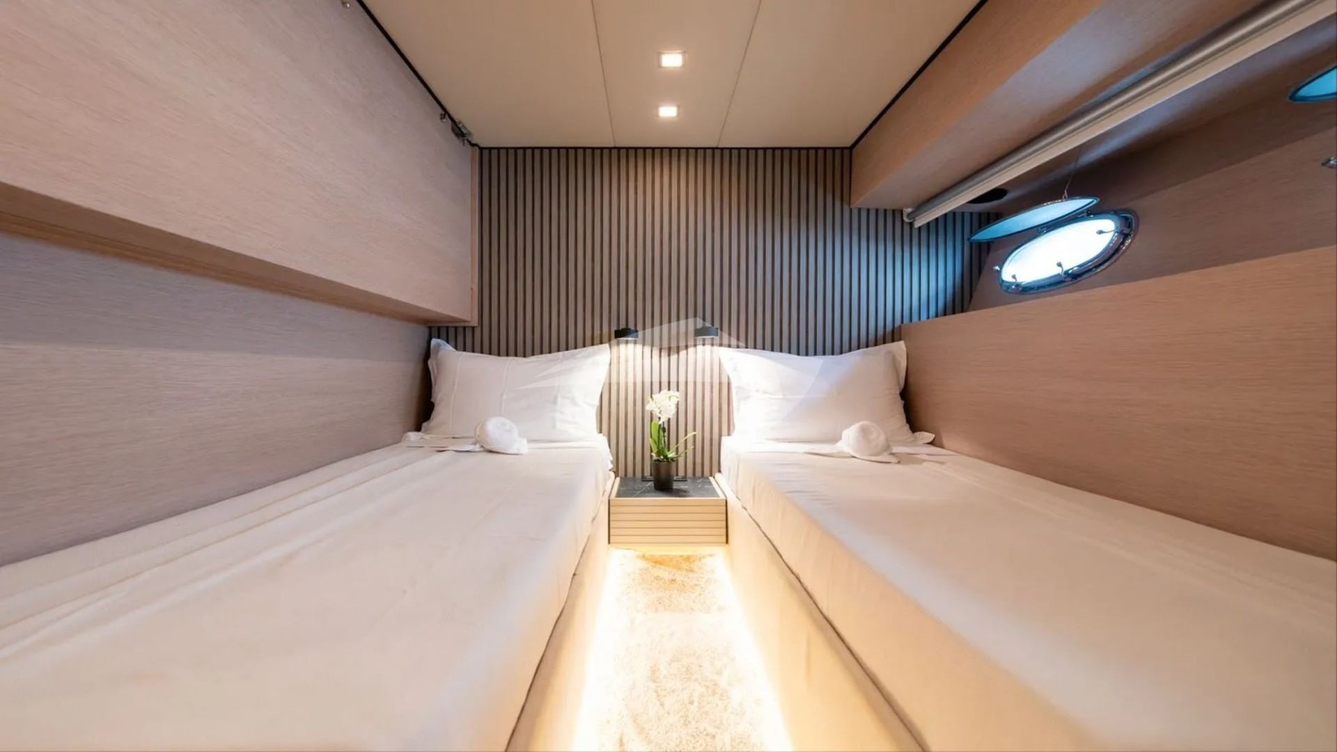 Die Gästekabinen umfassen eine primäre Suite mit einem Kingsize-Bett und einem eigenen Bad, eine Kabine mit einem Doppelbett und einem eigenen Bad sowie 2 Kabinen mit einem Twin-Bett und einem Pullman-Bett und einem eigenen Bad.