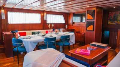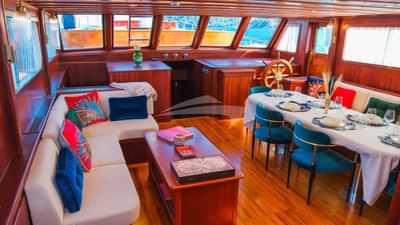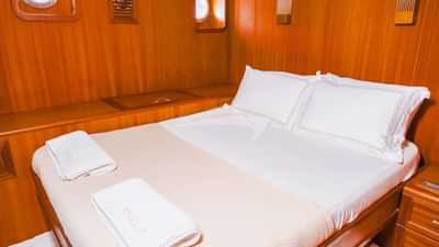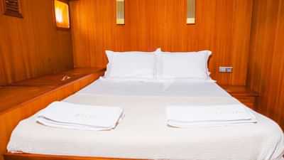 Die Gästekabinen umfassen eine primäre Suite mit einem Kingsize-Bett und einem eigenen Bad, eine Kabine mit einem Kingsize-Bett und einem eigenen Bad sowie 3 Kabinen mit einem Doppelbett und einem eigenen Bad.