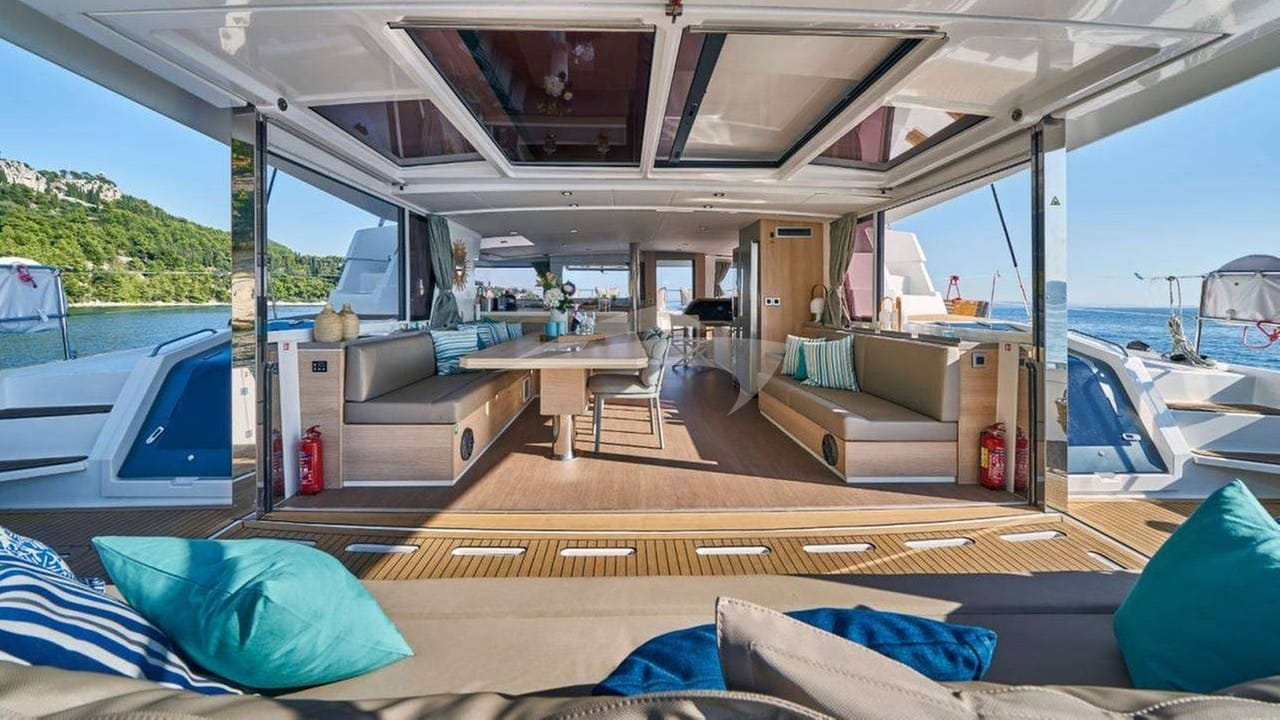 Zu den Annehmlichkeiten an Bord für die Chartergäste gehören eine Klimaanlage, eine Außendusche, ein Audiosystem im Innenbereich, eine iPod-Dockingstation, ein Satellitenfernsehen und ein Fernsehsalon.