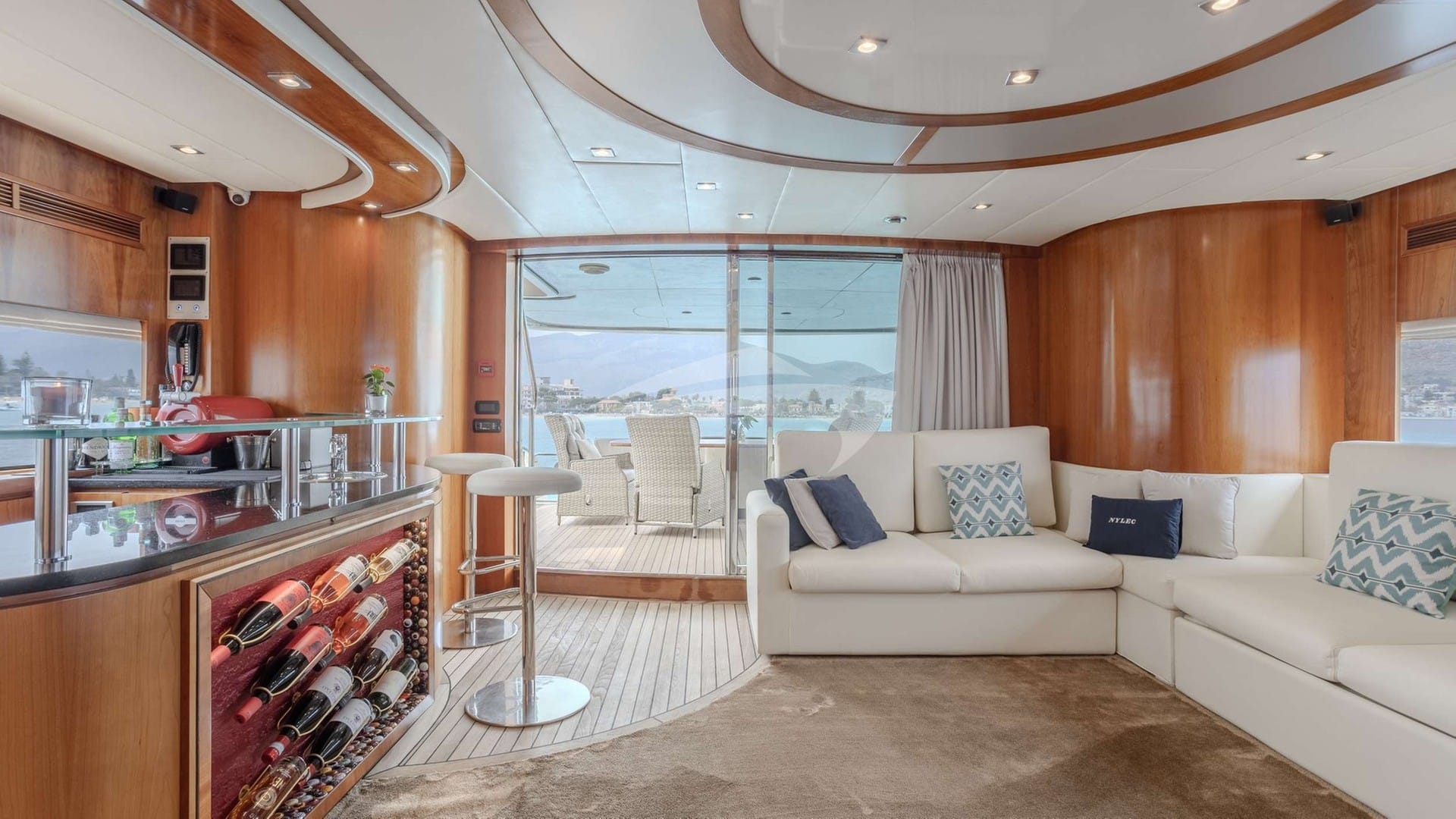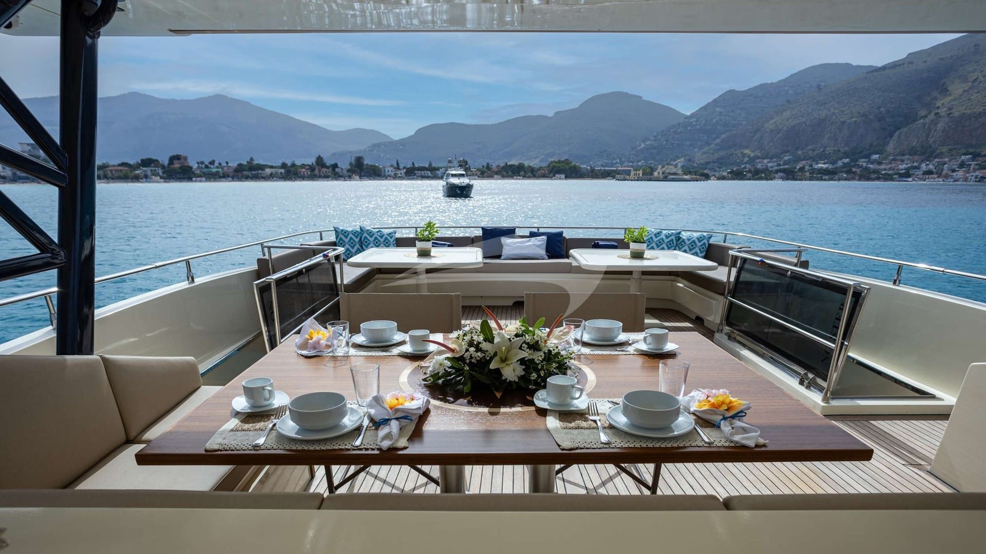 Zu den Annehmlichkeiten an Bord für die Chartergäste gehören Klimaanlage, Grill, Außendusche, Indoor-Audiosystem, iPod-Dockingstation, Stabilisatoren vor Anker, Badeplattform, TV-Salon und WLAN.