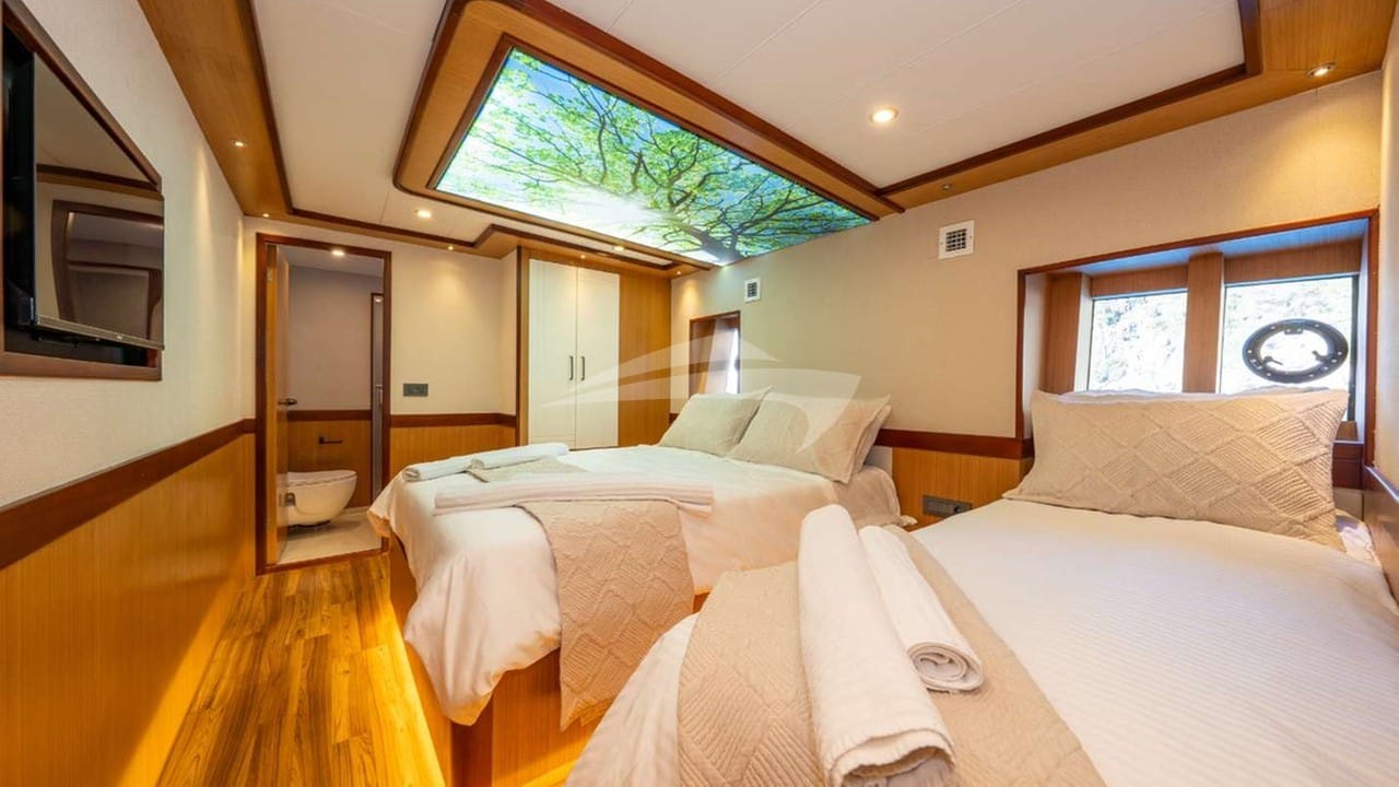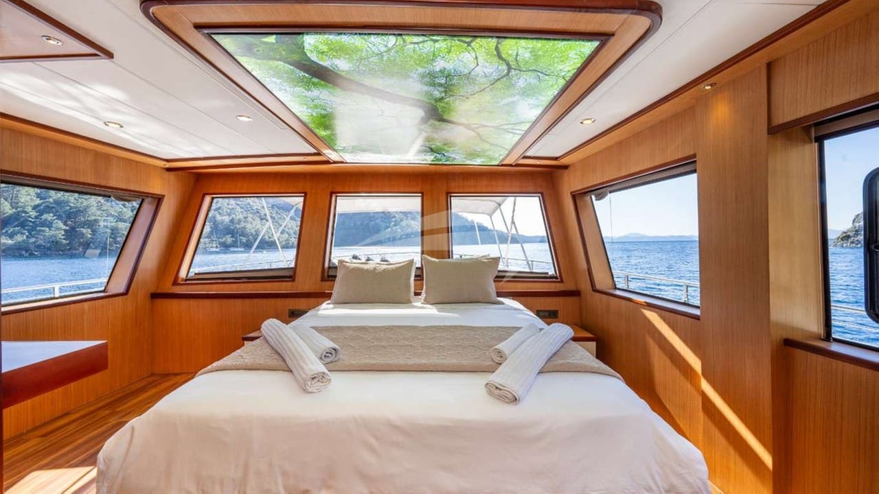 Die Gästekabinen bestehen aus einer Primärsuite mit einem Queen-Size-Bett, 2 Kabinen mit einem Queen-Size-Bett und 2 Kabinen mit einem Doppelbett.
