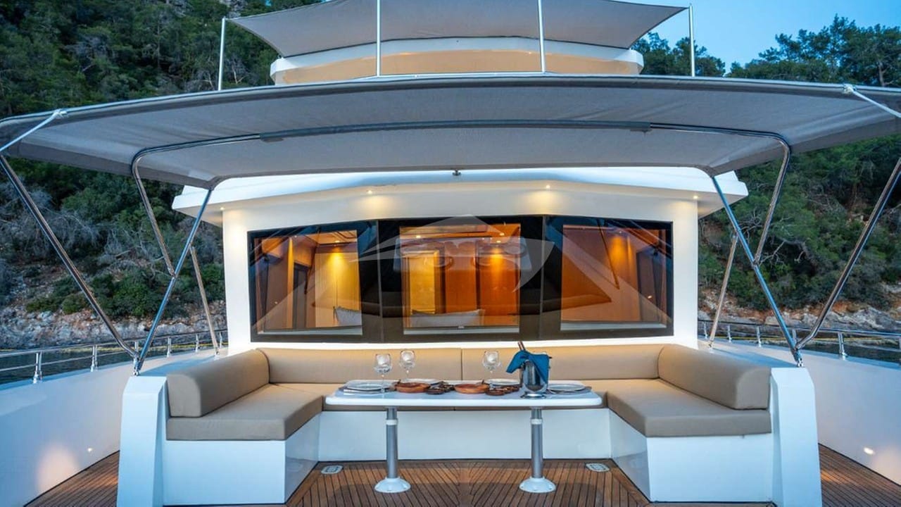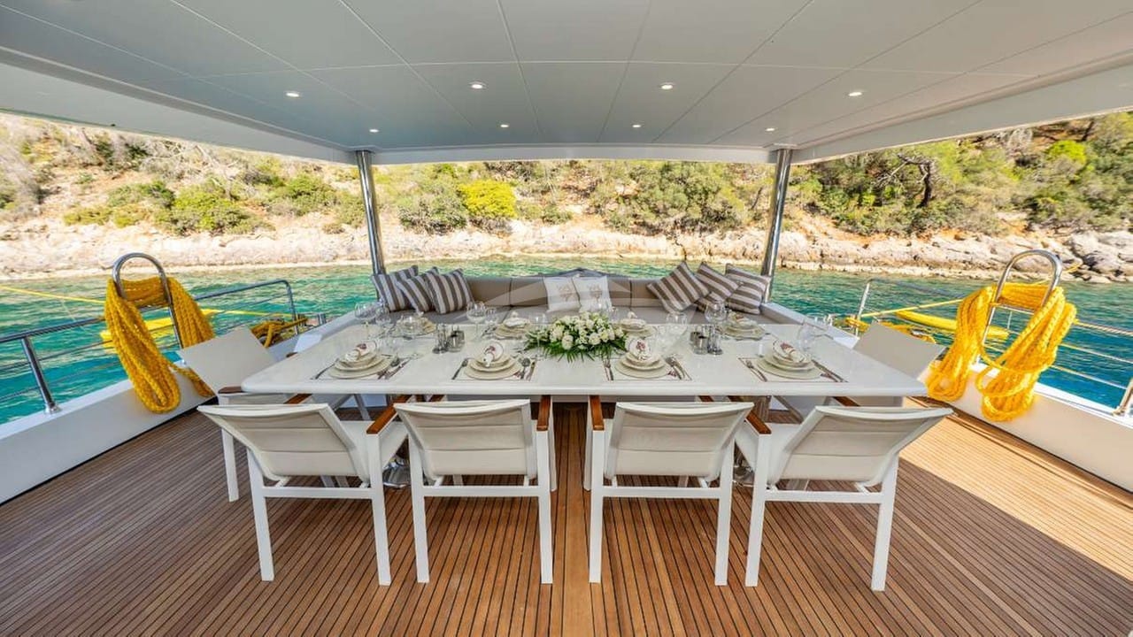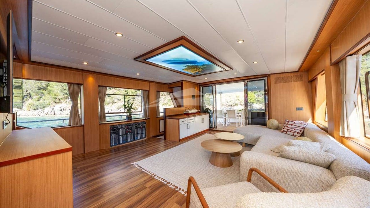 Zu den Annehmlichkeiten an Bord für die Chartergäste gehören eine Klimaanlage, ein Audiosystem im Innenbereich, eine Badeplattform, ein Fernsehsalon und WLAN.