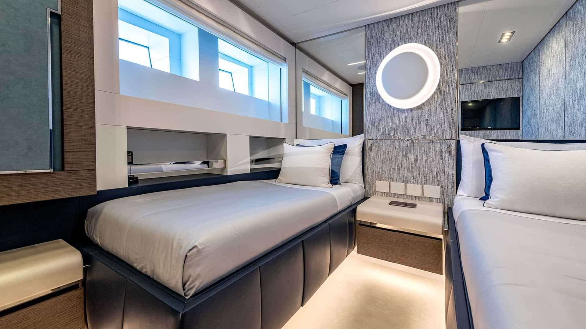 Die Gästekabinen bestehen aus einer Primärsuite mit einem Kingsize-Bett, 3 Kabinen mit einem Doppelbett und 2 Kabinen mit einem Einzelbett.