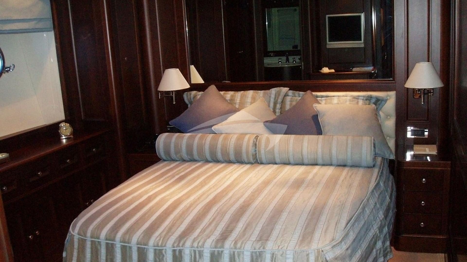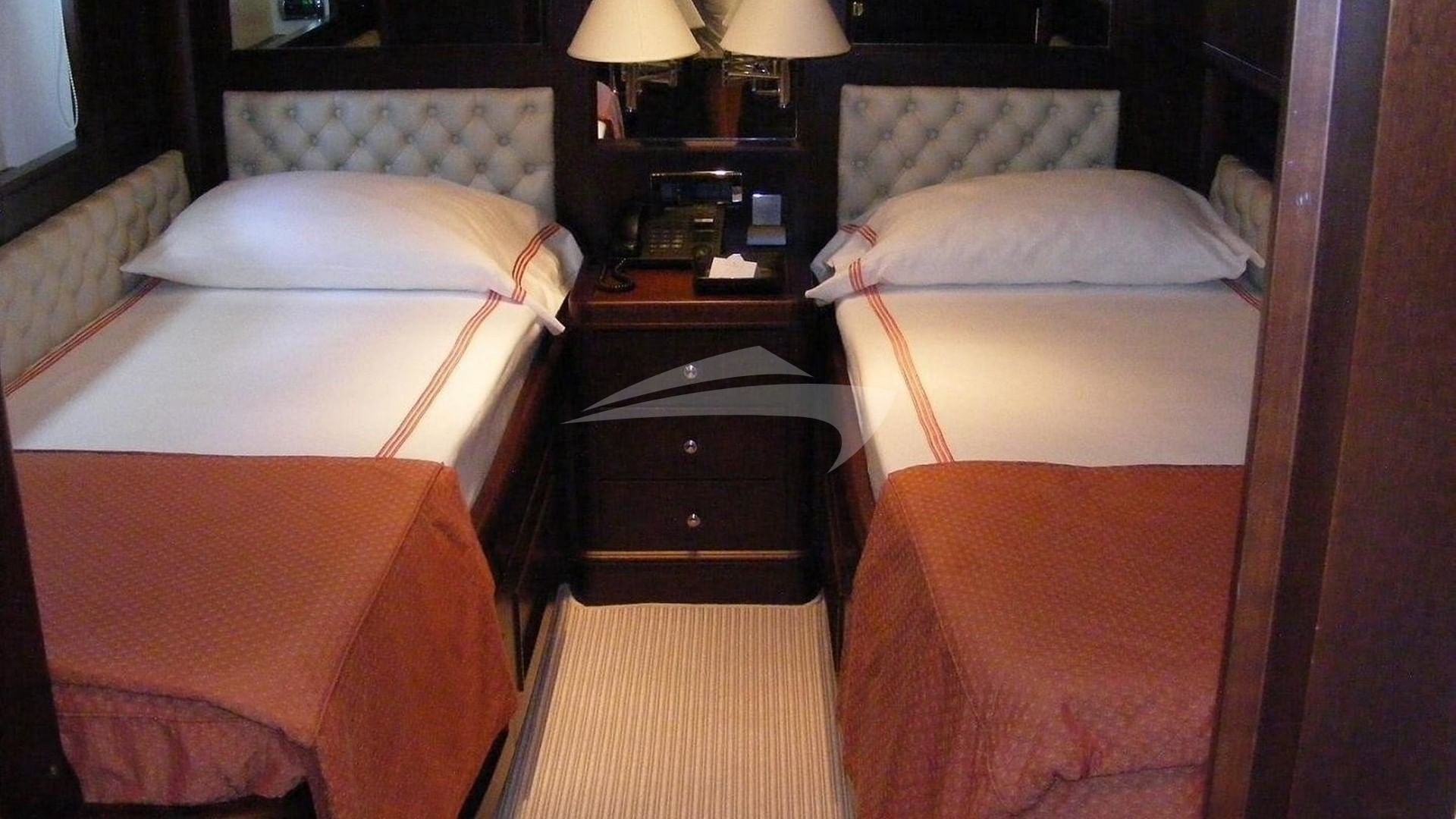 BACCHANAL bietet Platz für 12 Gäste in 5 Kabinen, bestehend aus einer Primärsuite mit einem Kingsize-Bett und eigenem Bad auf dem Hauptdeck, 2 Kabinen mit einem Queensize-Bett und eigenem Bad sowie 2 Kabinen mit einem Doppelbett und einem Pullman-Bett und eigenem Bad.