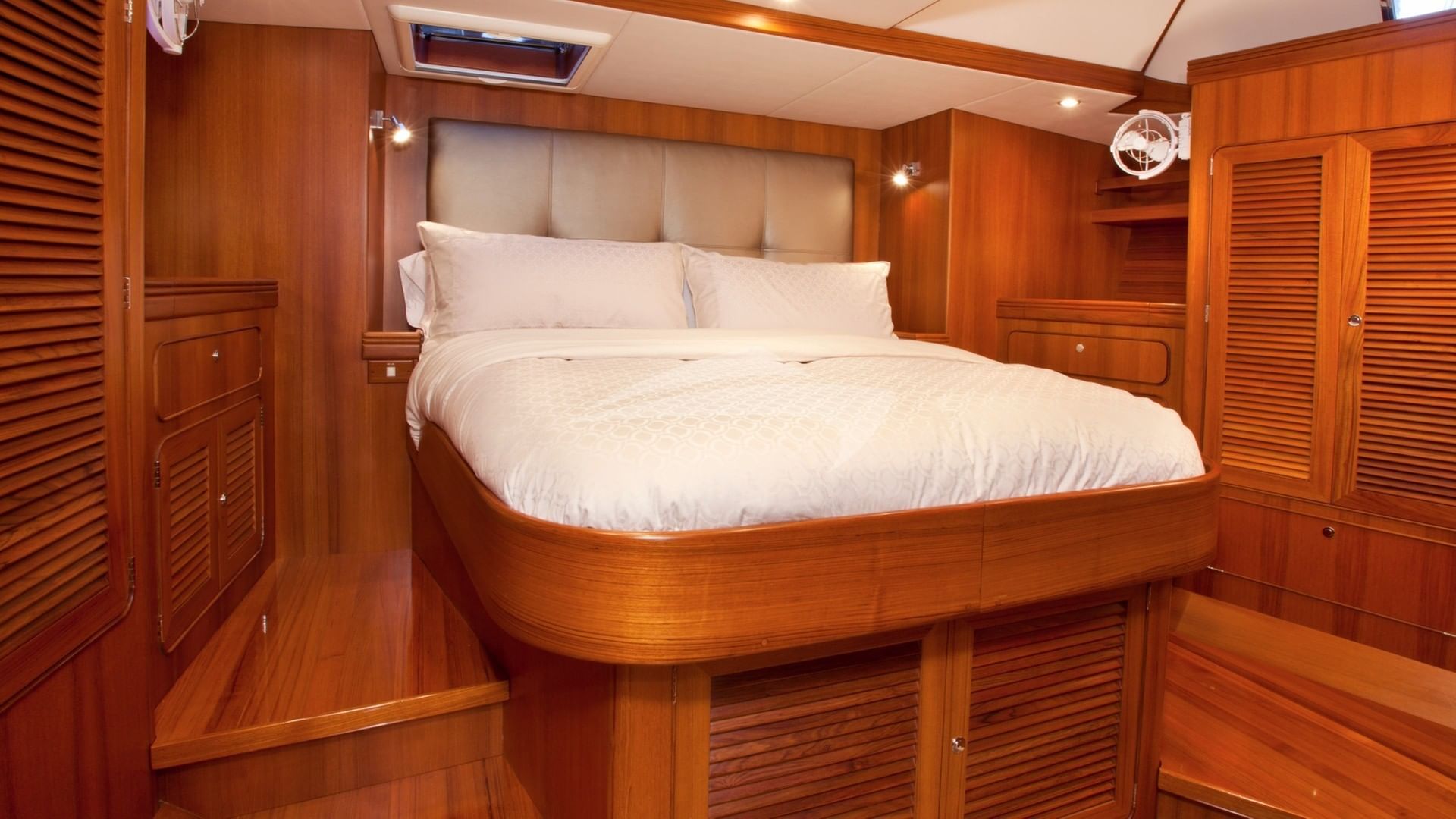 ERZENGEL bietet Platz für 6 Personen in 3 Kabinen, bestehend aus einer primären Suite mit einem Kingsize-Bett und einem eigenen Bad nach hinten, einer Kabine mit einem Queensize-Bett und einem eigenen Bad sowie einer Kabine mit einem Doppelbett und einem eigenen Bad.