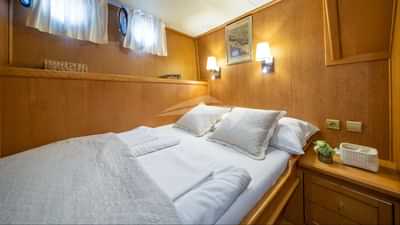 Die Gästekabinen bestehen aus 2 Kabinen mit einem Doppelbett und eigenem Bad, 2 Kabinen mit einem Doppelbett und eigenem Bad und 2 Kabinen mit einem Doppelbett und eigenem Bad.