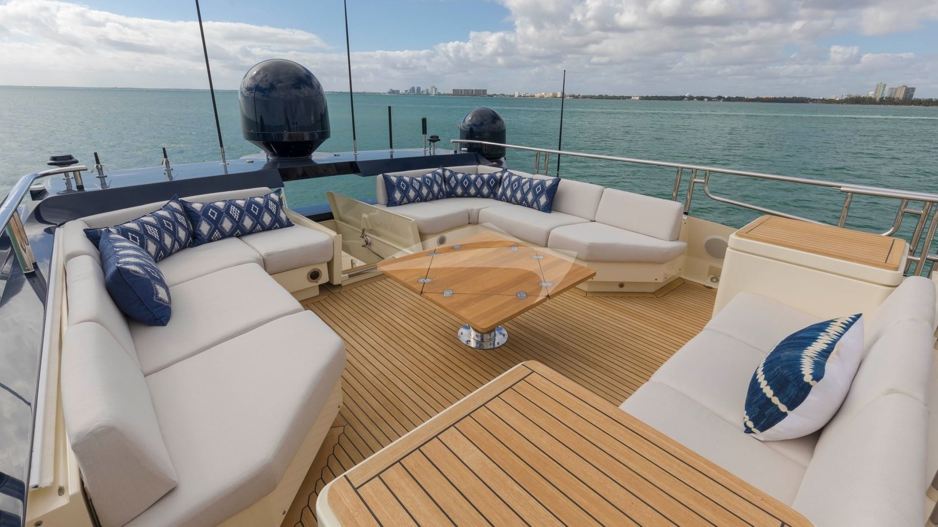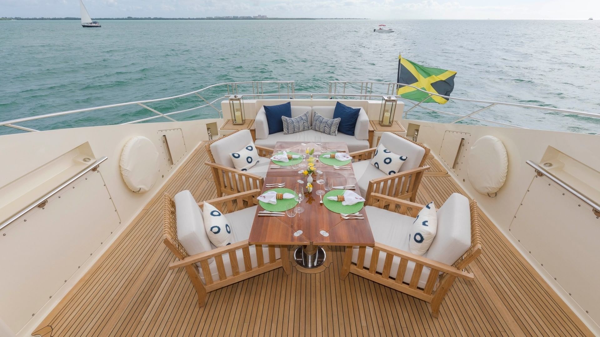Zu den Annehmlichkeiten an Bord gehören Klimaanlage, Außendusche, Eismaschine, Stabilisatoren vor Anker, Sonnenliegen und WLAN.