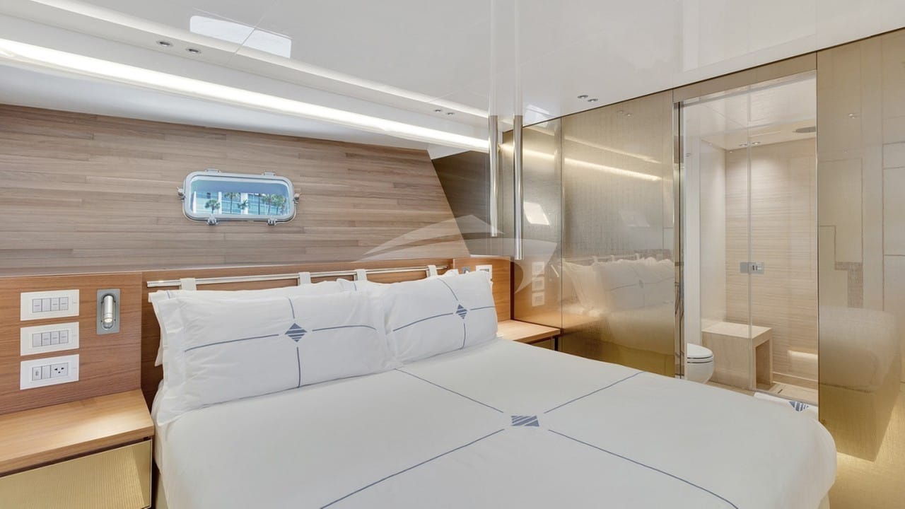 Das MON CHATEAU bietet Platz für 8 Personen in 4 Kabinen, bestehend aus einer primären Suite mit einem Kingsize-Bett und einem eigenen Bad, einer VIP-Suite mit einem Queensize-Bett und einem eigenen Bad sowie 2 Kabinen mit einem Einzelbett und einem eigenen Bad.