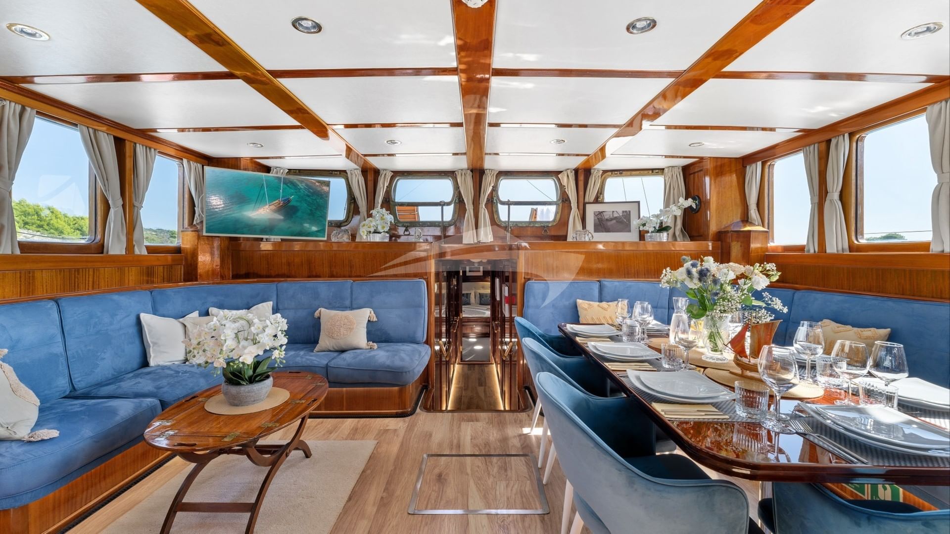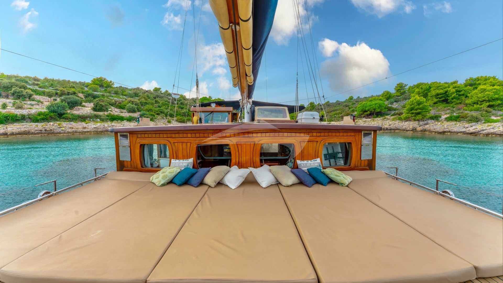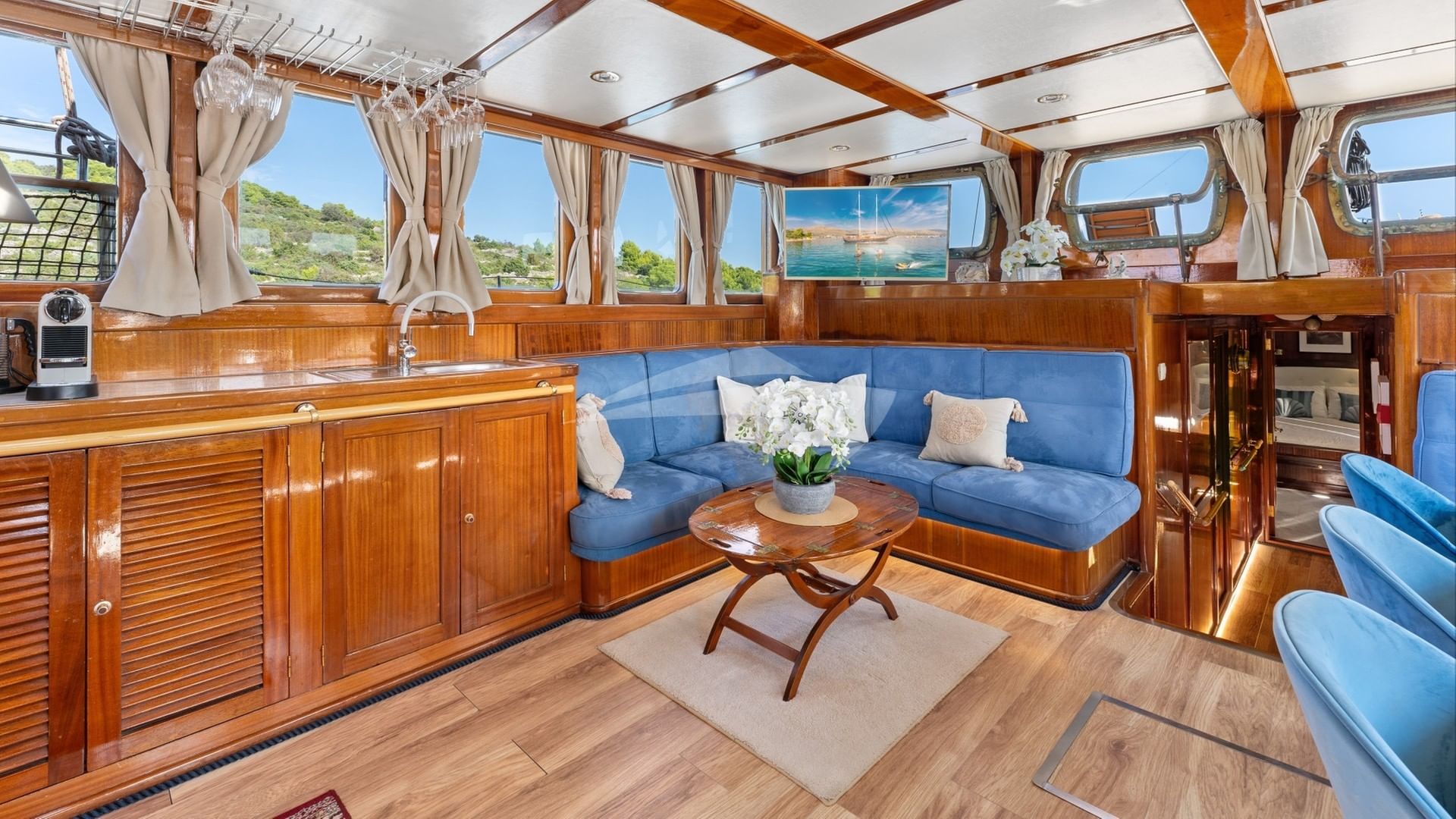 Amenities on board for the charter guests include Air Conditioning, Outdoor shower, Light fishing gear, Indoor audio system, Satellite TV, Sun pads, Sun Deck, Sun loungers, TV saloon and Wi-Fi.