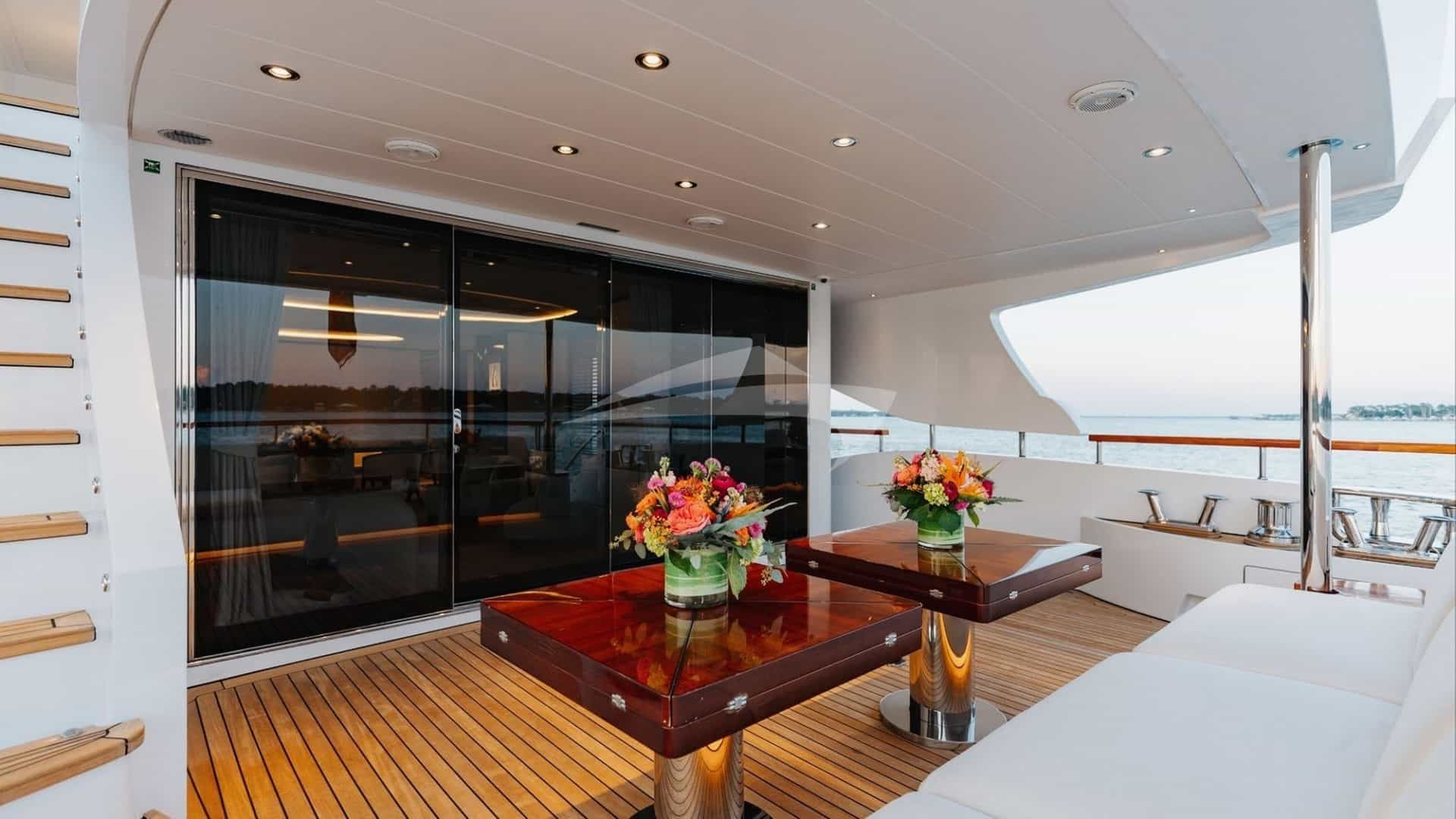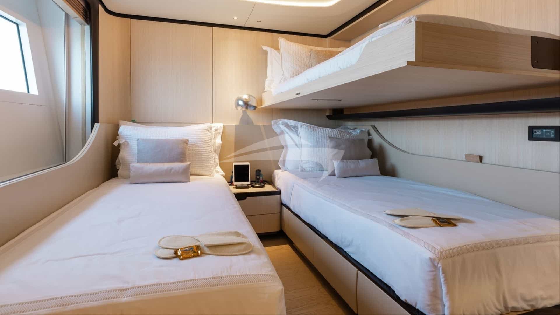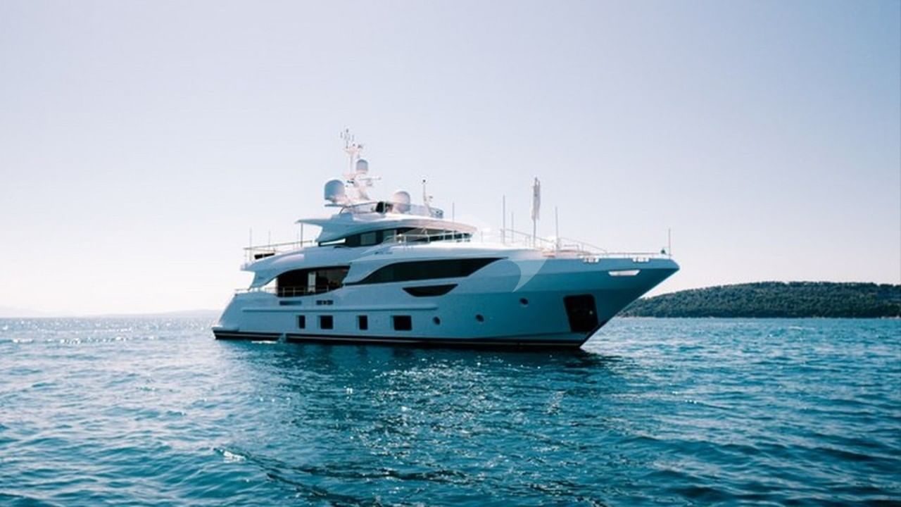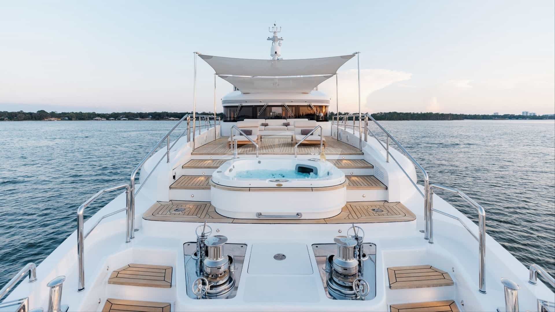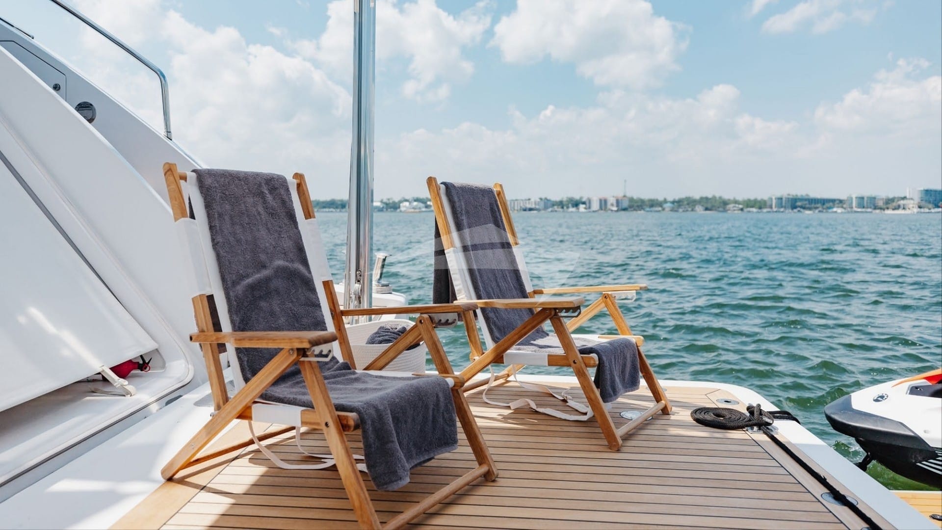 Amenities on board for the charter guests include Air Conditioning, Beach club, Jacuzzi on deck, Stabilisers At Anchor, Sun pads, Sun Deck, Swim platform and Tender Garage.