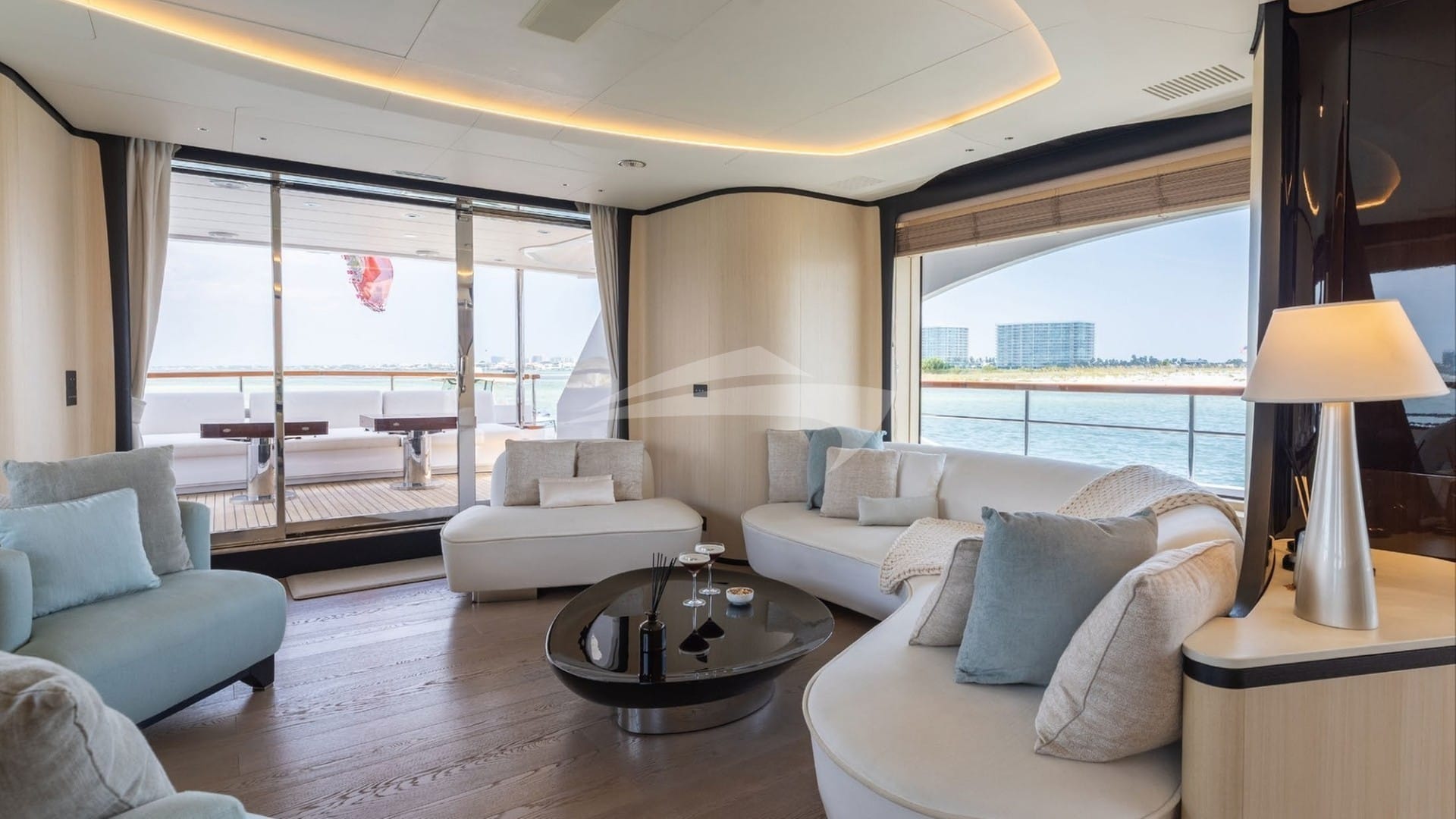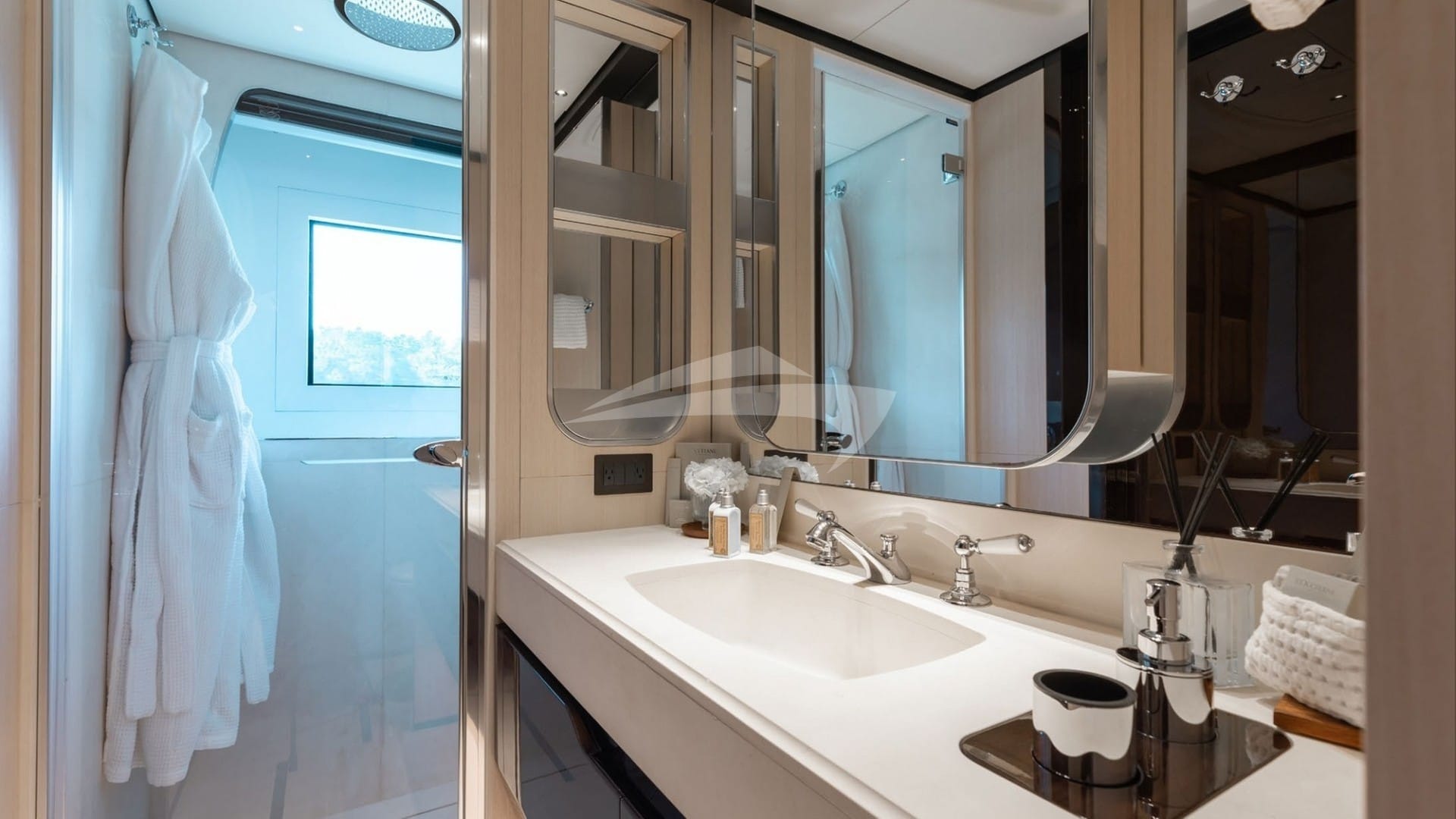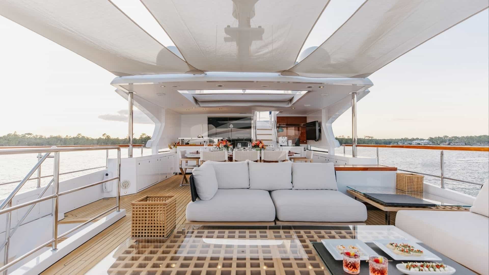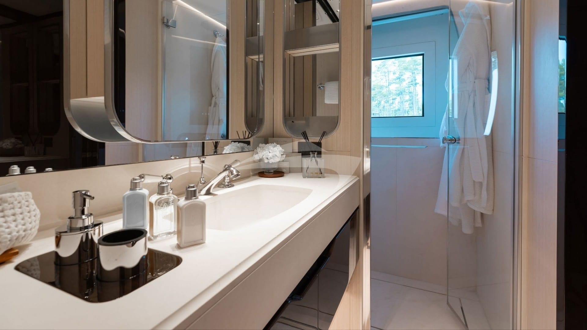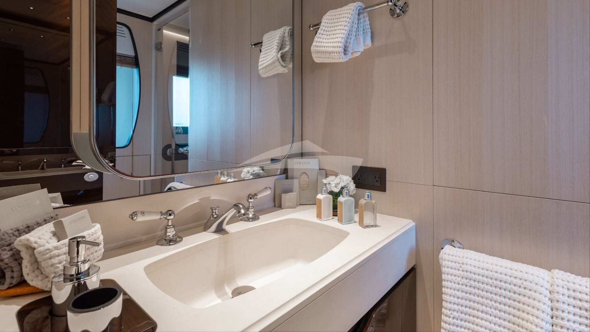 Amenities on board for the charter guests include Air Conditioning, Beach club, Jacuzzi on deck, Stabilisers At Anchor, Sun pads, Sun Deck, Swim platform and Tender Garage.