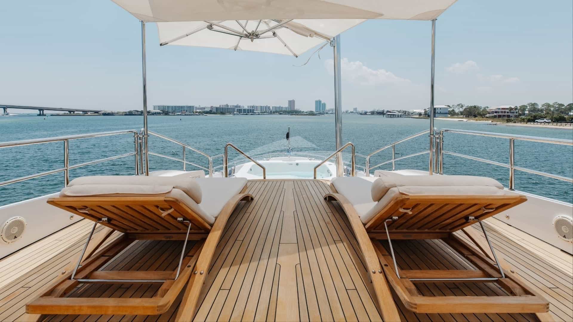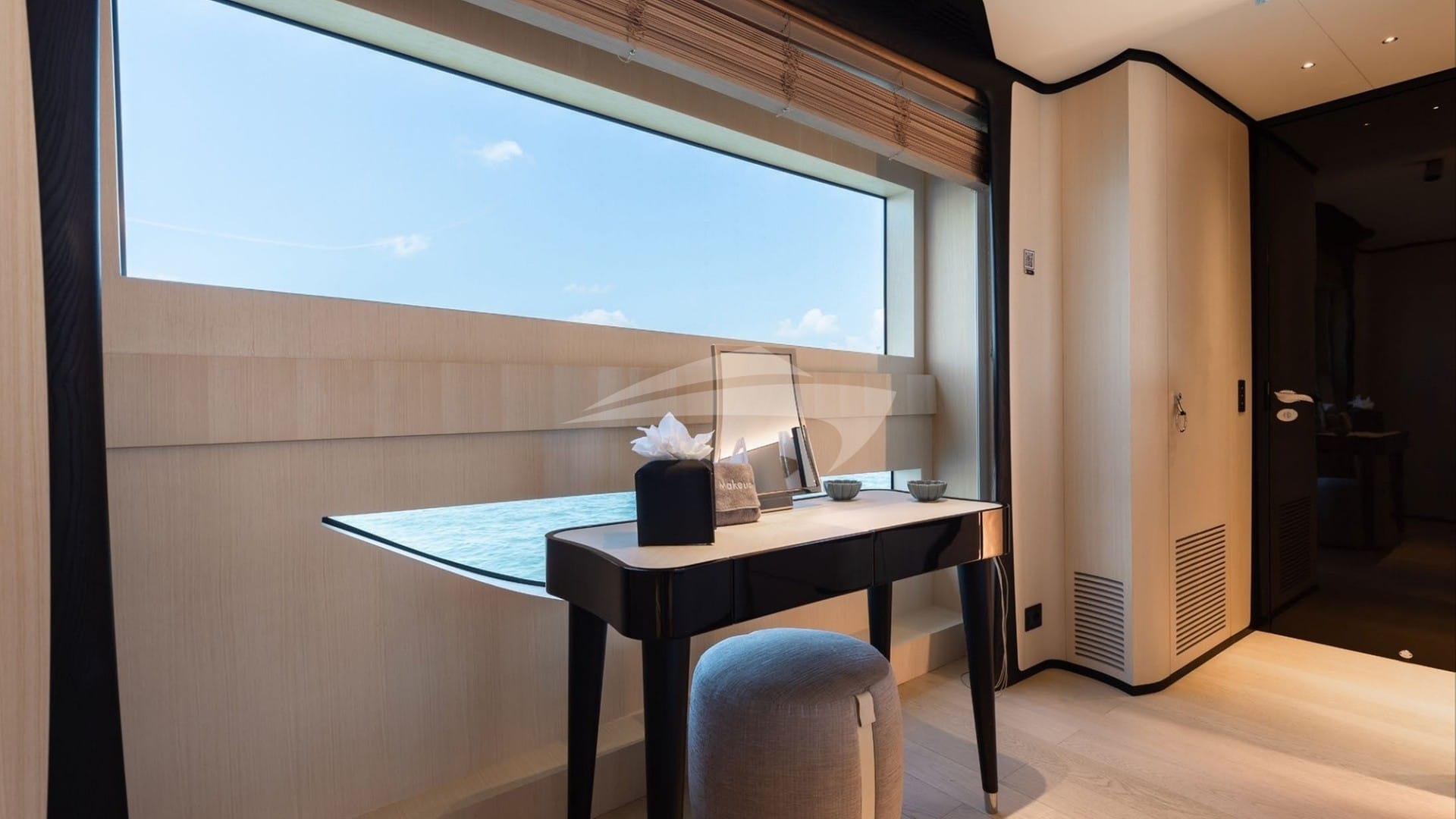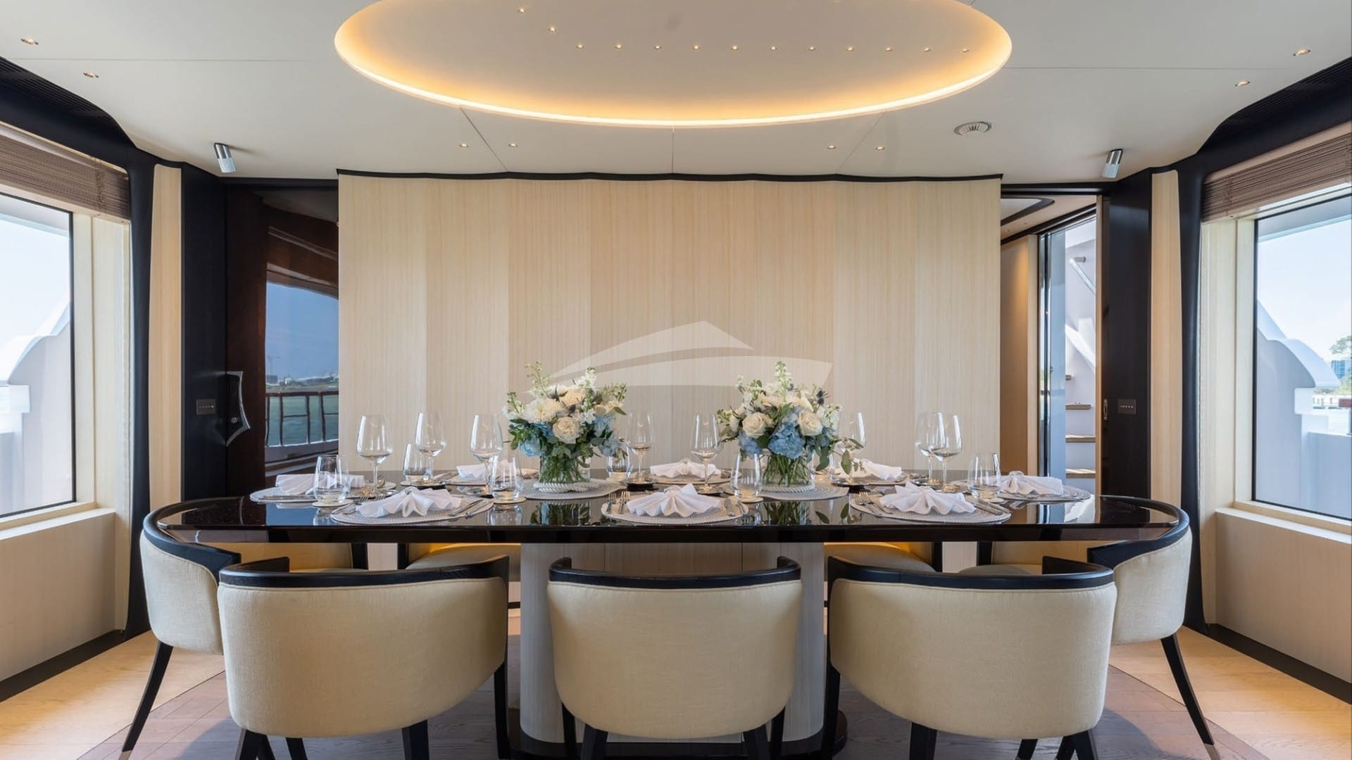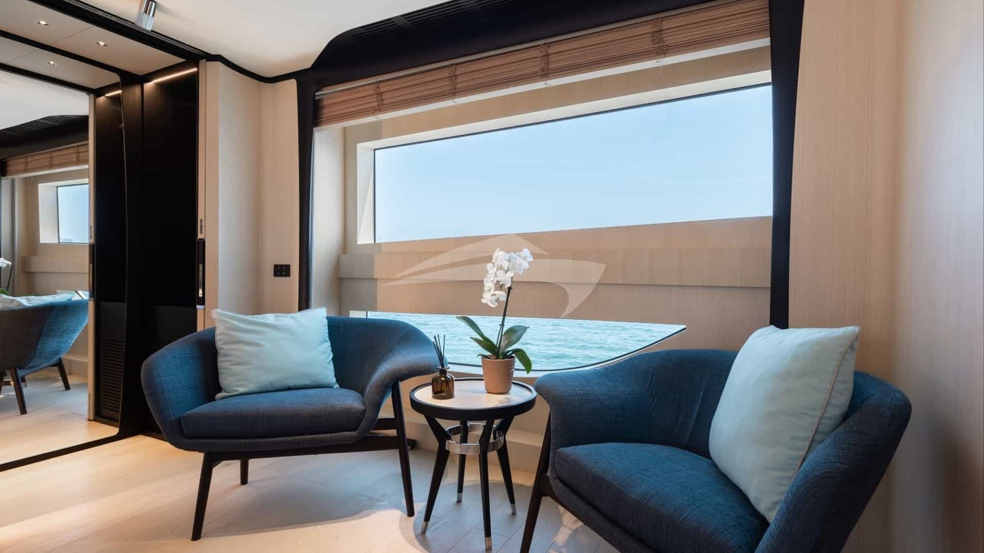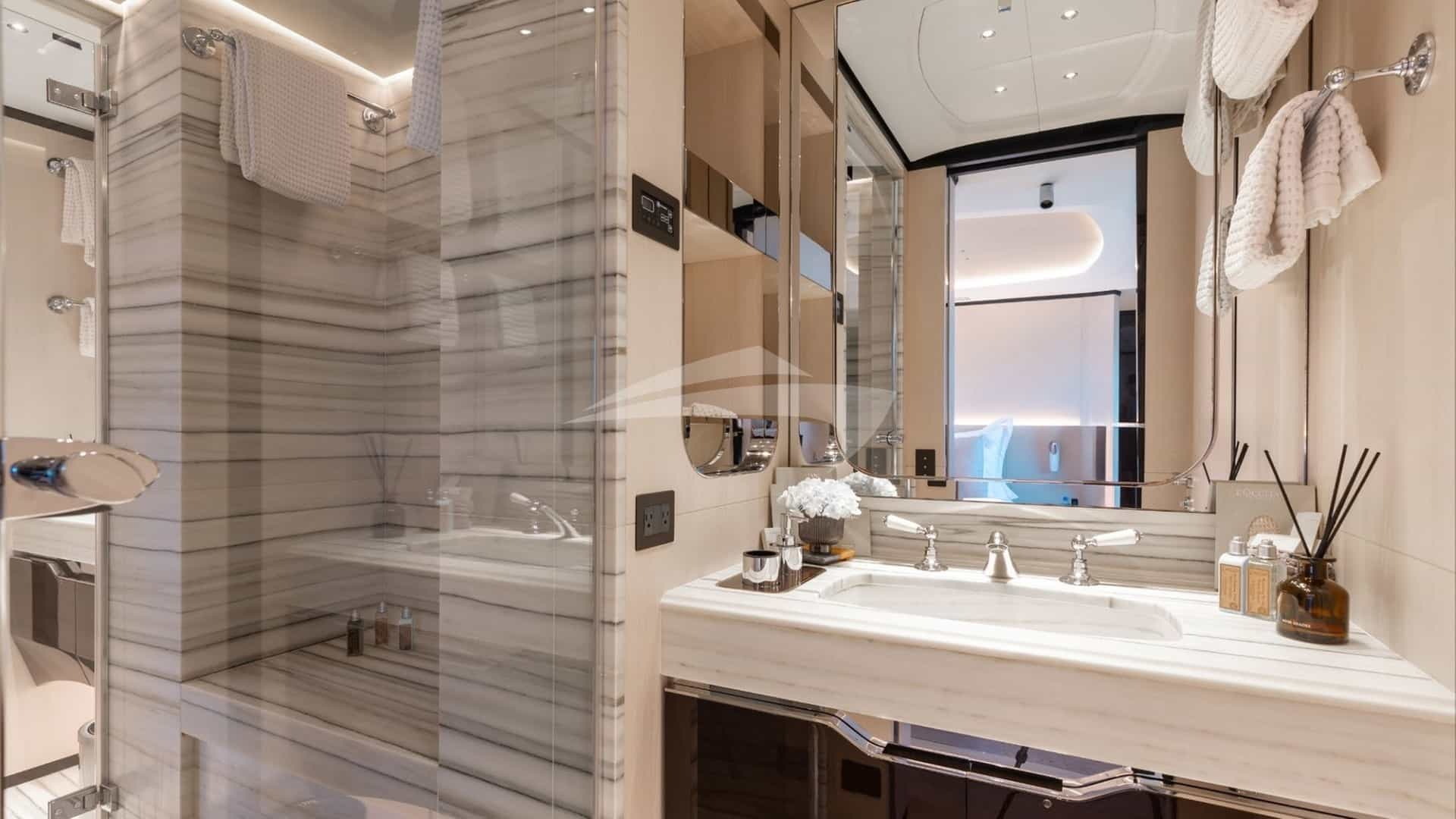 Amenities on board for the charter guests include Air Conditioning, Beach club, Jacuzzi on deck, Stabilisers At Anchor, Sun pads, Sun Deck, Swim platform and Tender Garage.