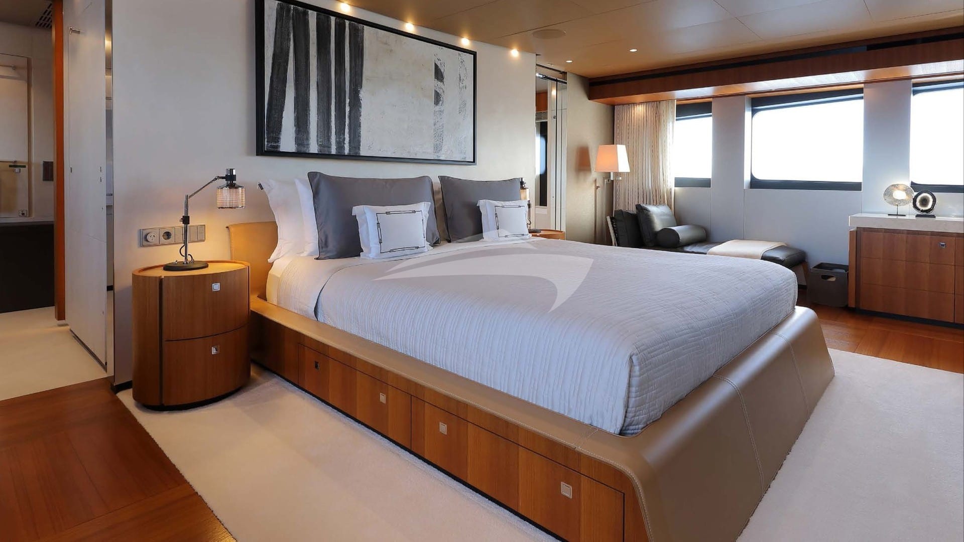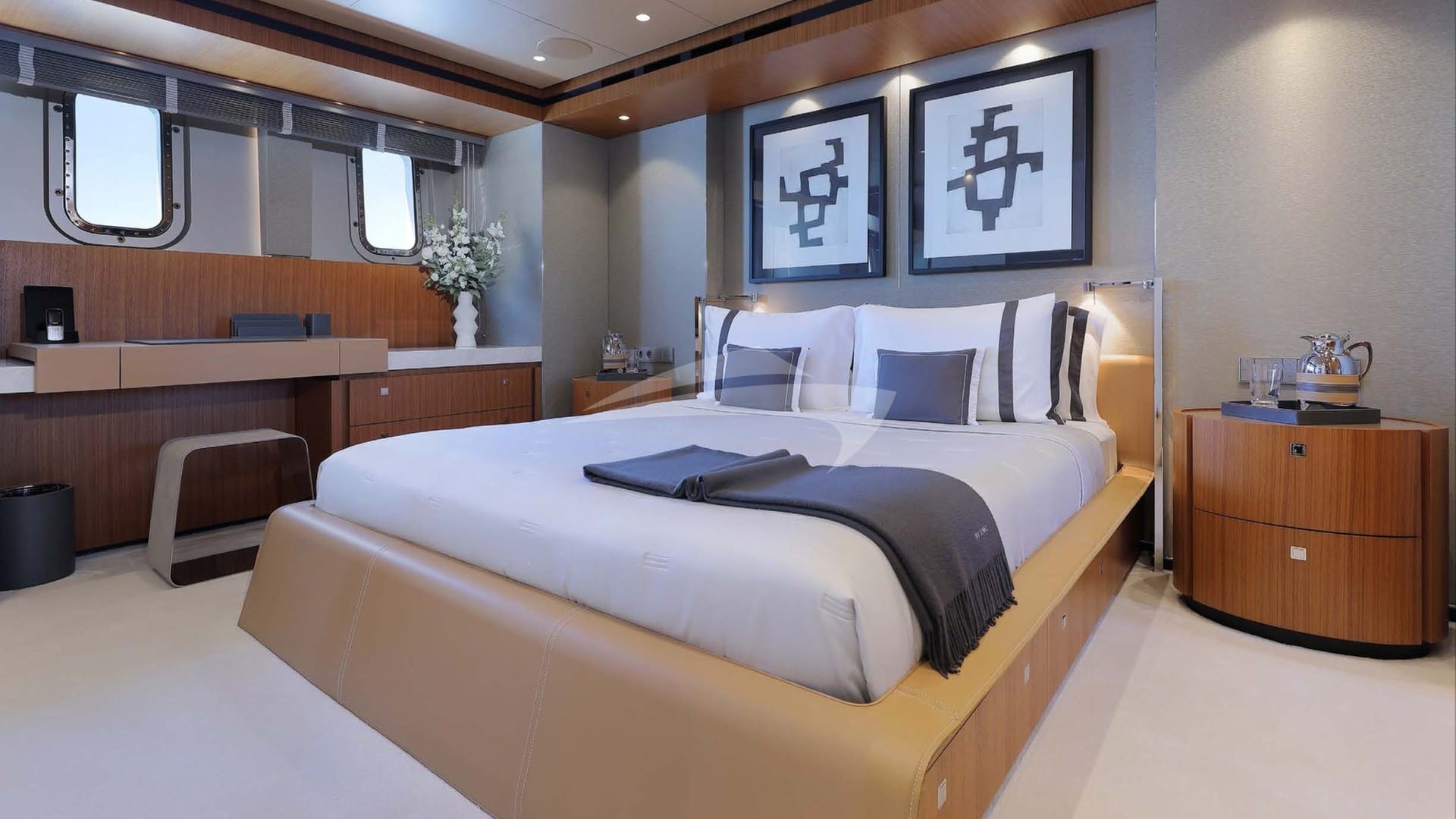 The guest cabins comprise a primary suite with a king size bed and en-suite bathroom facilities, a VIP suite with a king size bed and en-suite bathroom facilities, 2 cabins with a double bed and en-suite bathroom facilities and 2 cabins with a twin bed and en-suite bathroom facilities.