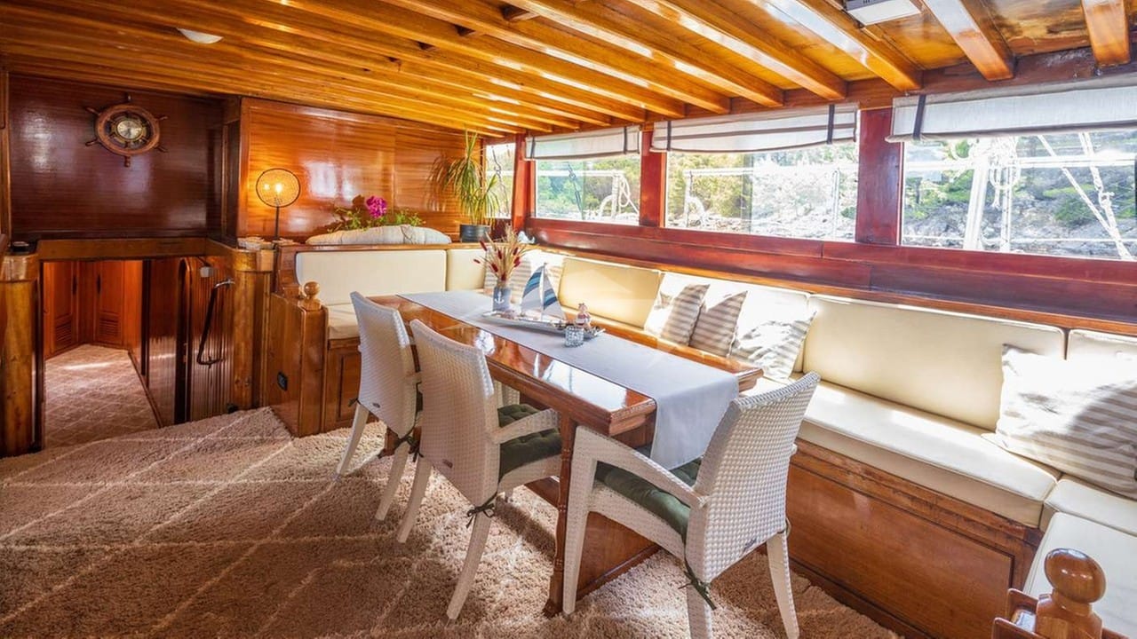 Amenities on board for the charter guests include Air Conditioning, Outdoor shower, Indoor audio system, TV saloon and Wi-Fi.