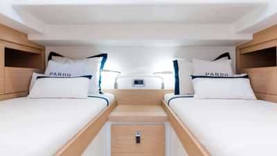 QUEEN LIA II can accommodate 4 guests in 2 cabins consisting of a primary suite with a queen size bed and en-suite bathroom facilities and a cabin with a twin bed .
