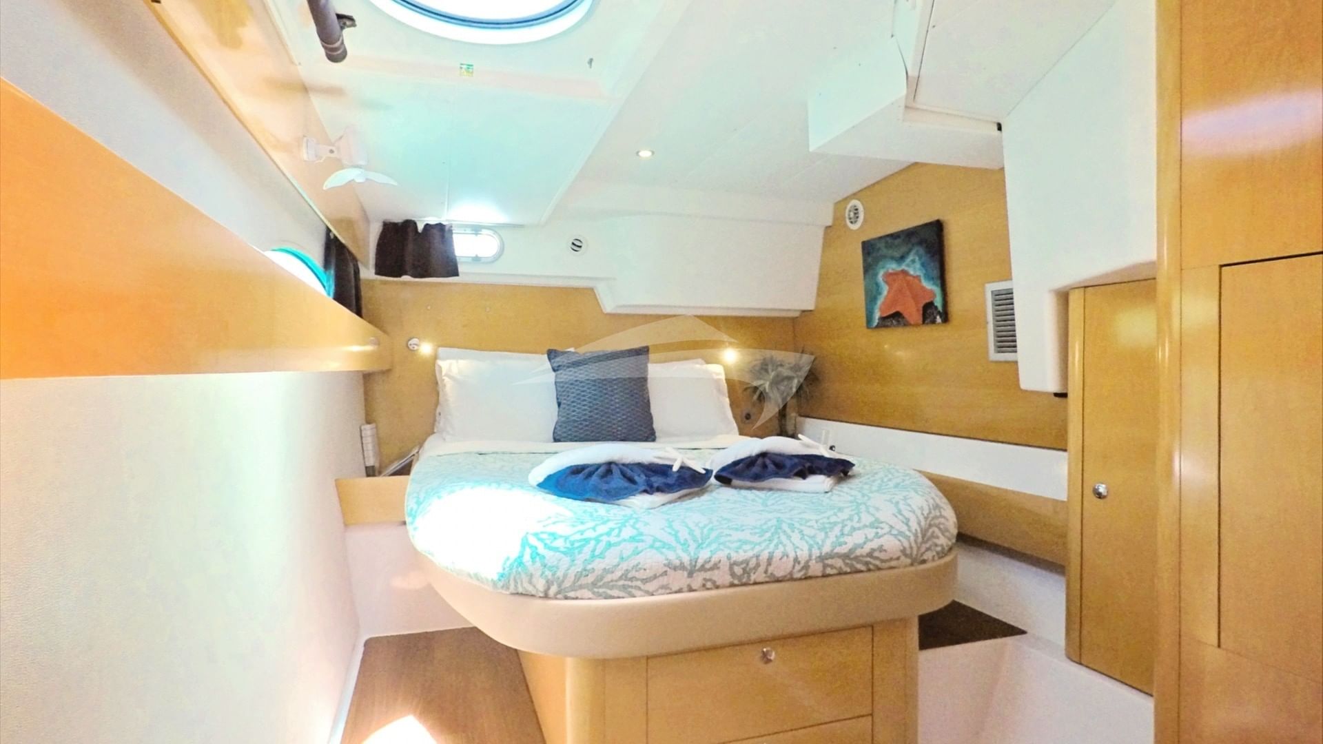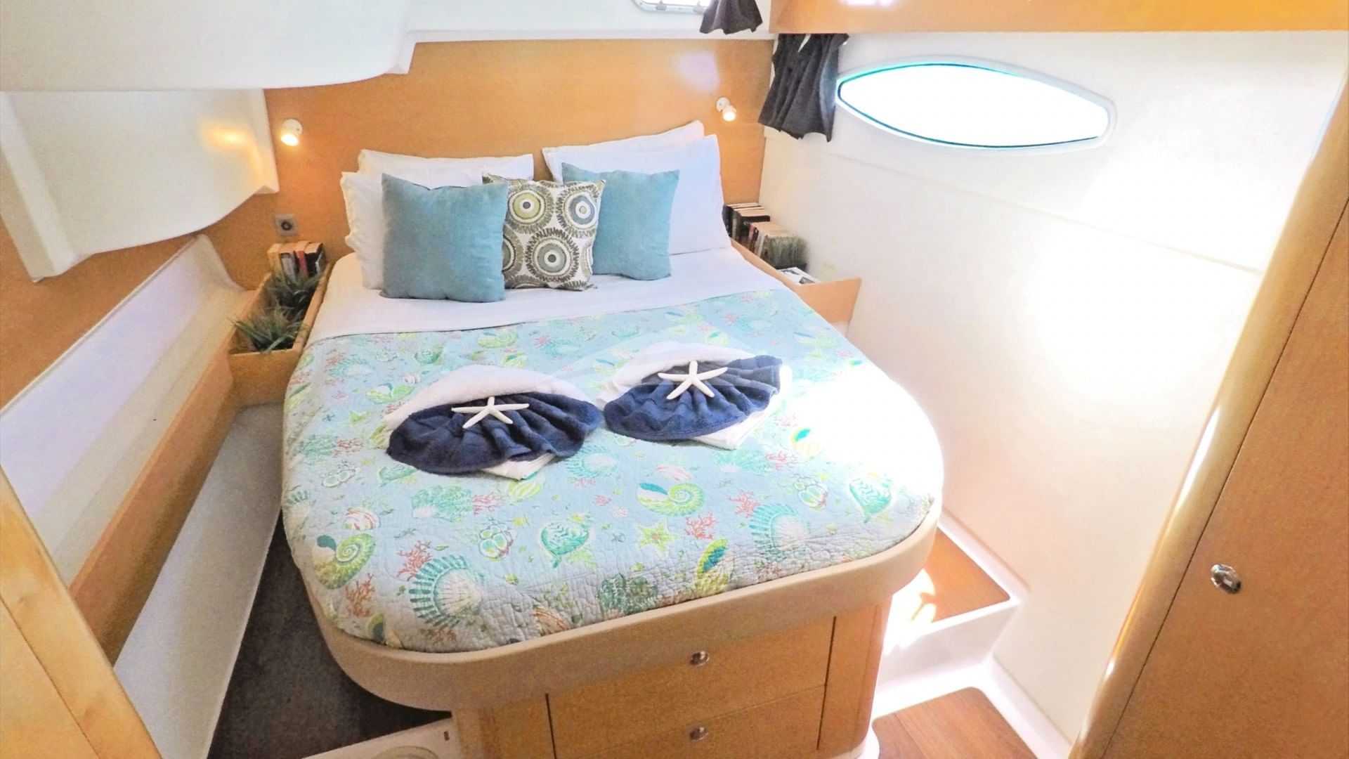 SWEETEST THING can accommodate 6 guests in 5 cabins consisting of a primary suite with a queen size bed and en-suite bathroom facilities located aft, 2 cabins with a queen size bed and en-suite bathroom facilities, a cabin with a single bed and a cabin with a single bed .