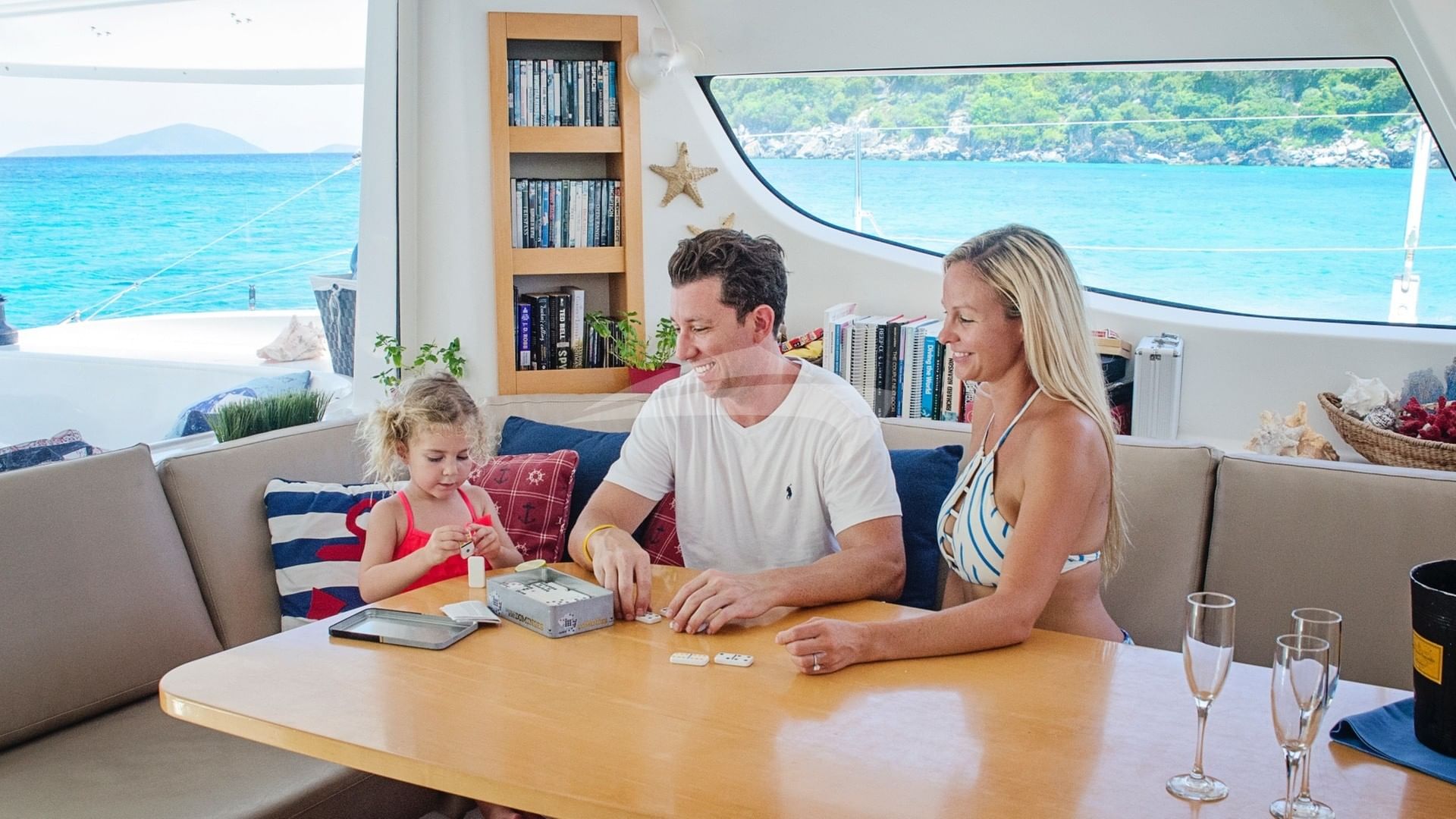 Amenities on board include Air Conditioning, BBQ, Outdoor shower, Light fishing gear, Games console, Indoor audio system, iPod dock, Local TV, Special diets, Swim platform, TV all cabins, TV saloon and Wi-Fi.