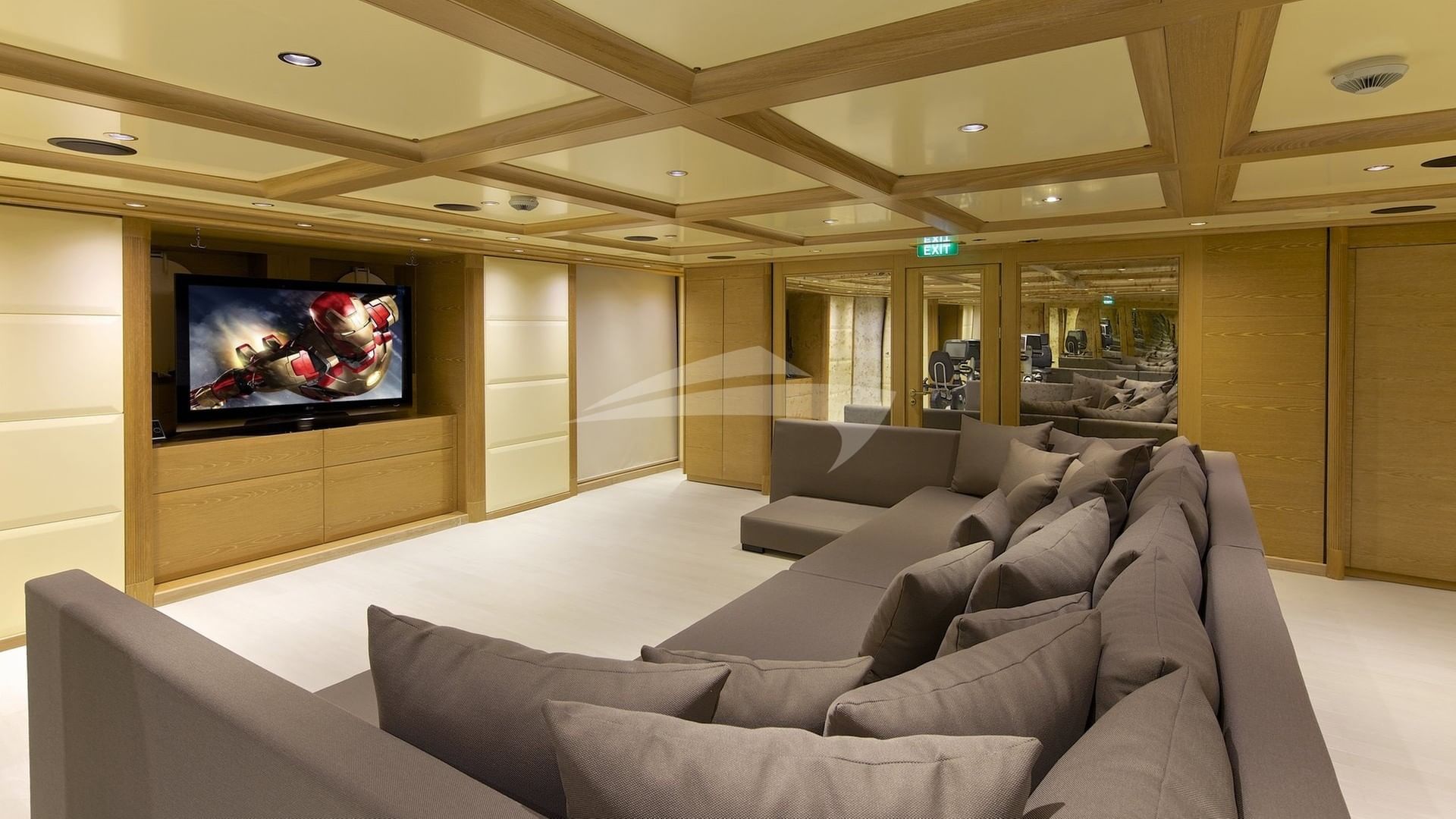 Amenities on board for the charter guests include Air Conditioning, Movie Theatre, Exercise equipment, Light fishing gear, Games console, Indoor audio system, Jacuzzi on deck, Local TV, Satellite Communications, Satellite TV, Stabilisers, Swim platform, TV all cabins, TV saloon and Wi-Fi.