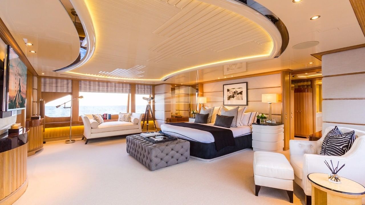AIR can accommodate 12 guests in 7 cabins consisting of a primary suite with a king size bed and en-suite bathroom facilities, 2 cabins with a queen size bed and en-suite bathroom facilities, a cabin with a double bed and en-suite bathroom facilities, 2 cabins with a single bed and en-suite bathroom facilities and a cabin with a twin bed and en-suite bathroom facilities.