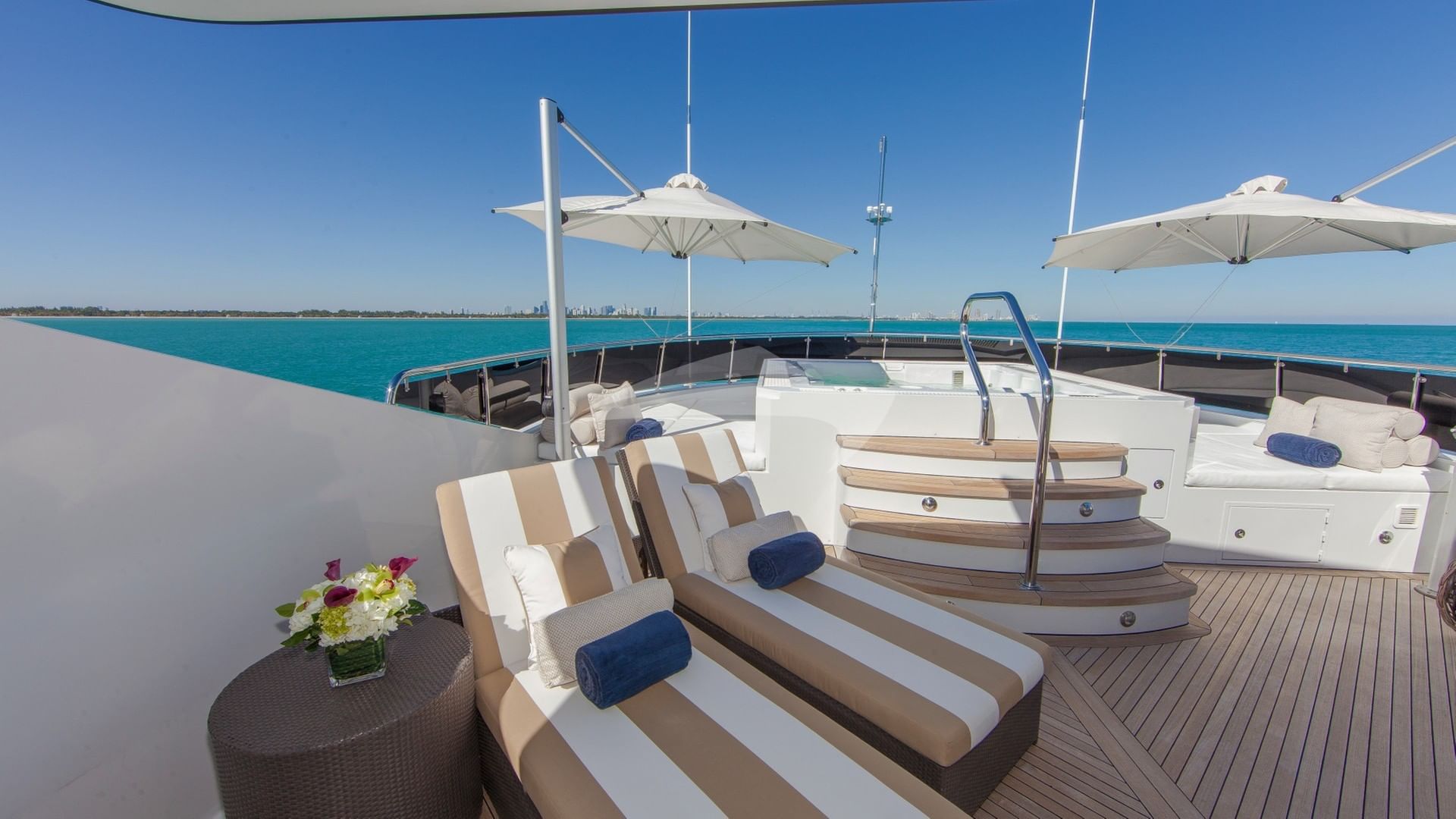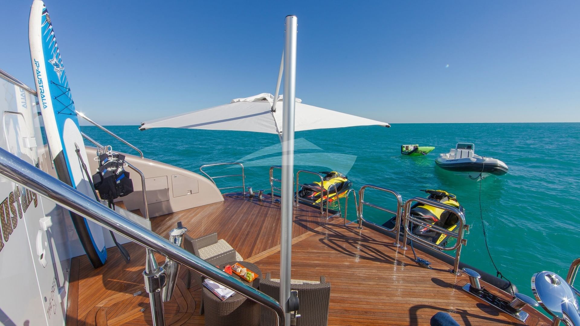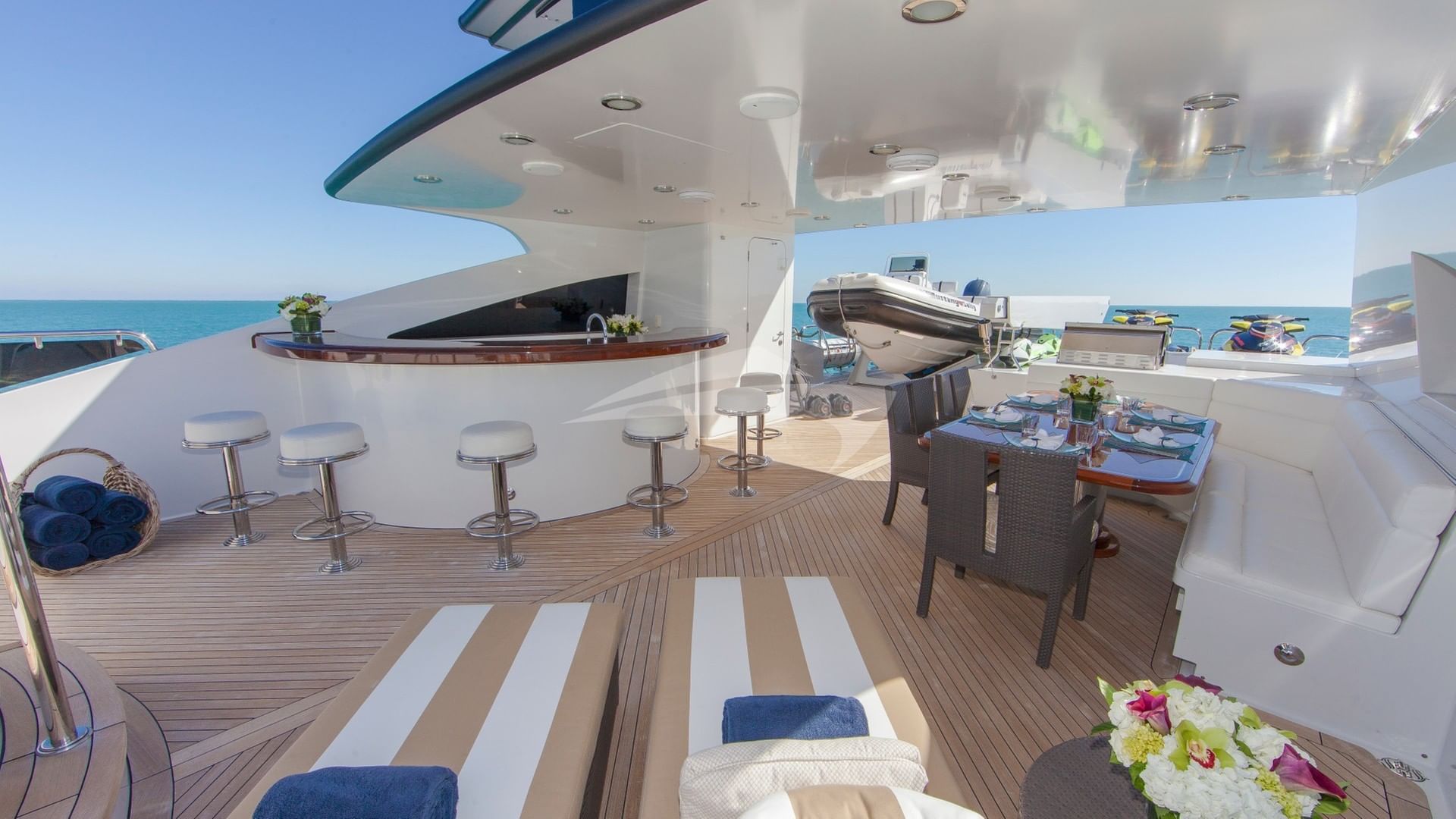Amenities on board include Air Conditioning, BBQ, Coffee machine, Outdoor shower, Exercise equipment, Ice maker, iPod dock, Jacuzzi in primary cabin, Jacuzzi on deck, Stabilisers At Anchor, Sun pads, Sun loungers, Swim platform, TV all cabins, TV primary cabin, TV outdoor, TV saloon, Water maker and Wi-Fi.