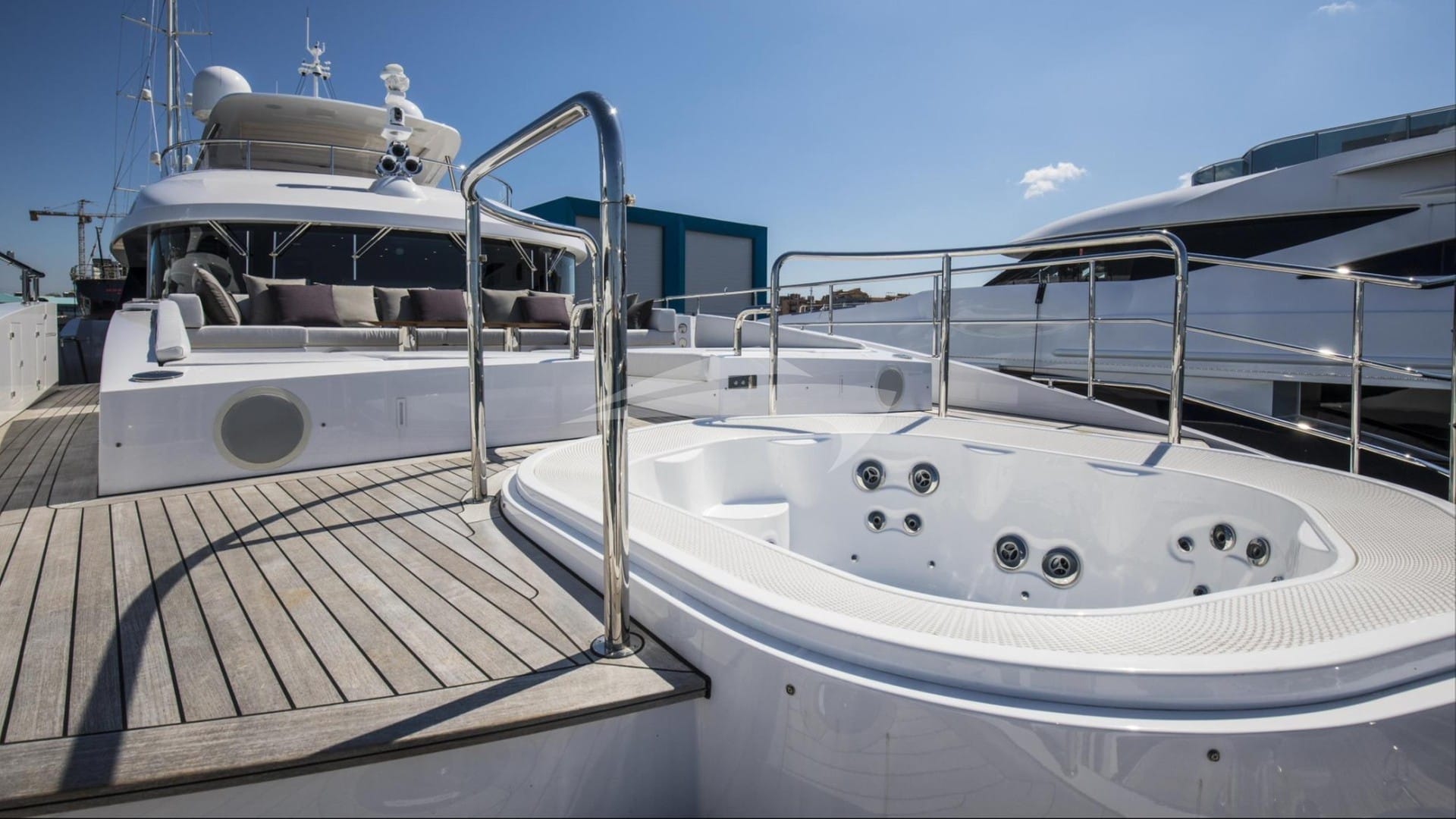 Amenities on board include Air Conditioning, BBQ, Exercise equipment, Gym, Indoor audio system, Jacuzzi on deck, Satellite TV, Stabilisers, Swim platform, TV all cabins and Wi-Fi.