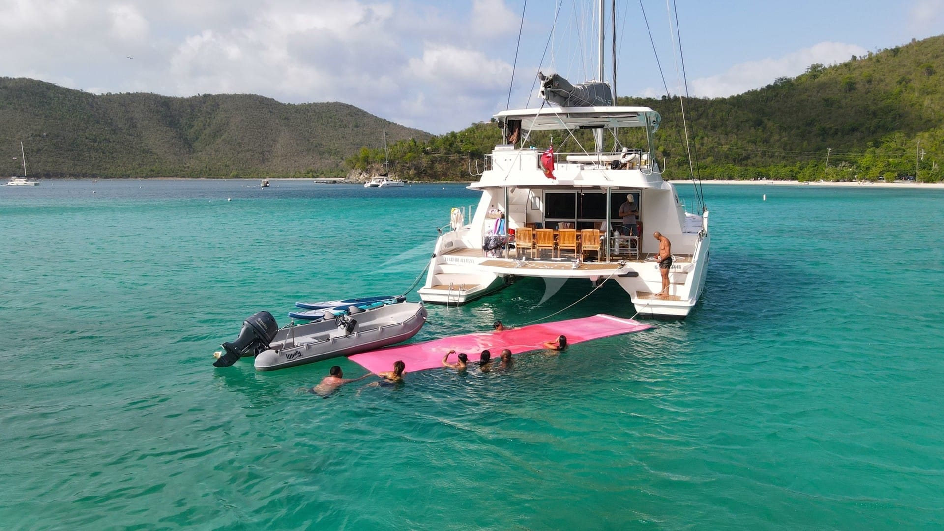Las comodidades a bordo incluyen aire acondicionado, barbacoa, ducha exterior, máquina de hielo, sistema de audio interior, soporte para iPod, plataforma de baño, sala de TV y Wi-Fi.