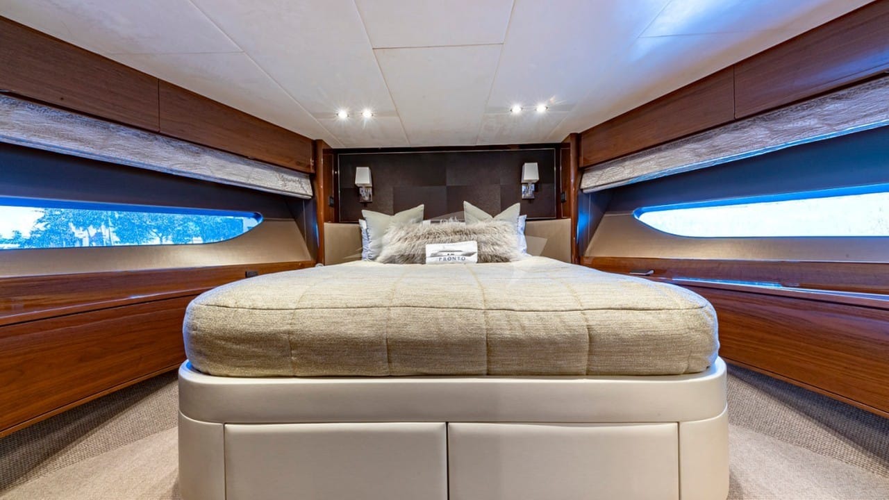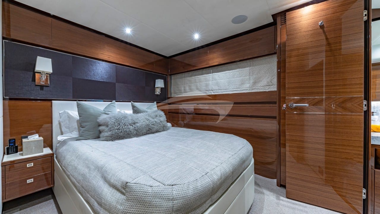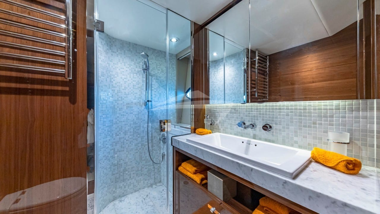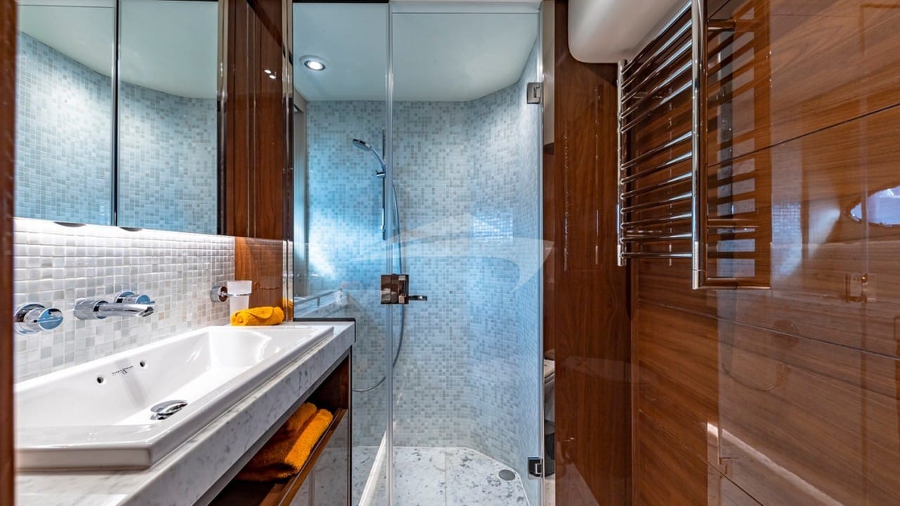 PRONTO tiene capacidad para 9 personas en 4 cabinas que consisten en una suite principal con cama doble y baño privado, una suite VIP con cama doble y baño privado, cabina con cama doble y baño privado y cabina con 2 camas individuales y 1 cama pullman y baño privado. instalaciones de baño.