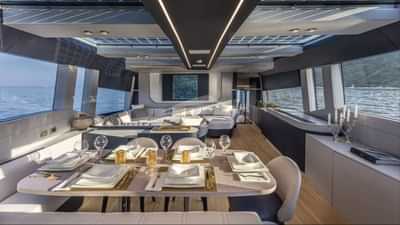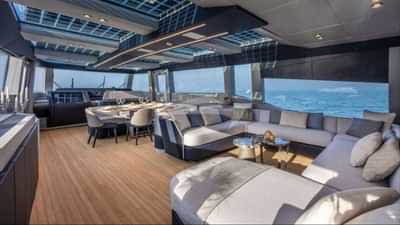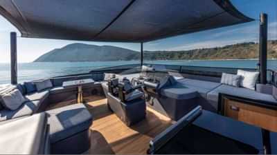 Las comodidades a bordo para los huéspedes del chárter incluyen aire acondicionado, club de playa, sistema de audio interior, estabilizadores anclados, tumbonas y plataforma de baño.