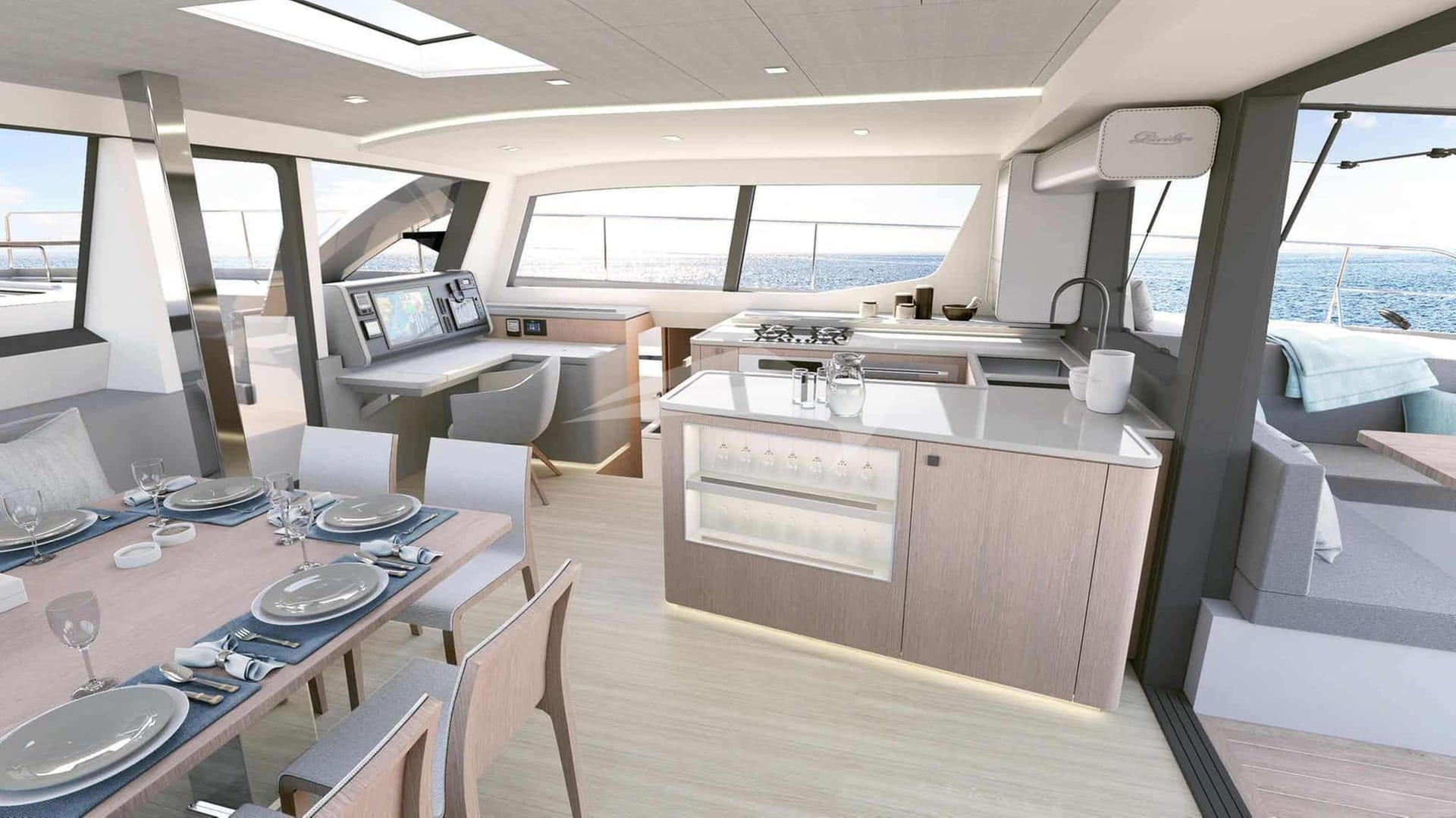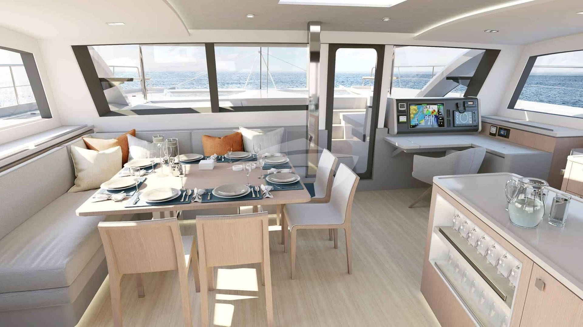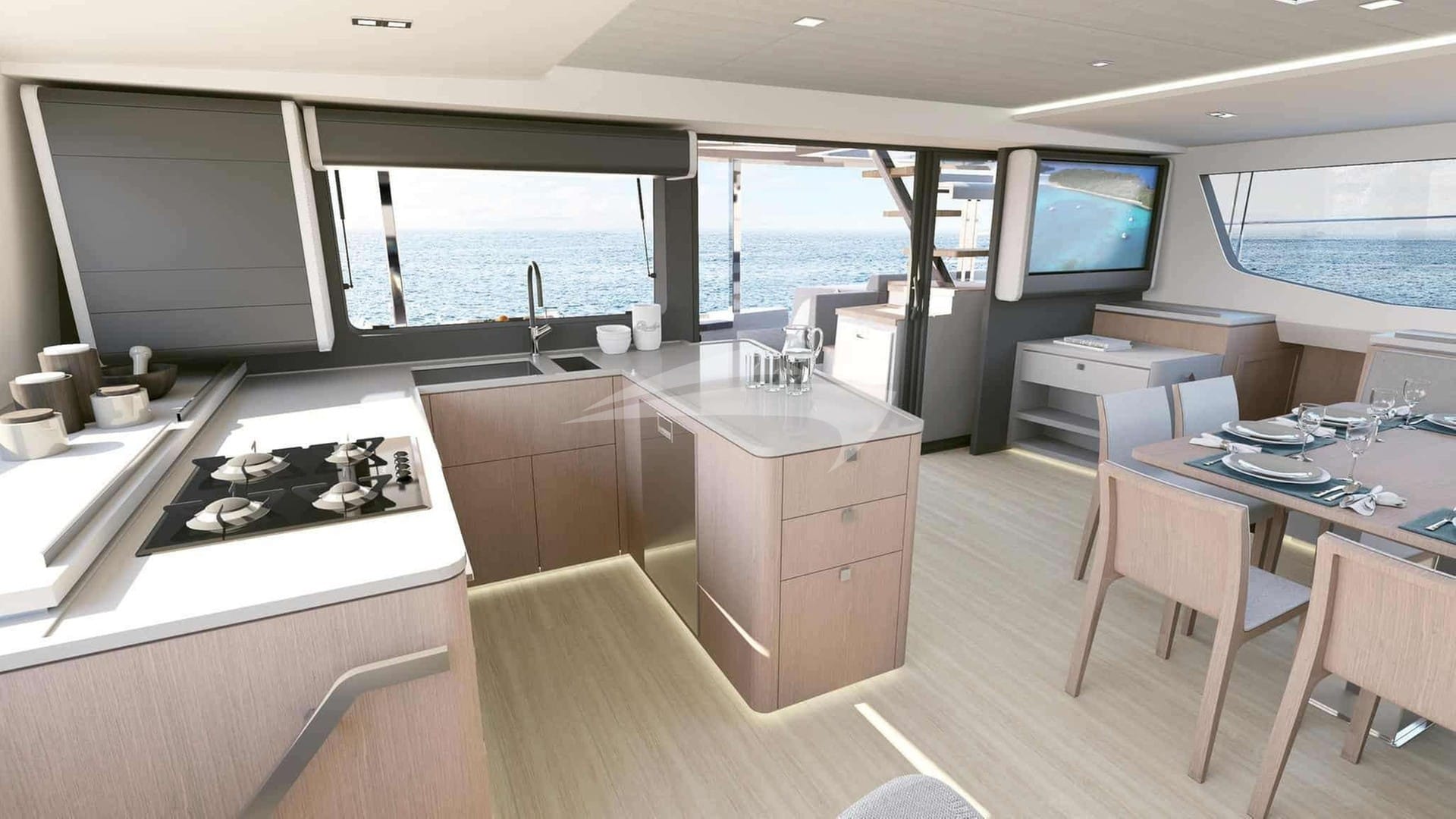 Las comodidades a bordo incluyen aire acondicionado, ducha exterior, sistema de audio interior, soporte para iPod, sala de TV y Wi-Fi.