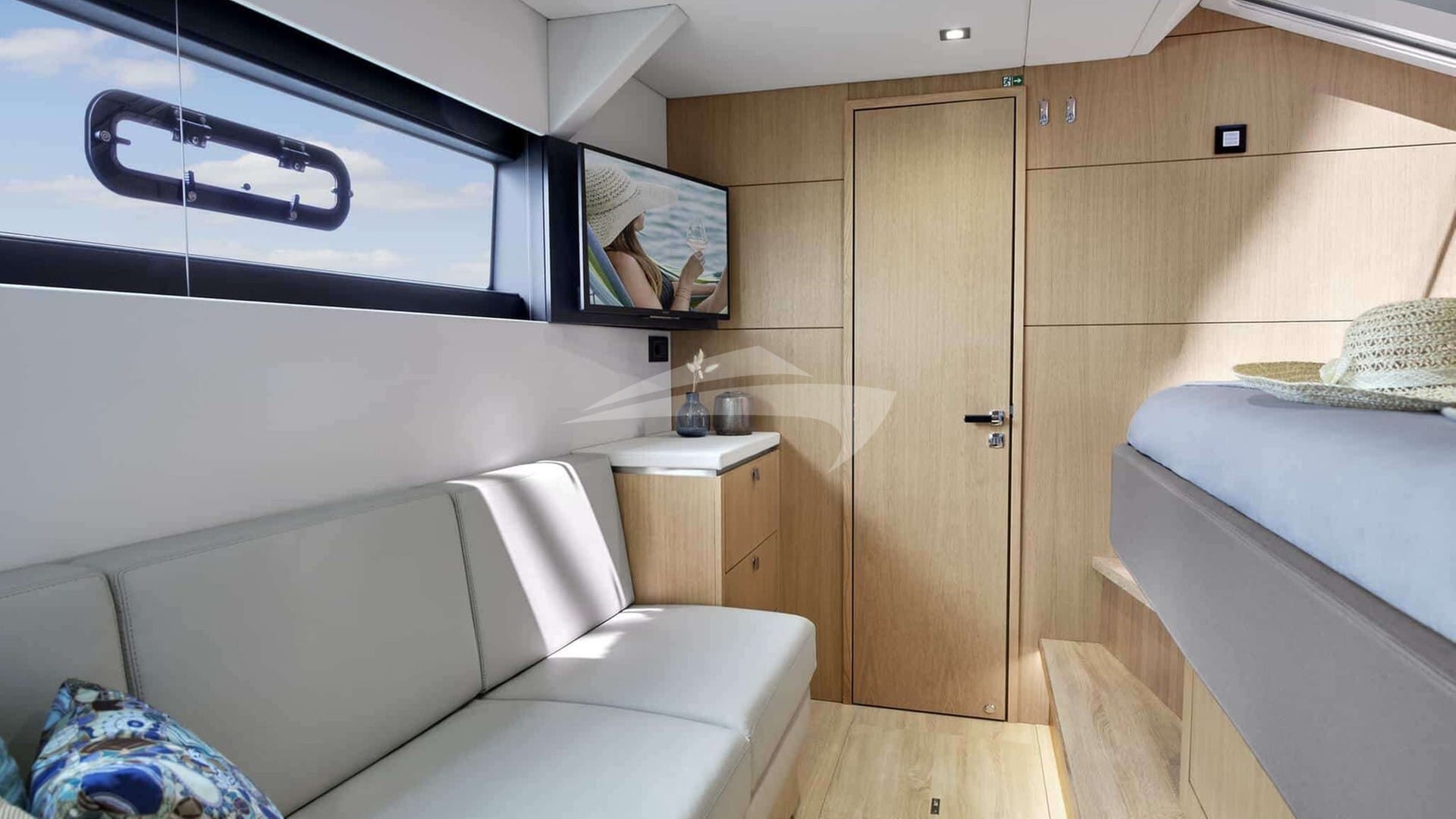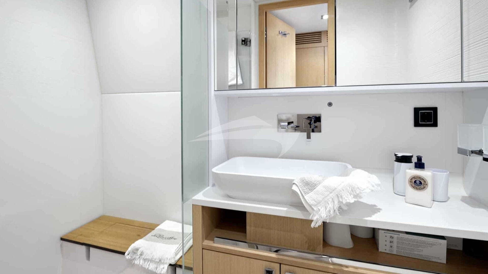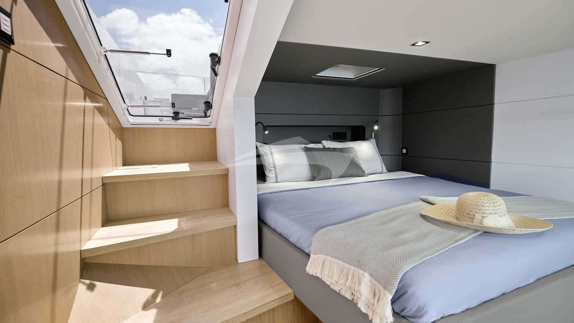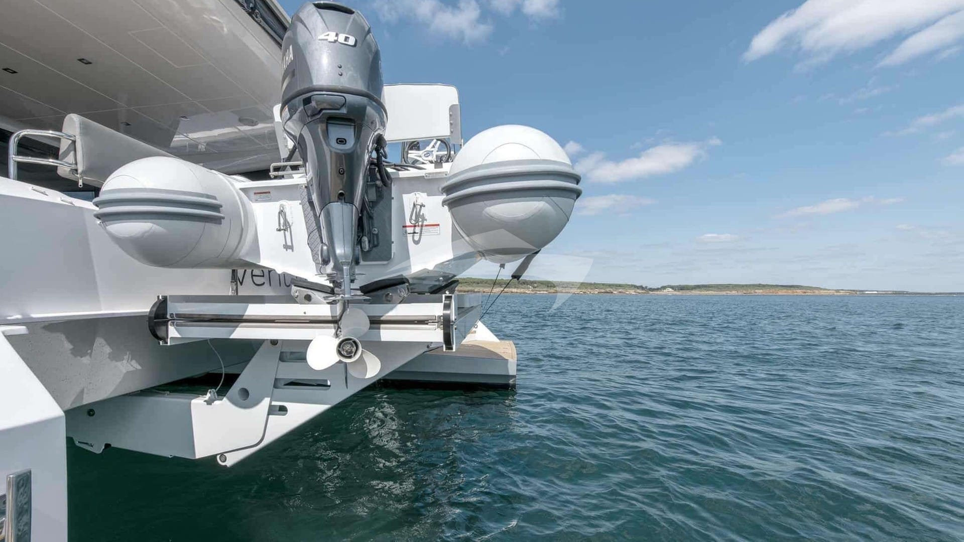 Las comodidades a bordo incluyen aire acondicionado, ducha exterior, sistema de audio interior, soporte para iPod, sala de TV y Wi-Fi.