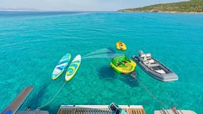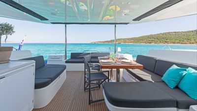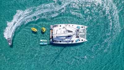 Las comodidades a bordo para los huéspedes del chárter incluyen aire acondicionado, plataforma de baño, barbacoa, máquina de agua y Wi-Fi.