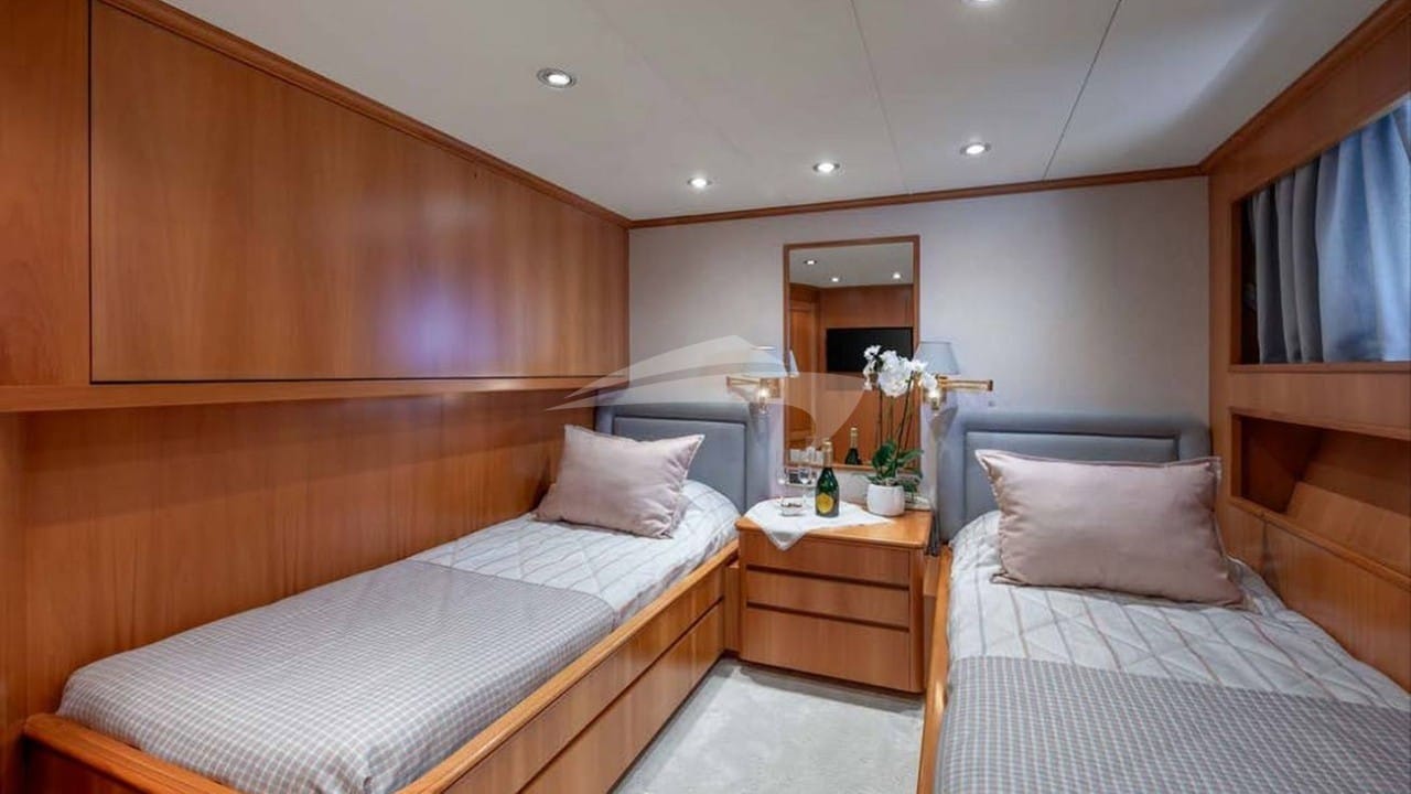 Las cabinas de huéspedes comprenden una suite principal con una cama king size y baño privado, una suite VIP con una cama king size y baño privado, 2 cabinas con una cama individual y una cama pullman y baño privado y una cabina con una cama individual y baño privado.