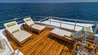 Las comodidades a bordo para los huéspedes del chárter incluyen aire acondicionado, jacuzzi en la cubierta, bar al aire libre, estabilizadores, estabilizadores anclados, sombrillas, terraza para tomar el sol, plataforma de baño y Wi-Fi.