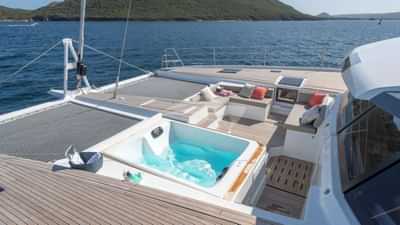 Las comodidades a bordo para los huéspedes del chárter incluyen aire acondicionado, barbacoa, ducha exterior, gimnasio, sistema de audio interior, soporte para iPod, jacuzzi en la cubierta, plataforma de baño, sala de TV y Wi-Fi.