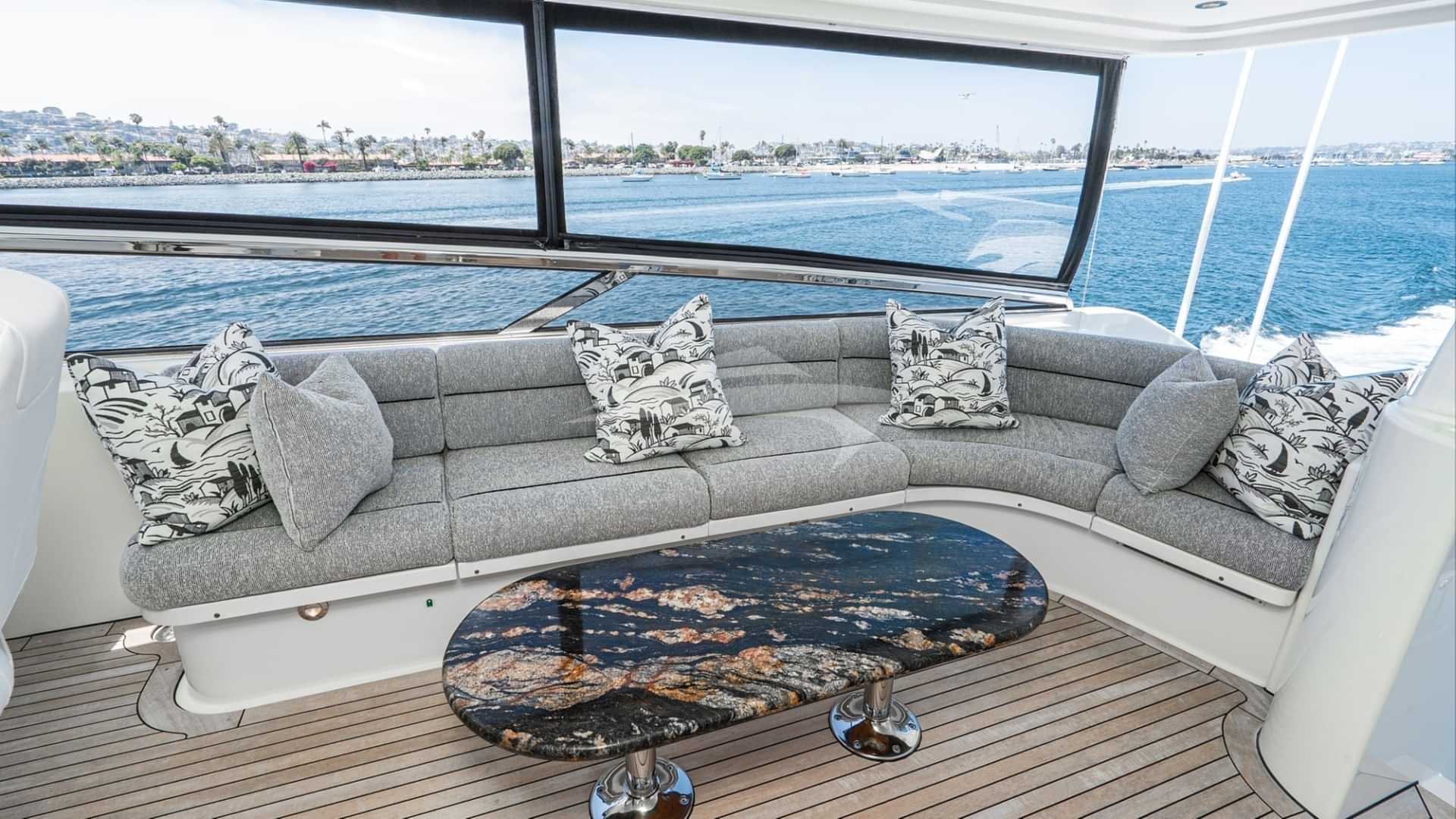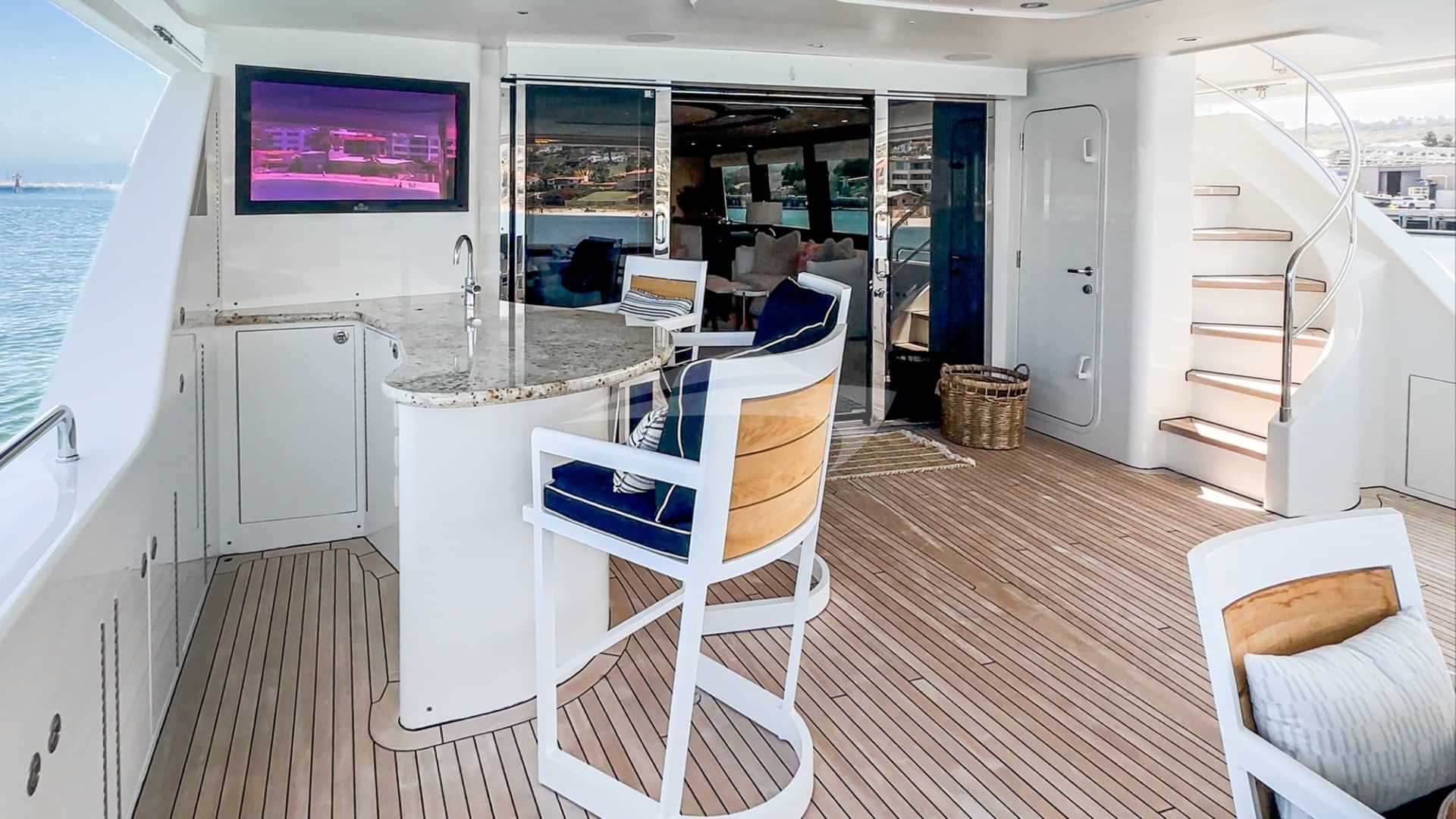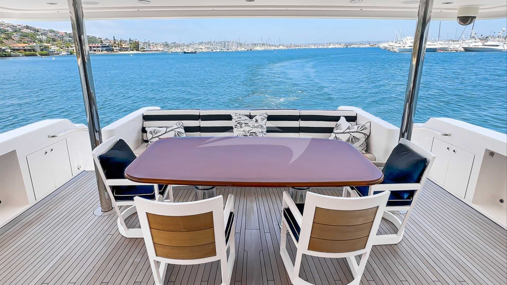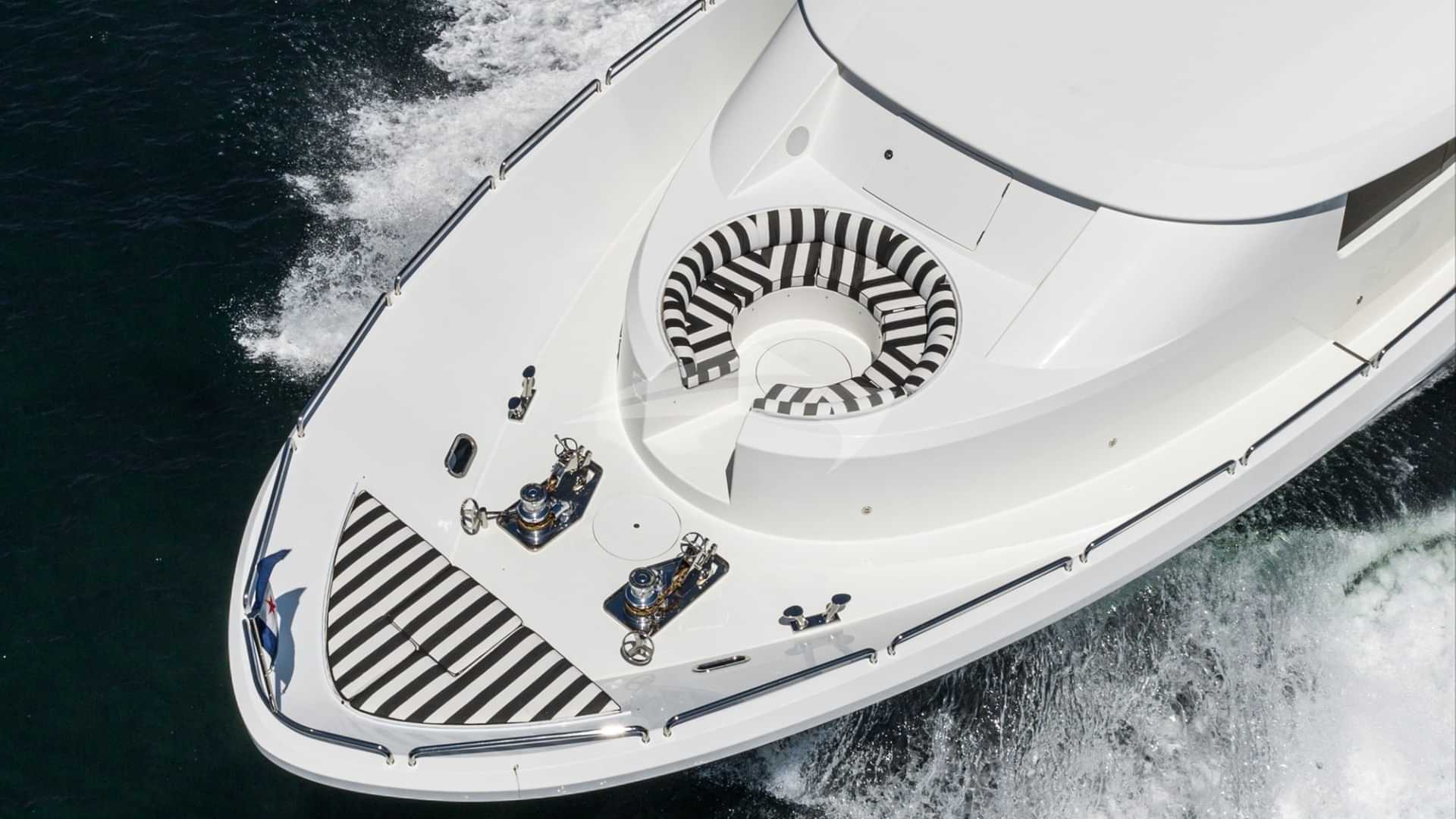 Los servicios a bordo para los huéspedes del chárter incluyen barbacoa, hélice de proa, ducha exterior, equipo de pesca ligero, máquina de hielo, jacuzzi en la cubierta, sistema de audio exterior, bar exterior, estabilizadores, transmisión de contenido multimedia en línea, sombrillas, tumbonas, plataforma de baño, TV en todas las cabinas, TV exterior, salón de TV, máquina de agua y Wi-Fi.