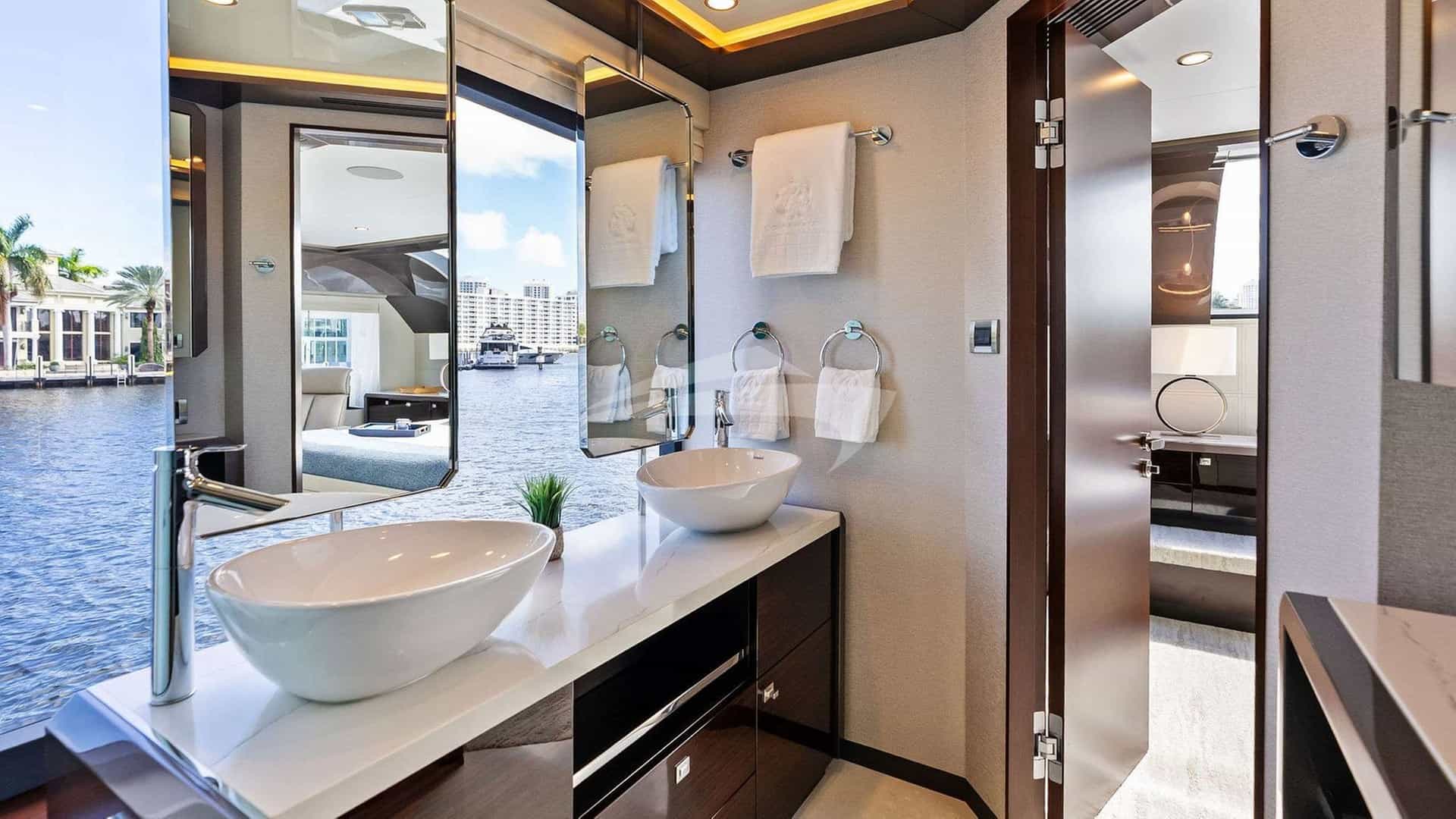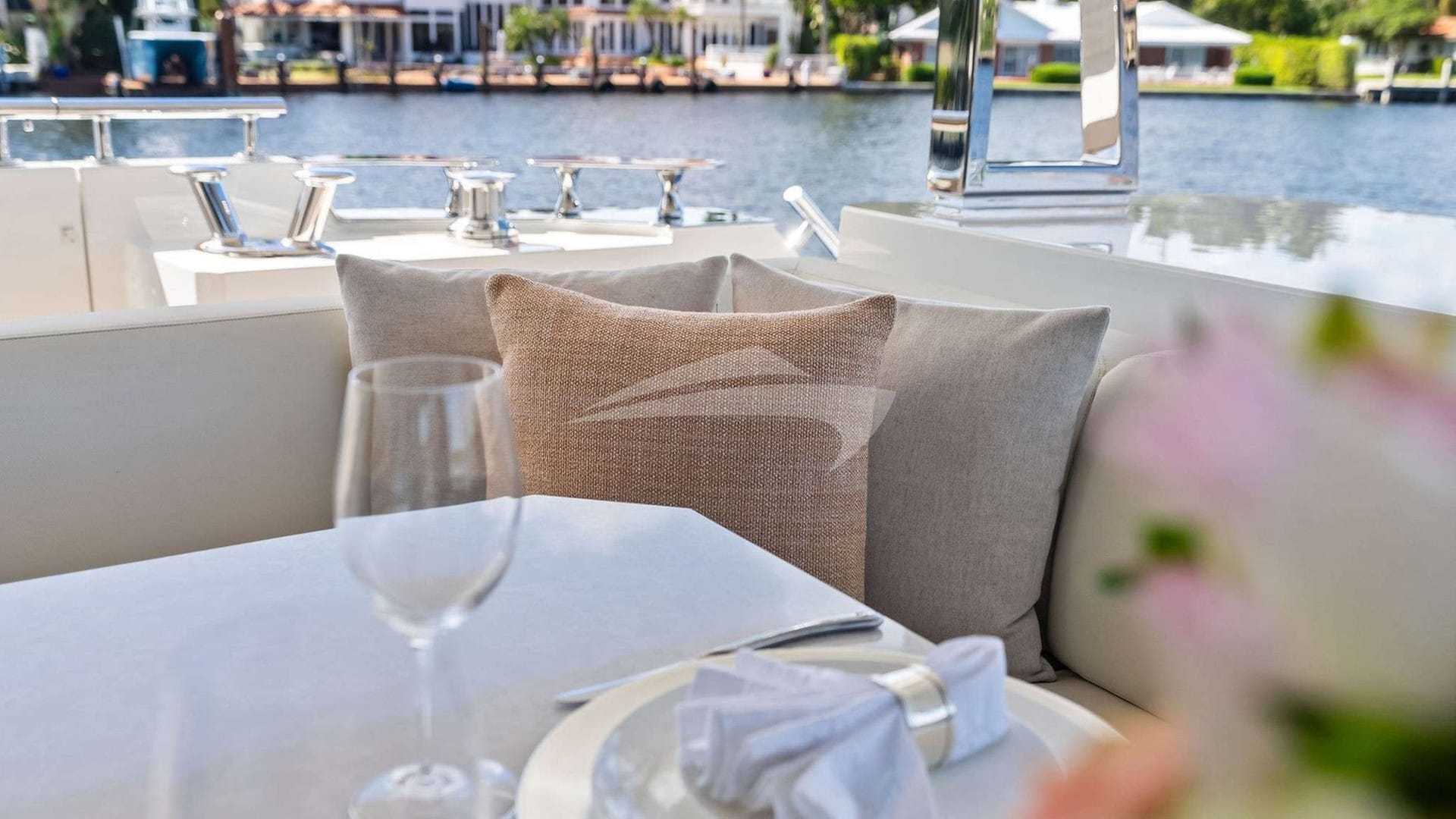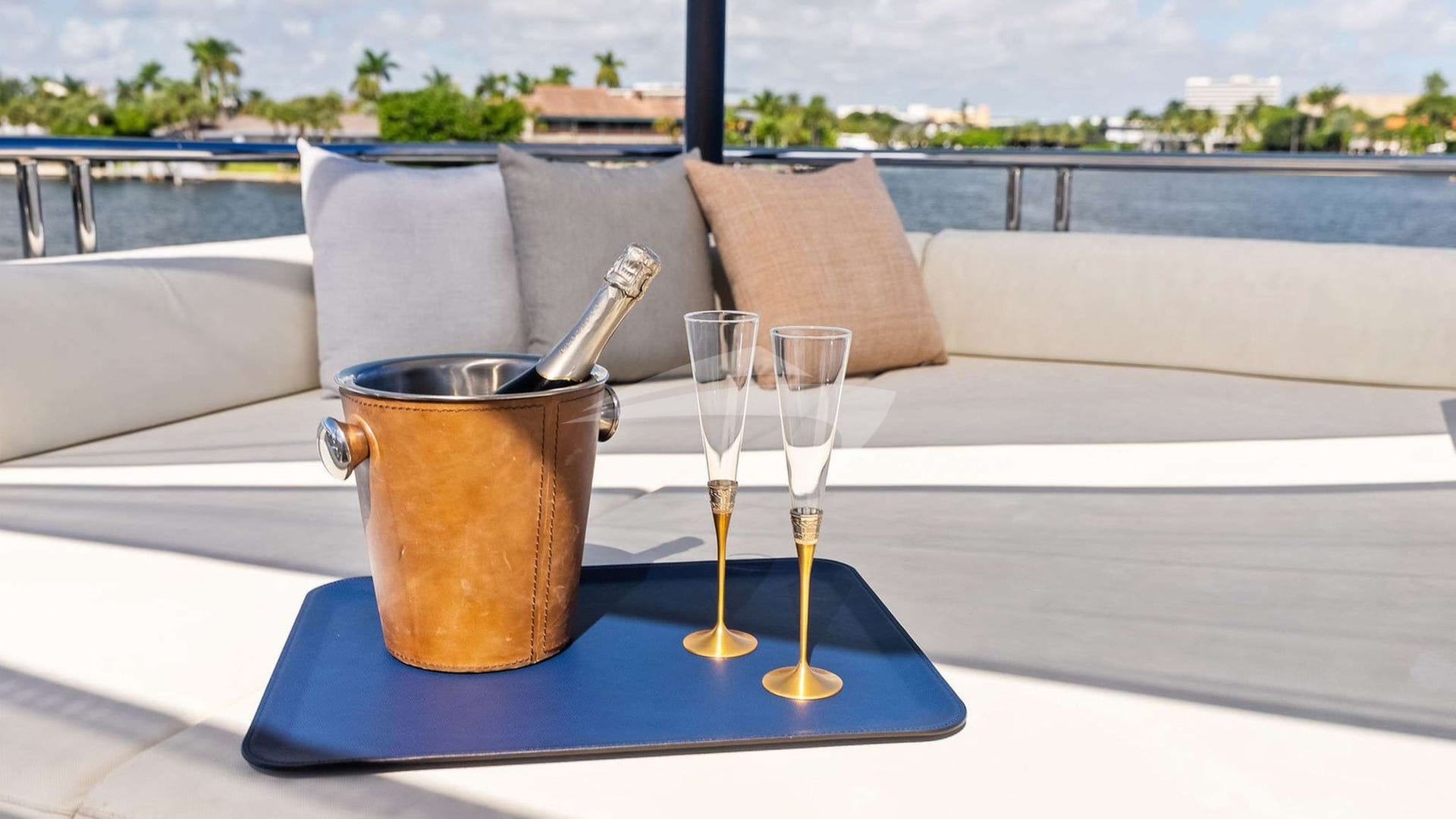 Las comodidades a bordo para los huéspedes del chárter incluyen aire acondicionado, barbacoa, ducha exterior, equipo de pesca ligero, gimnasio, sistema de audio interior, estación de conexión para iPod, jacuzzi en la cubierta, TV vía satélite, estabilizadores anclados, plataforma de baño, sala de televisión y Wi-Fi.