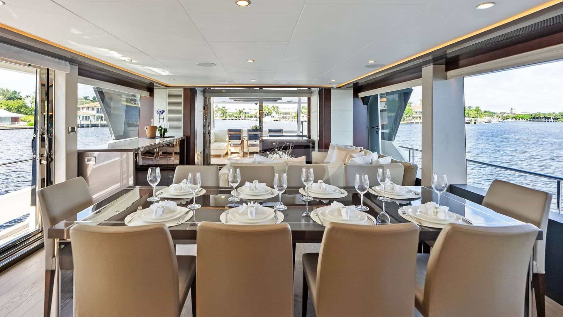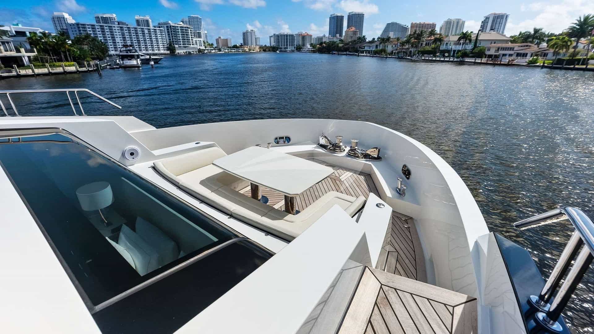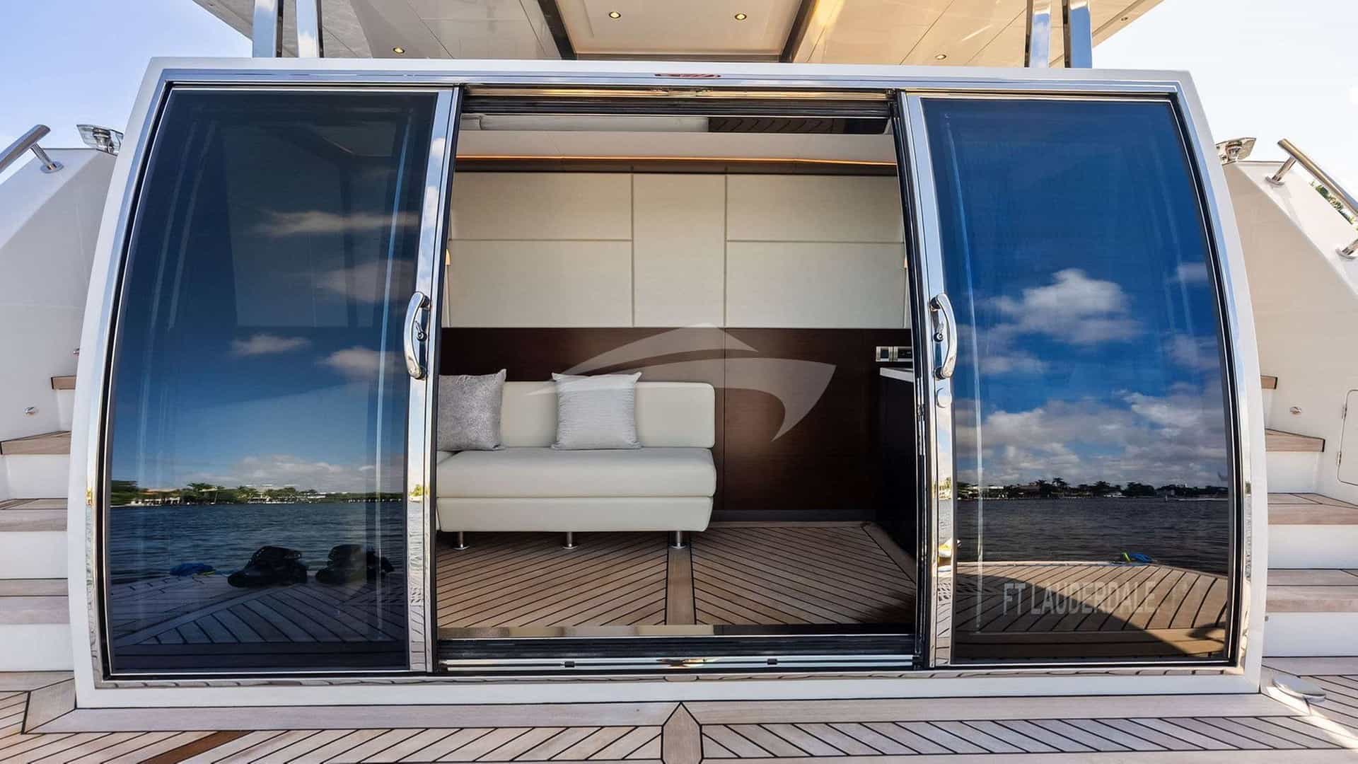 Las comodidades a bordo para los huéspedes del chárter incluyen aire acondicionado, barbacoa, ducha exterior, equipo de pesca ligero, gimnasio, sistema de audio interior, estación de conexión para iPod, jacuzzi en la cubierta, TV vía satélite, estabilizadores anclados, plataforma de baño, sala de televisión y Wi-Fi.