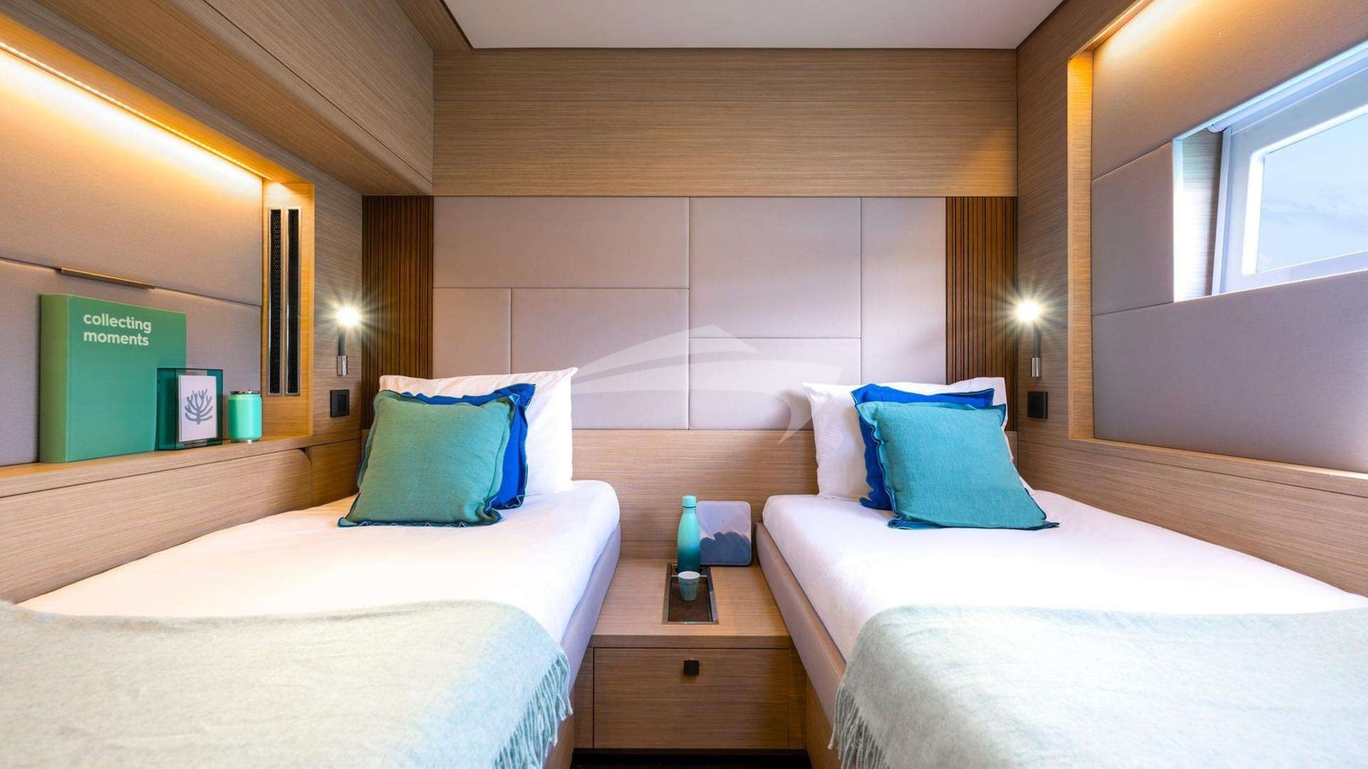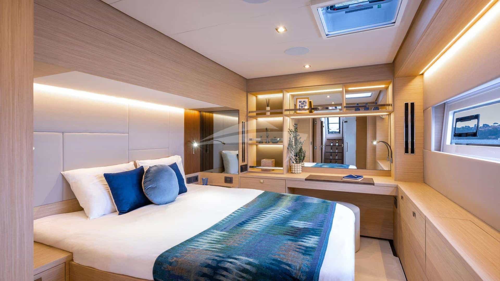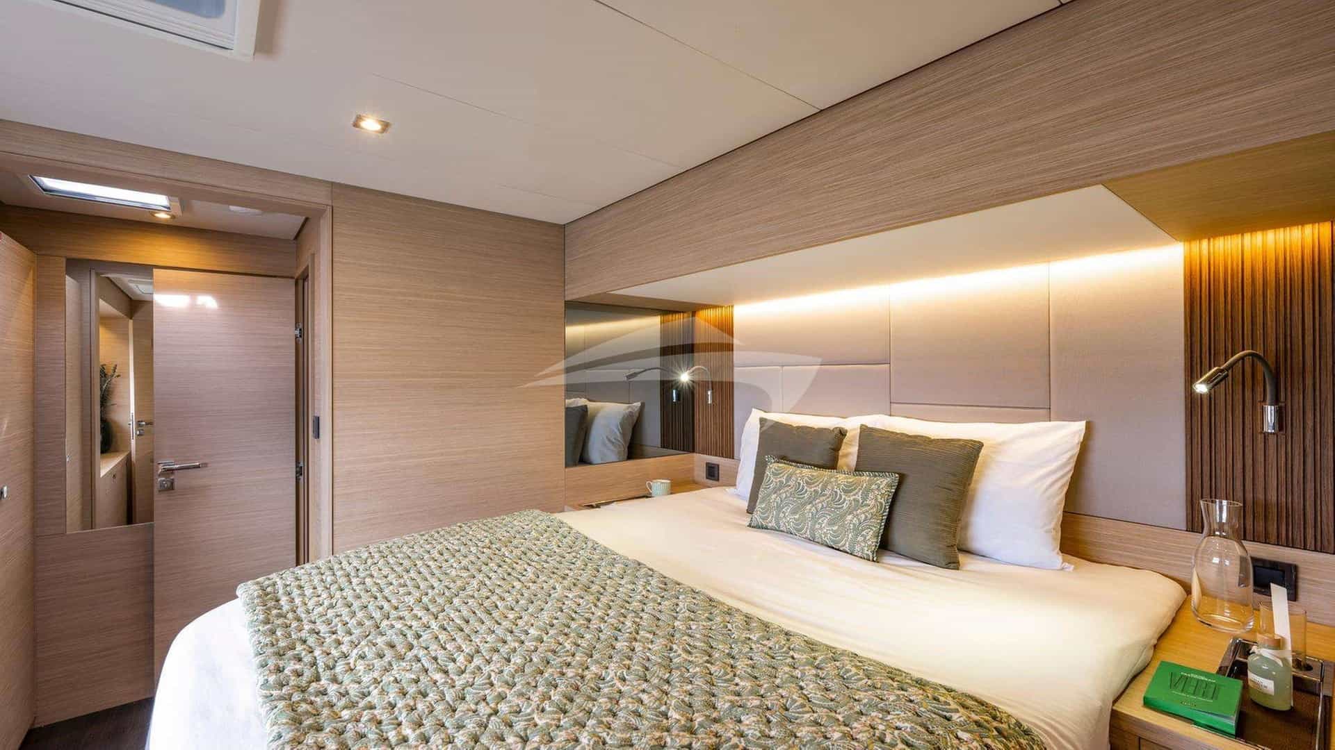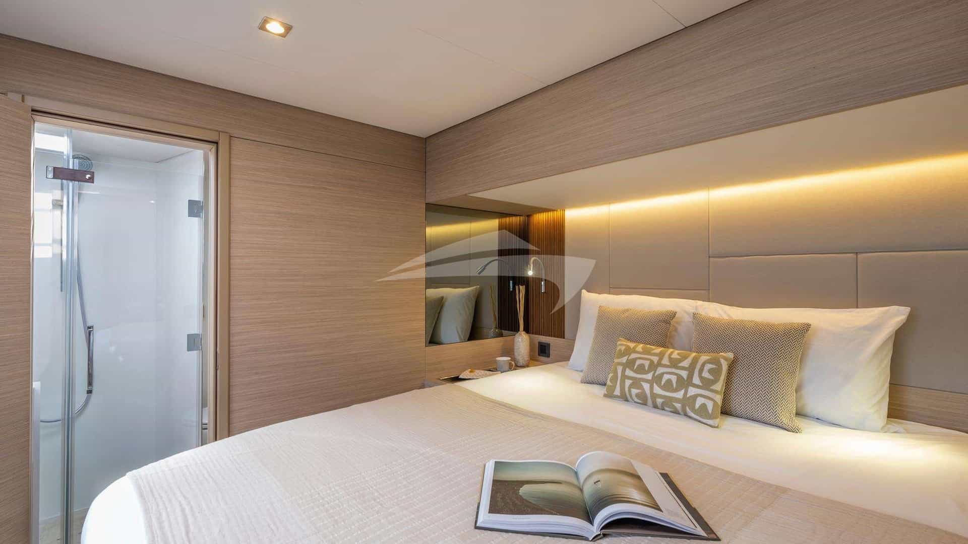 El GRACE 60 tiene capacidad para 8 personas en 4 camarotes que constan de una suite principal con cama queen size y baño privado y 3 camarotes con cama queen size y baño privado.