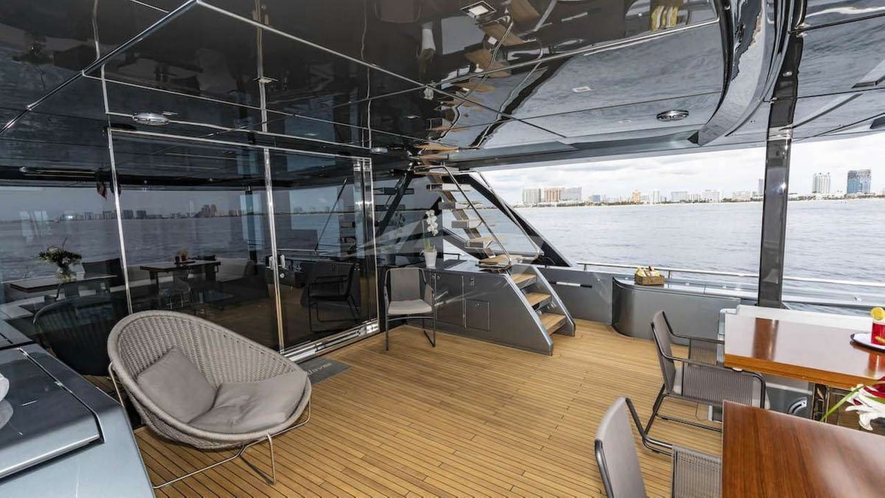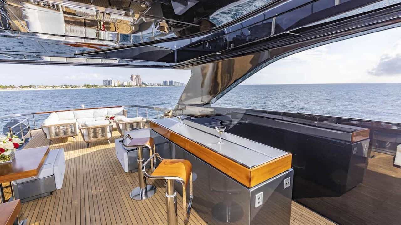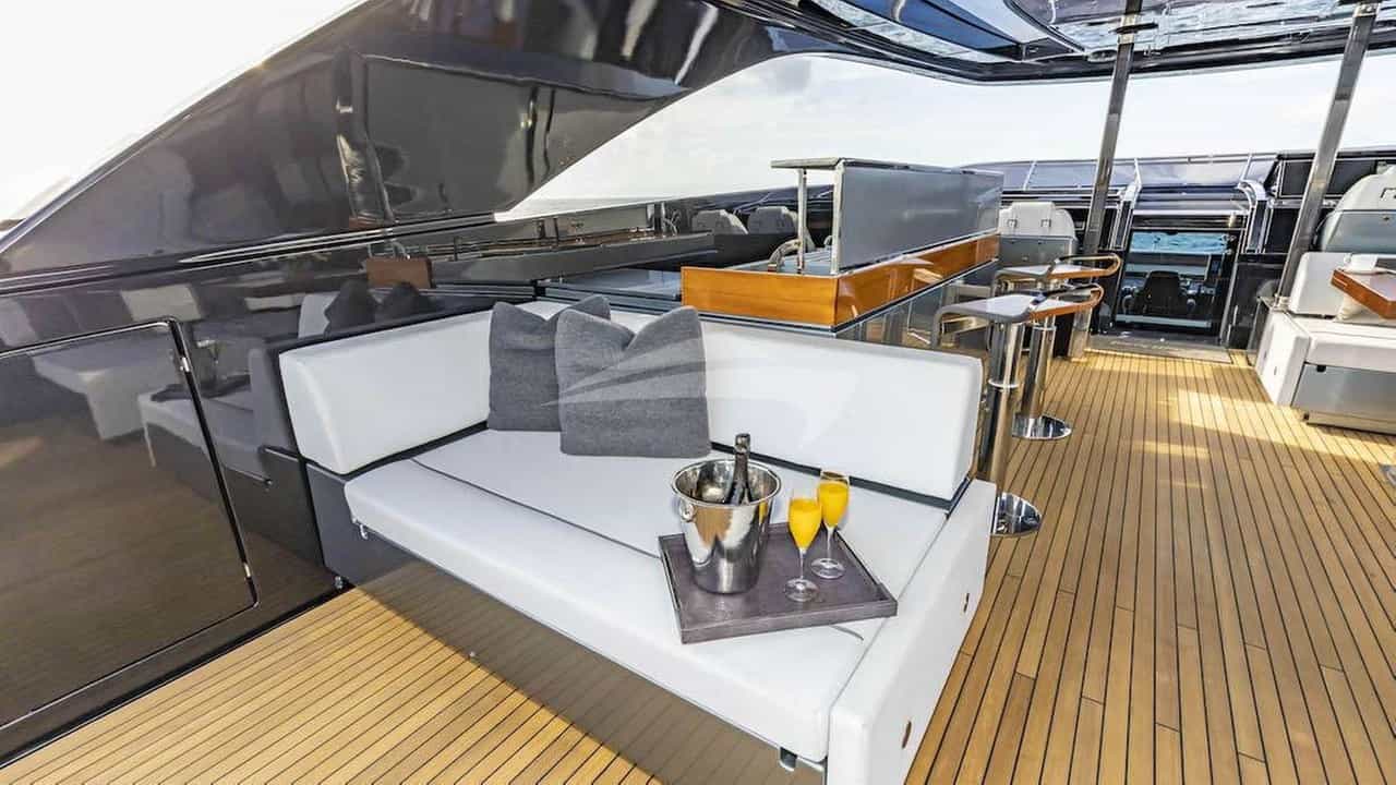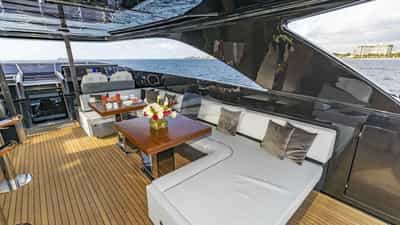 Las comodidades a bordo para los huéspedes del chárter incluyen aire acondicionado, barbacoa, ducha exterior, sistema de audio interior, estación de conexión para iPod, jacuzzi en la cubierta, TV vía satélite, estabilizadores anclados, plataforma de baño, salón de TV y Wi-Fi.